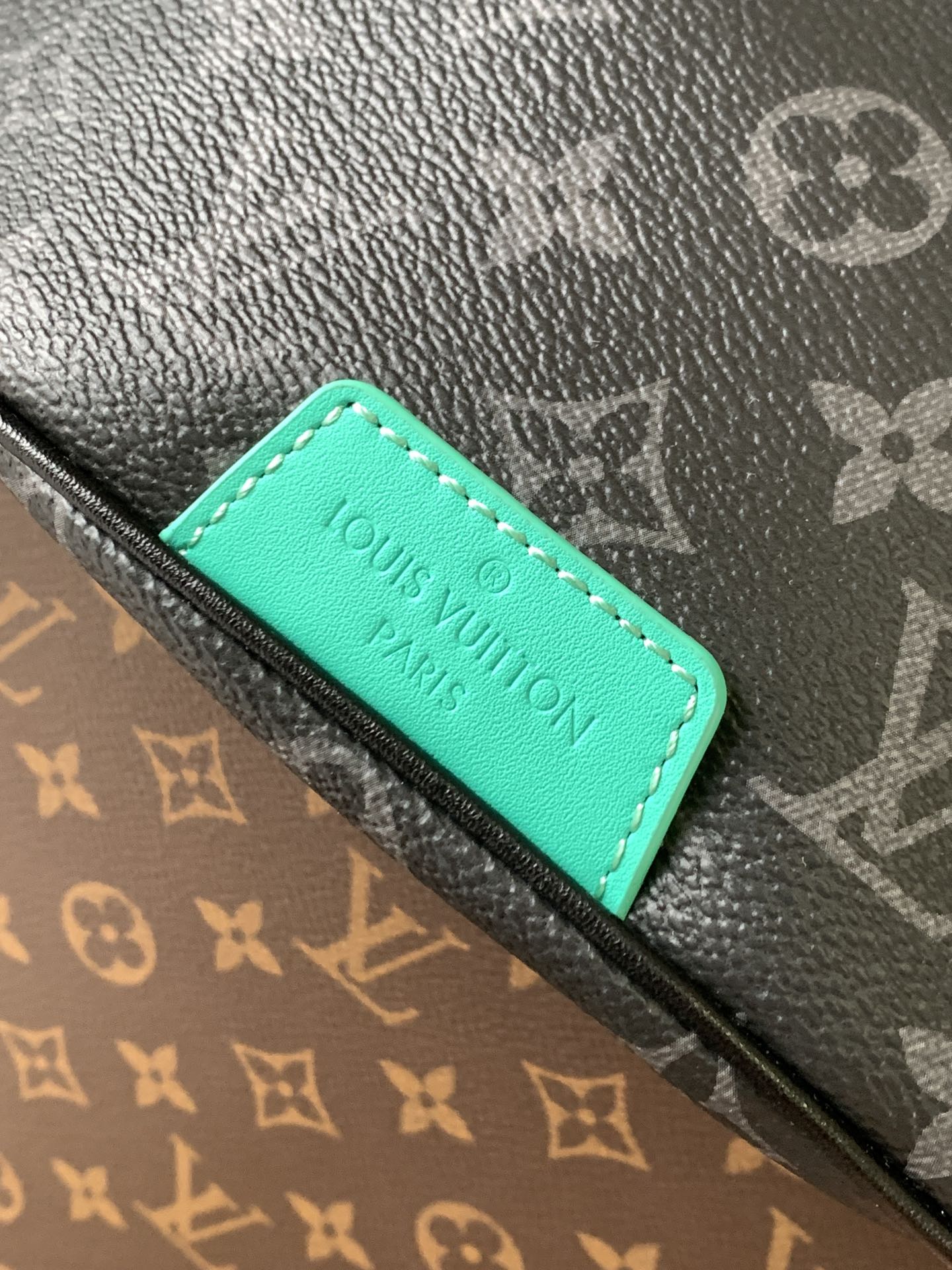 LV 25S DISCOVERY BUMBAG 44 IN BLACK AQUA MONOGRAM ECLIPSE CANVAS AND CALFSKIN