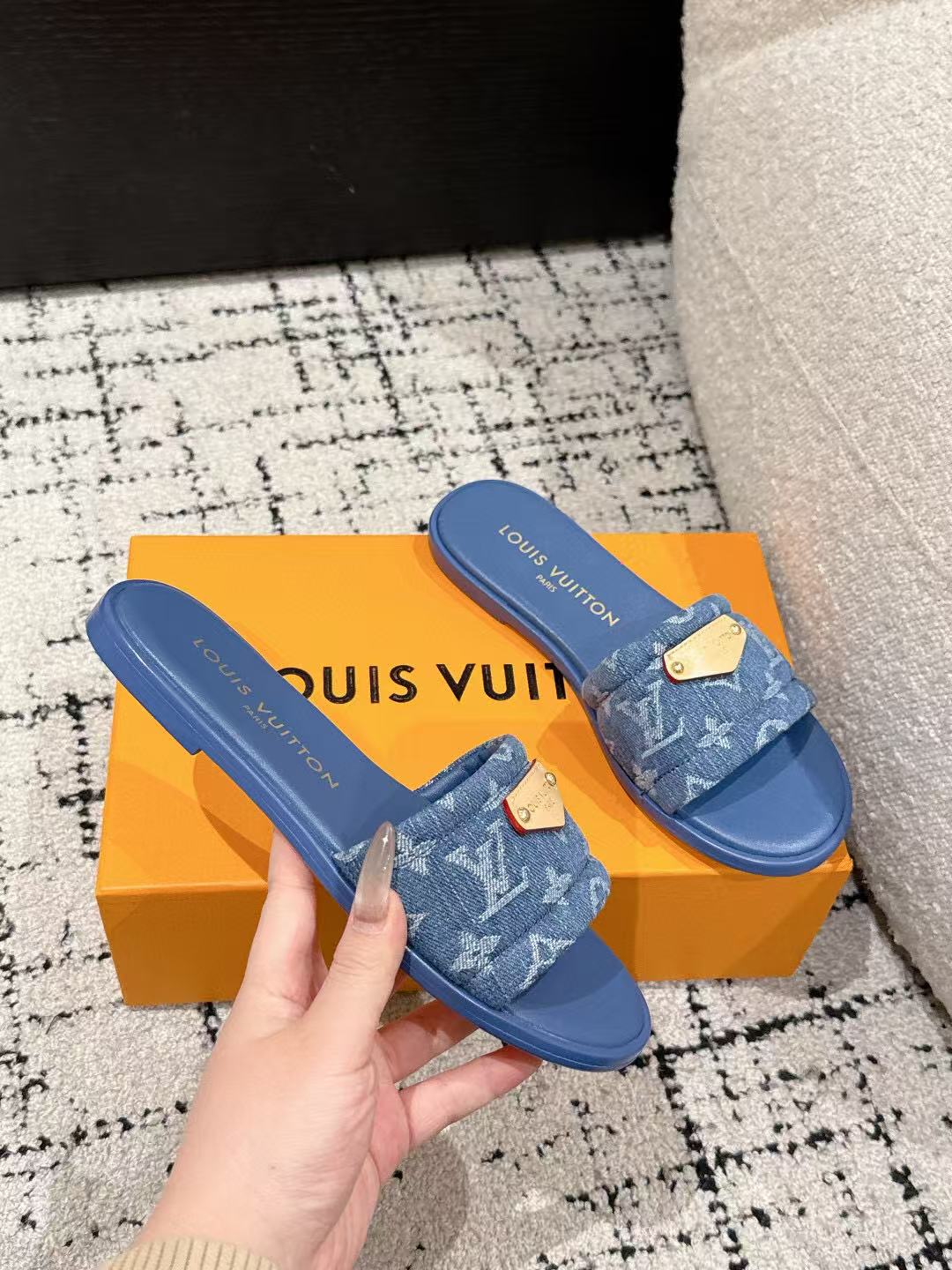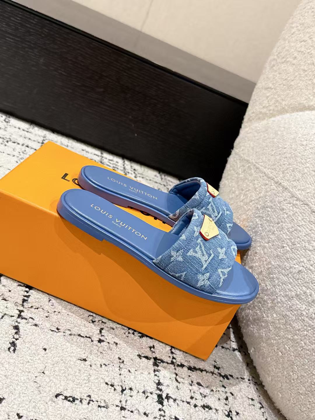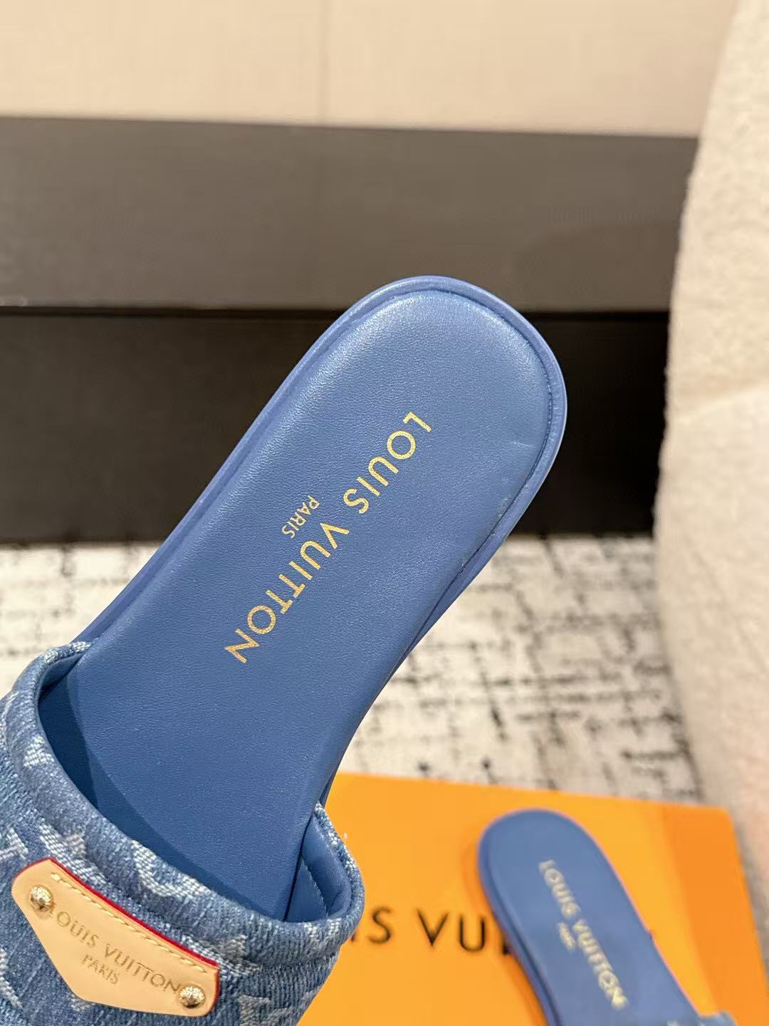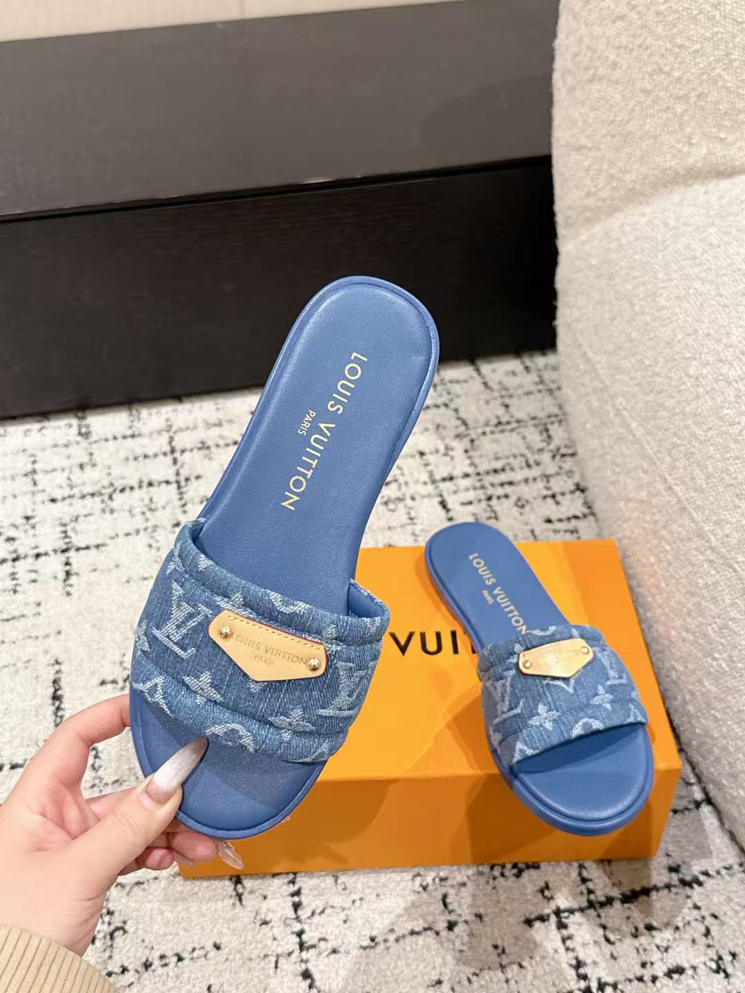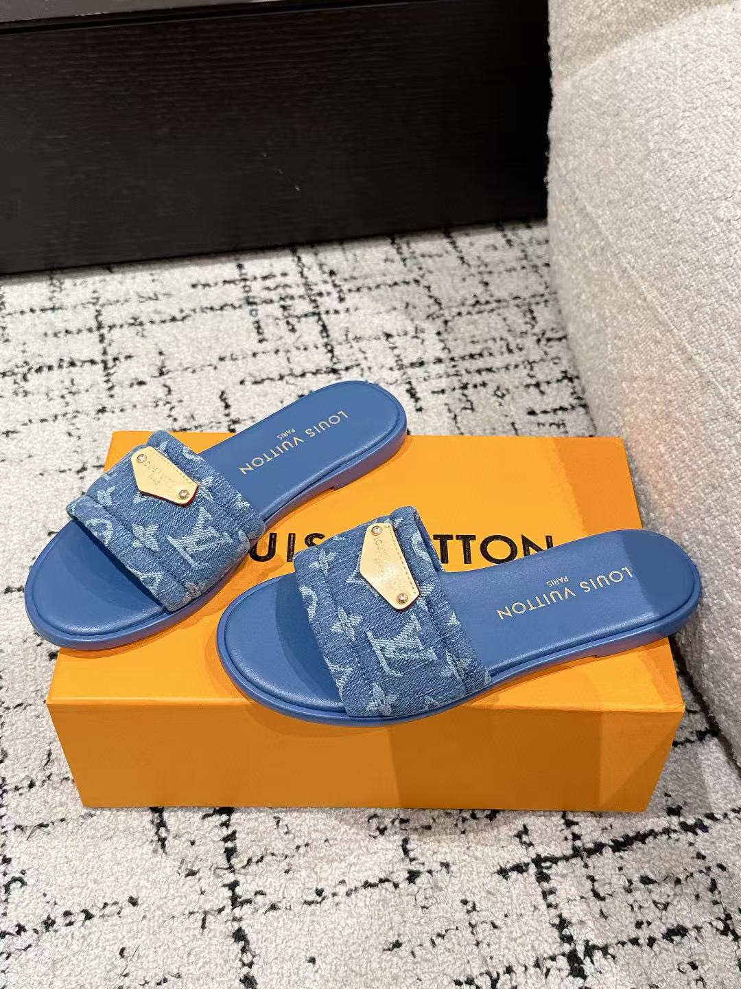 LV FLAT MULES BLUE IN BLUE DENIM GOLD-TONE PLAQUE