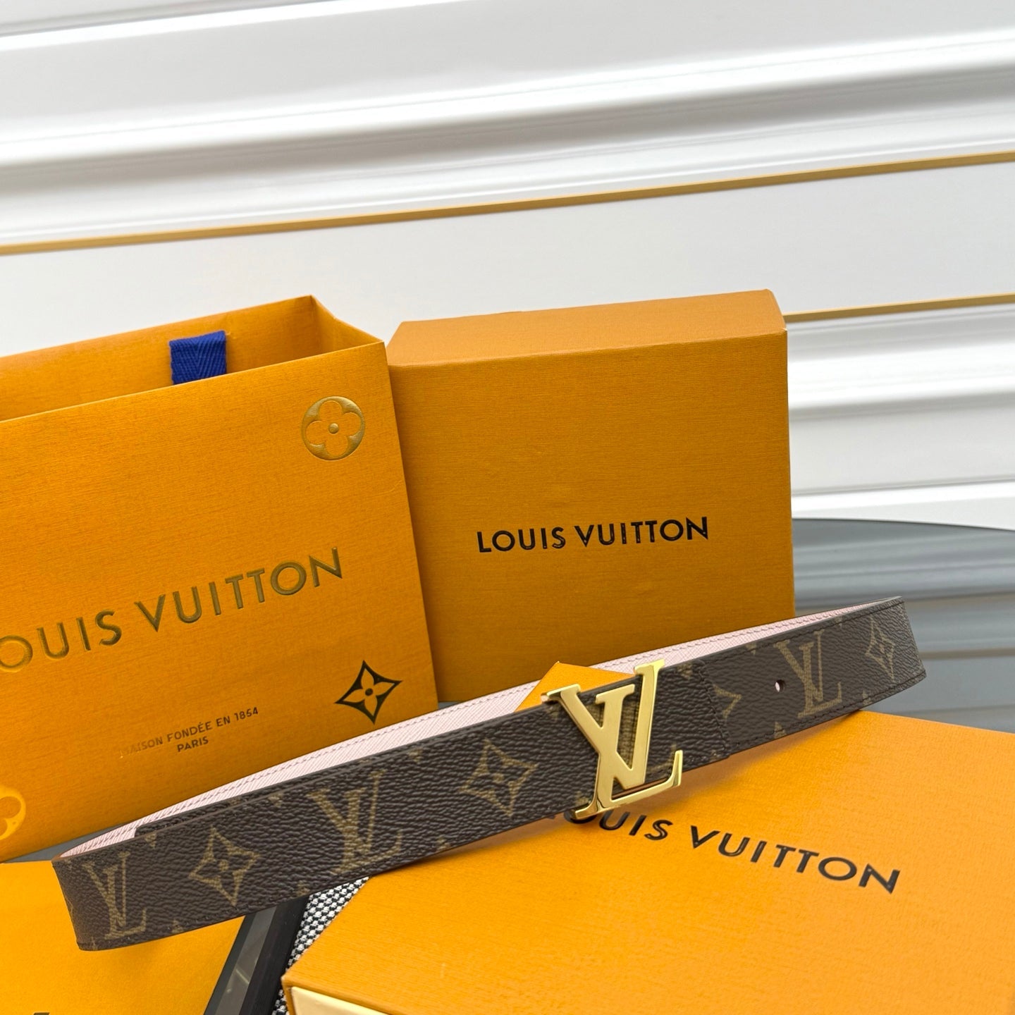 LV INITIALES BELT REVERSIBLE 30MM IN BROWN AND LIGHT PINK GRAINED CALFSKIN GOLD BUCKLE