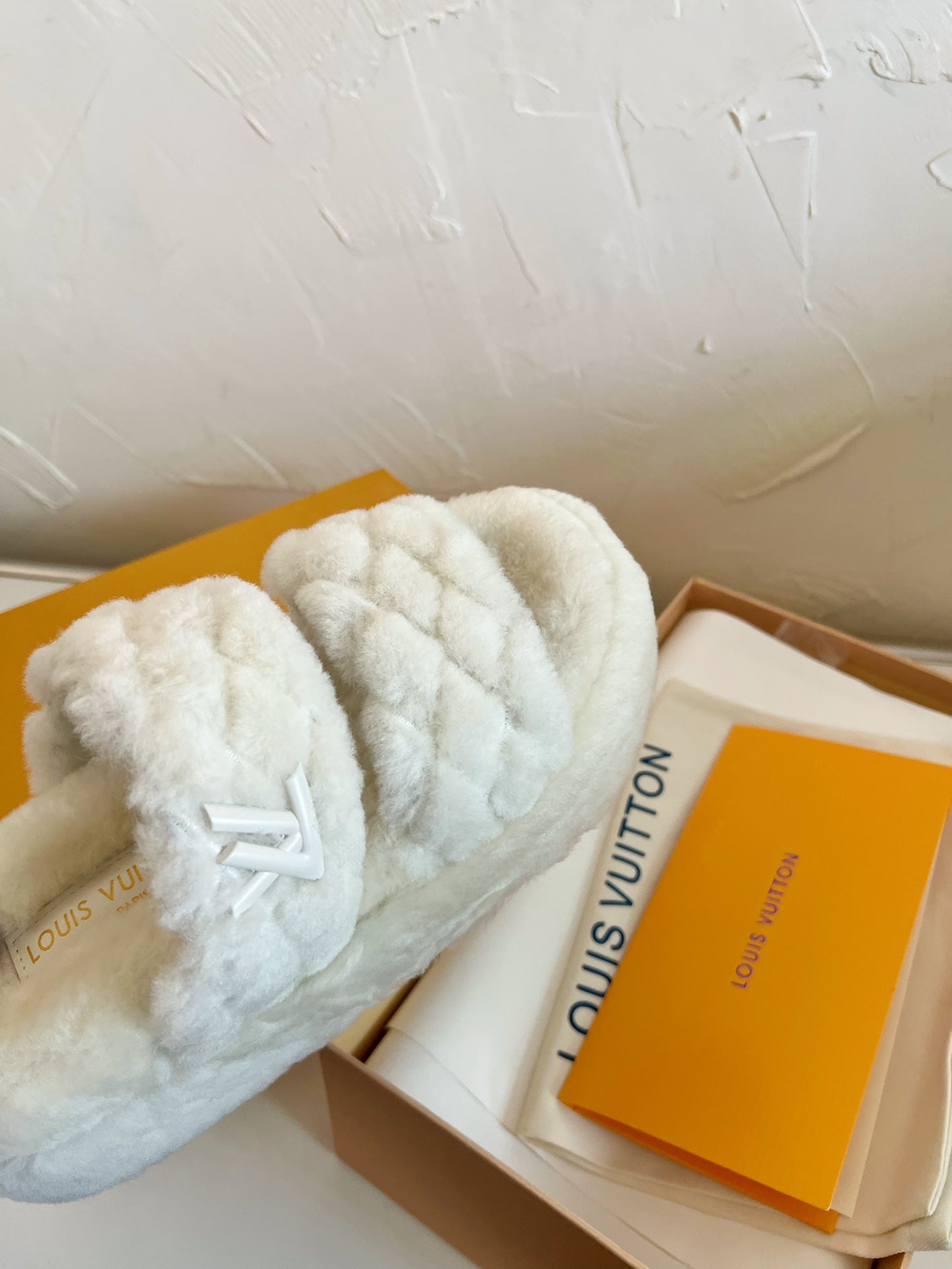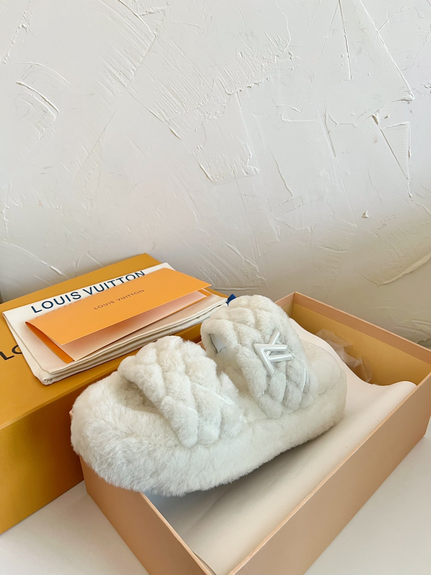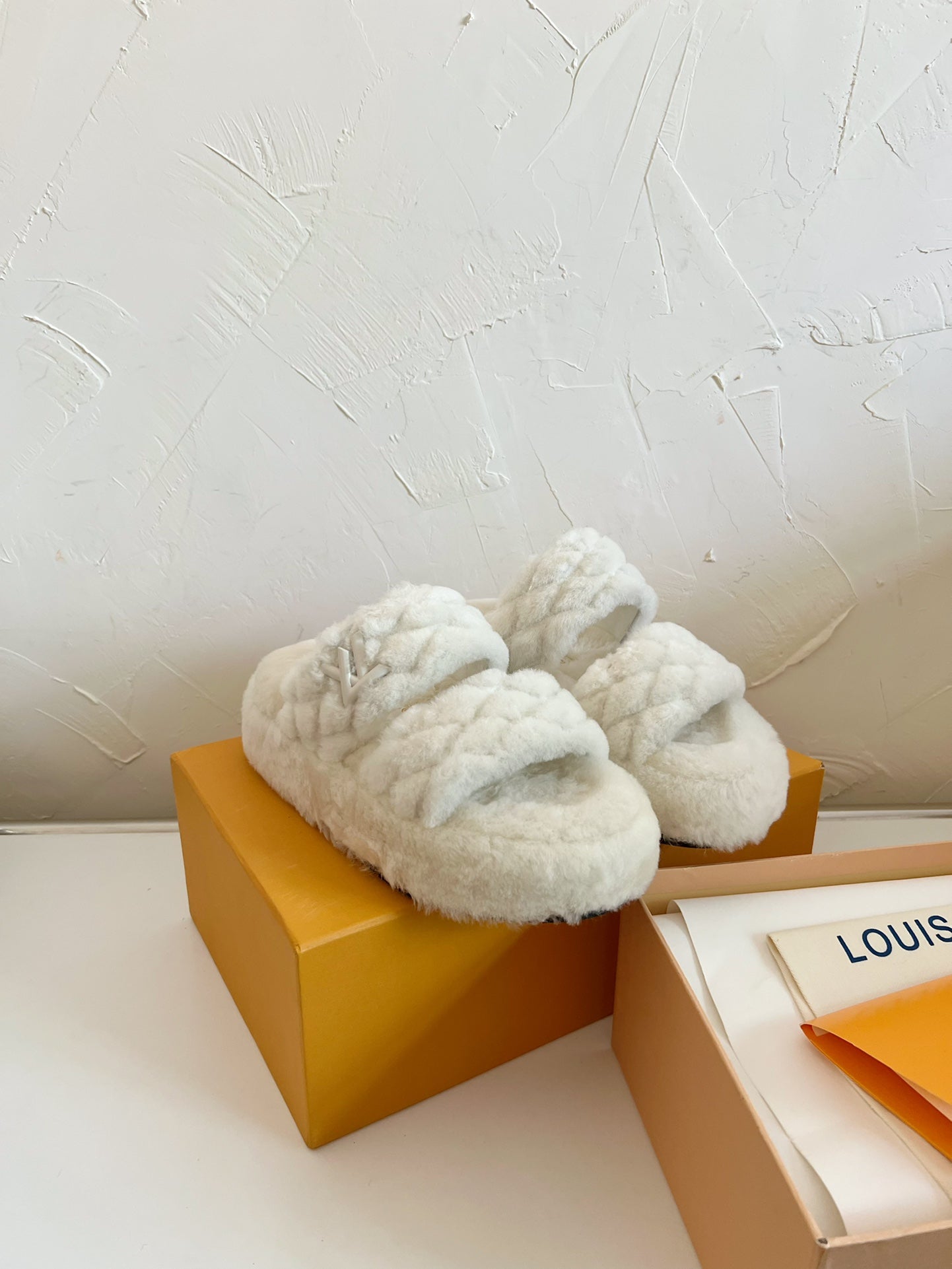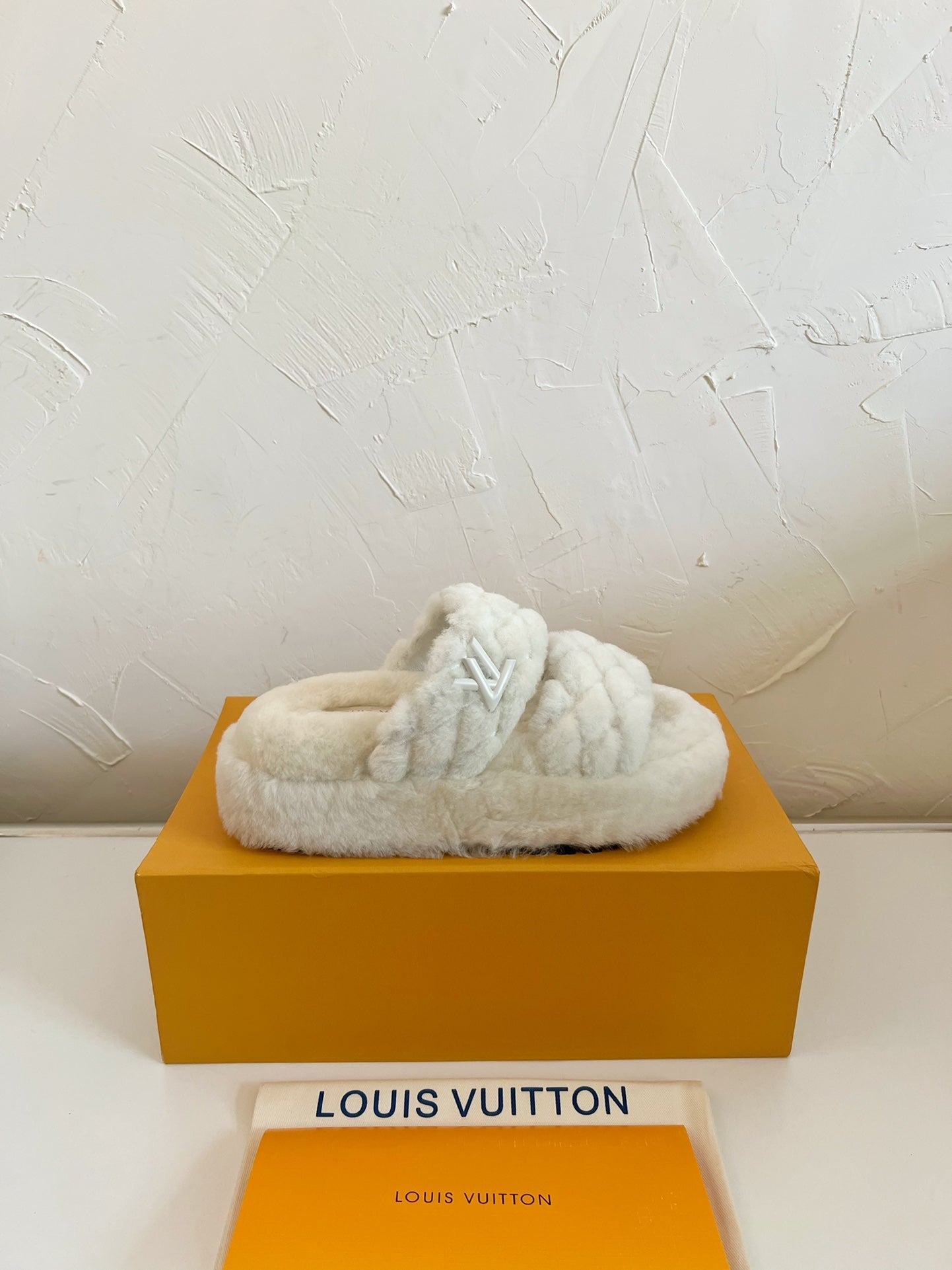 LV SUNSET PLATFORM COMFORT MULE IN WHITE SHEARLING