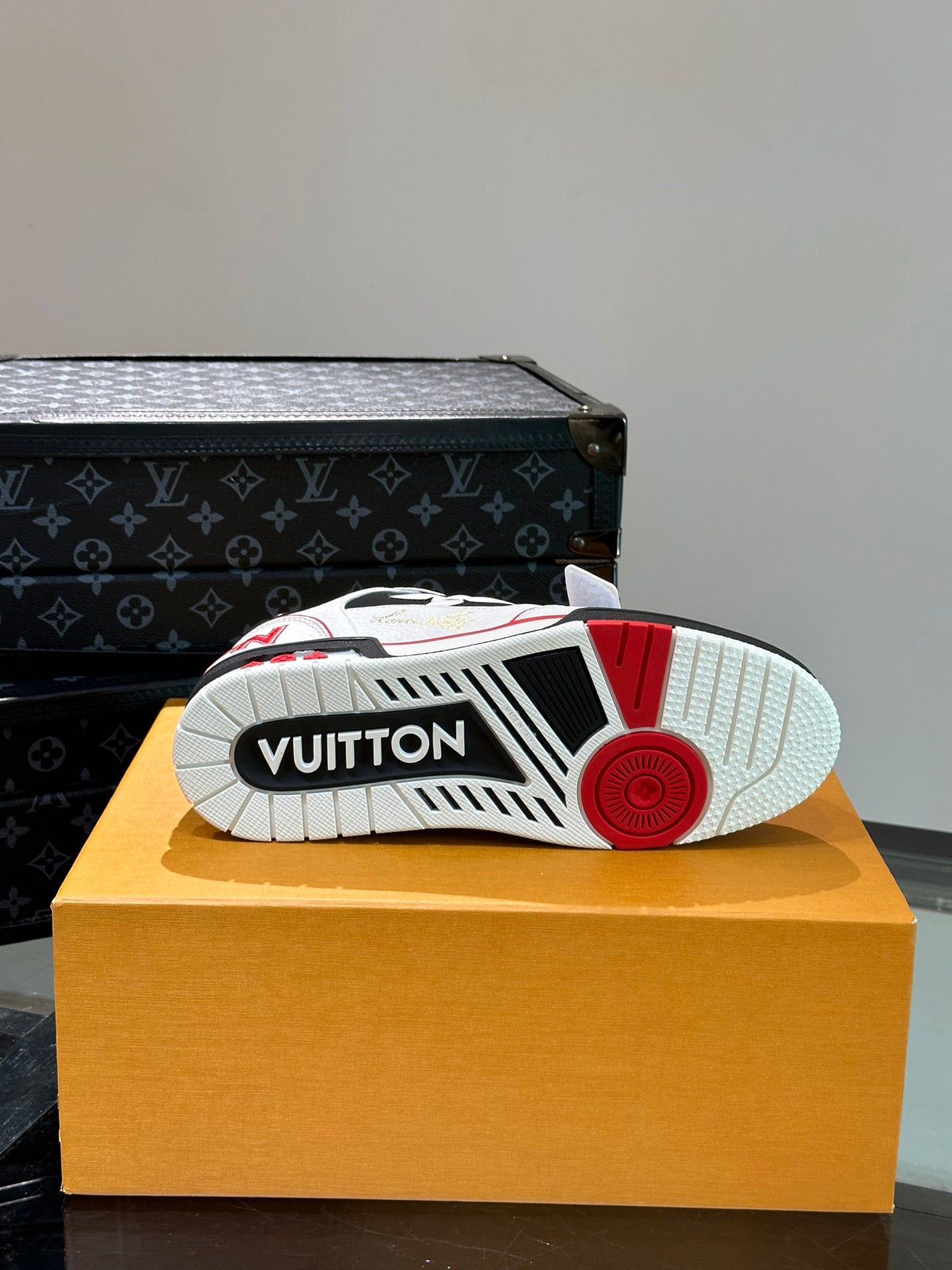 LV TRAINER SNEAKERS IN WHITE CALFSKIN AND BLACK MIX RED SUEDE