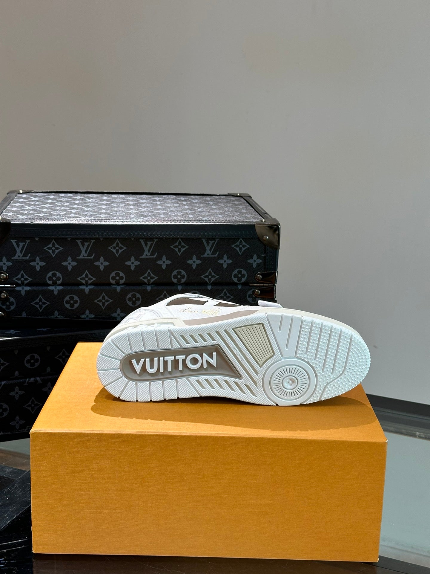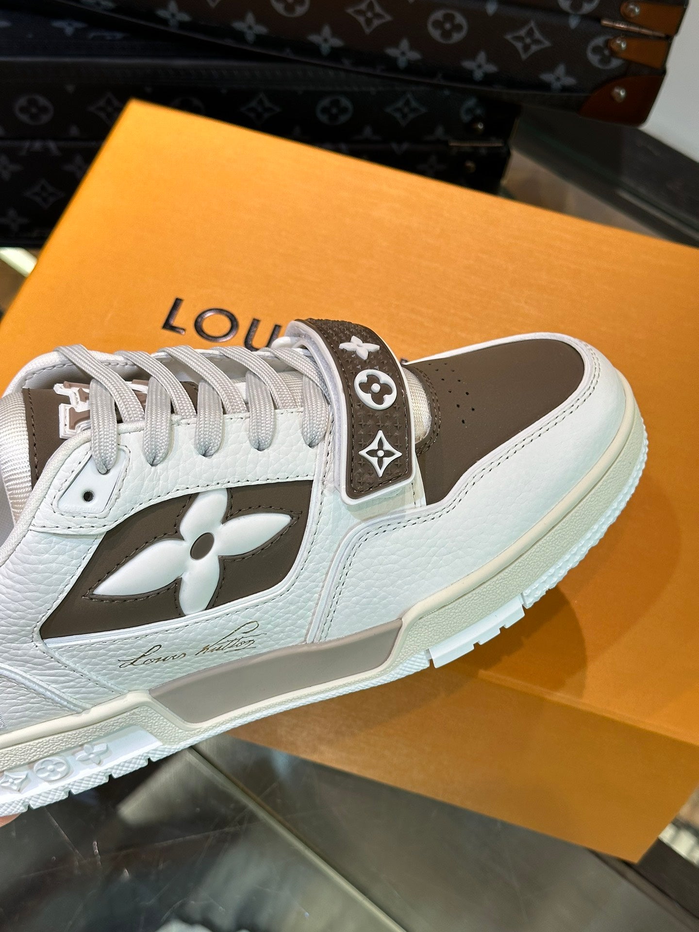 LV TRAINER SNEAKERS IN WHITE CALFSKIN AND MOCHA BROWN SUEDE
