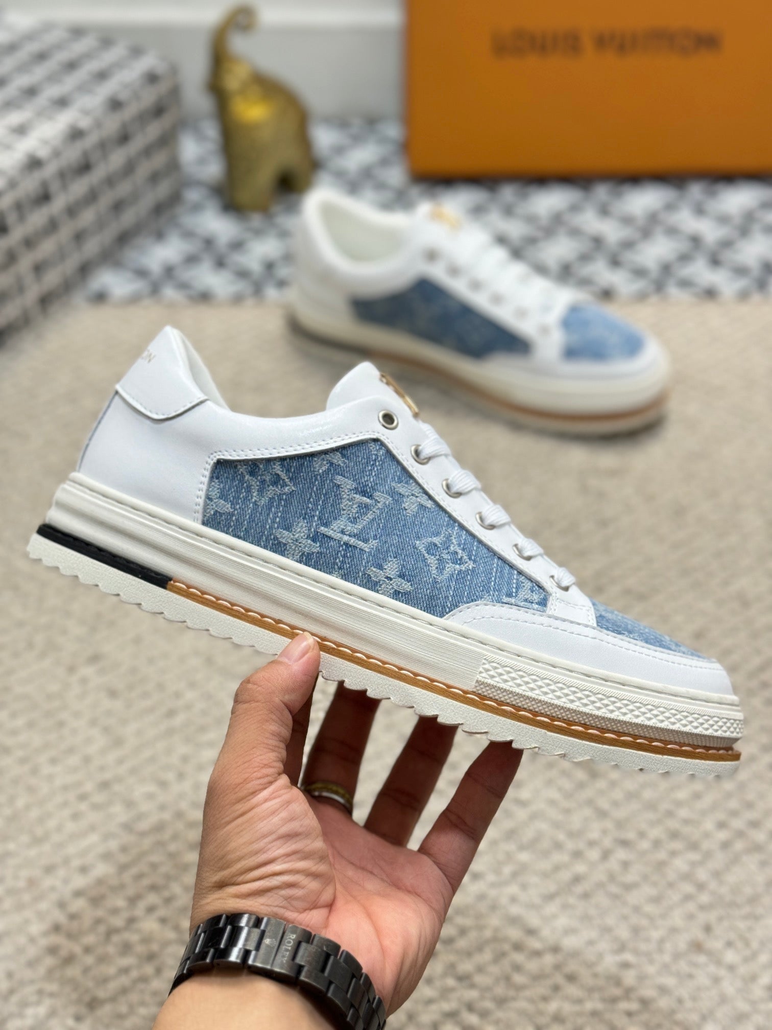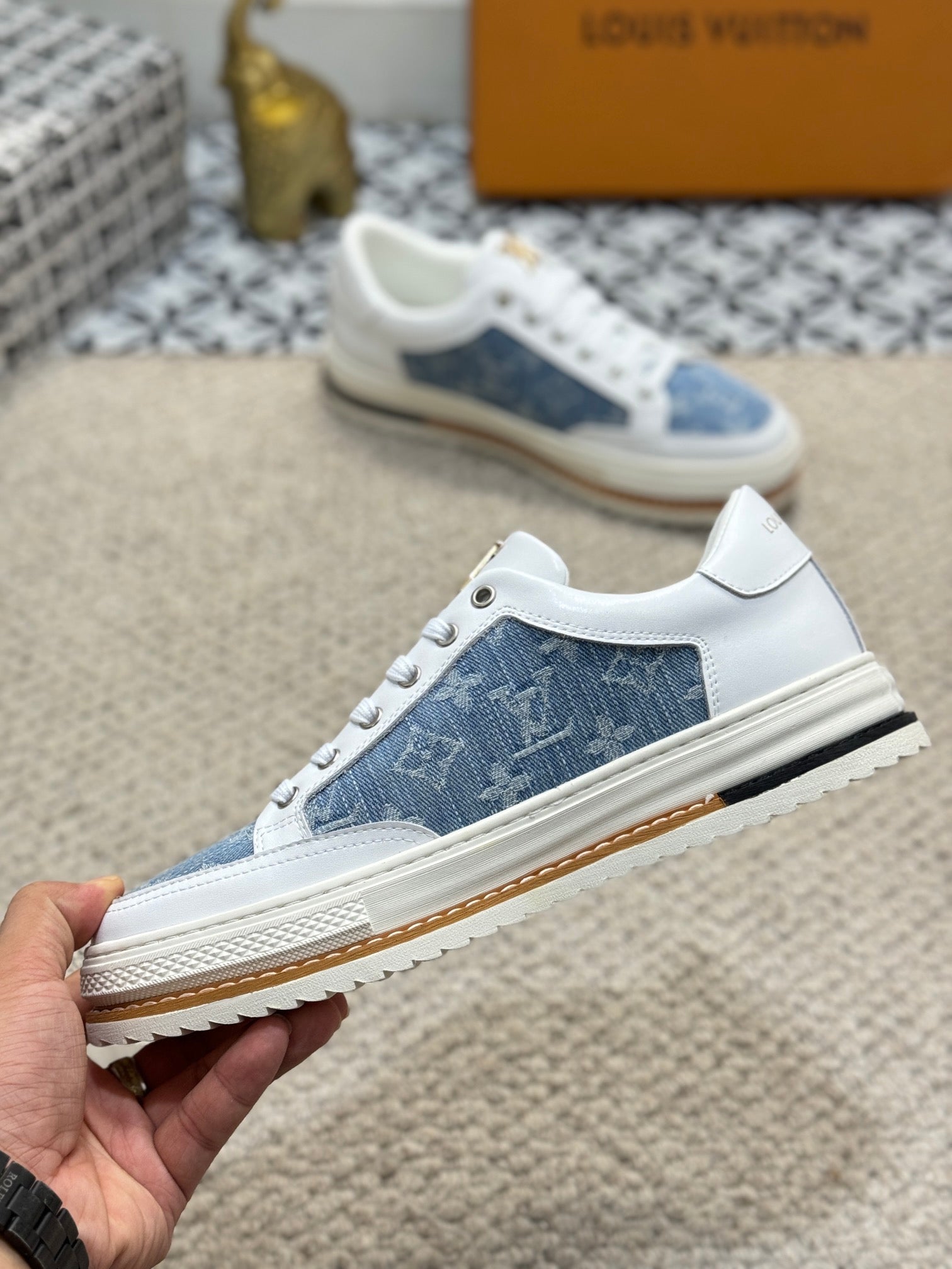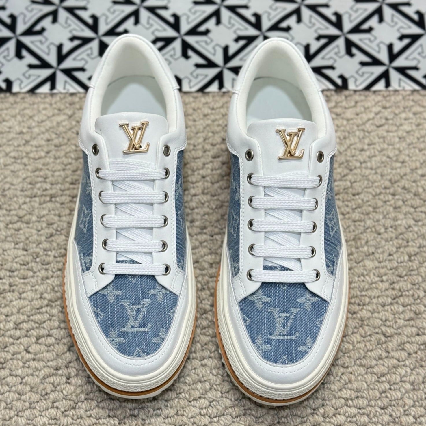 LV TRAINERS IN WHITE CALFSKIN AND SAPPHIRE BLUE JACQUARD