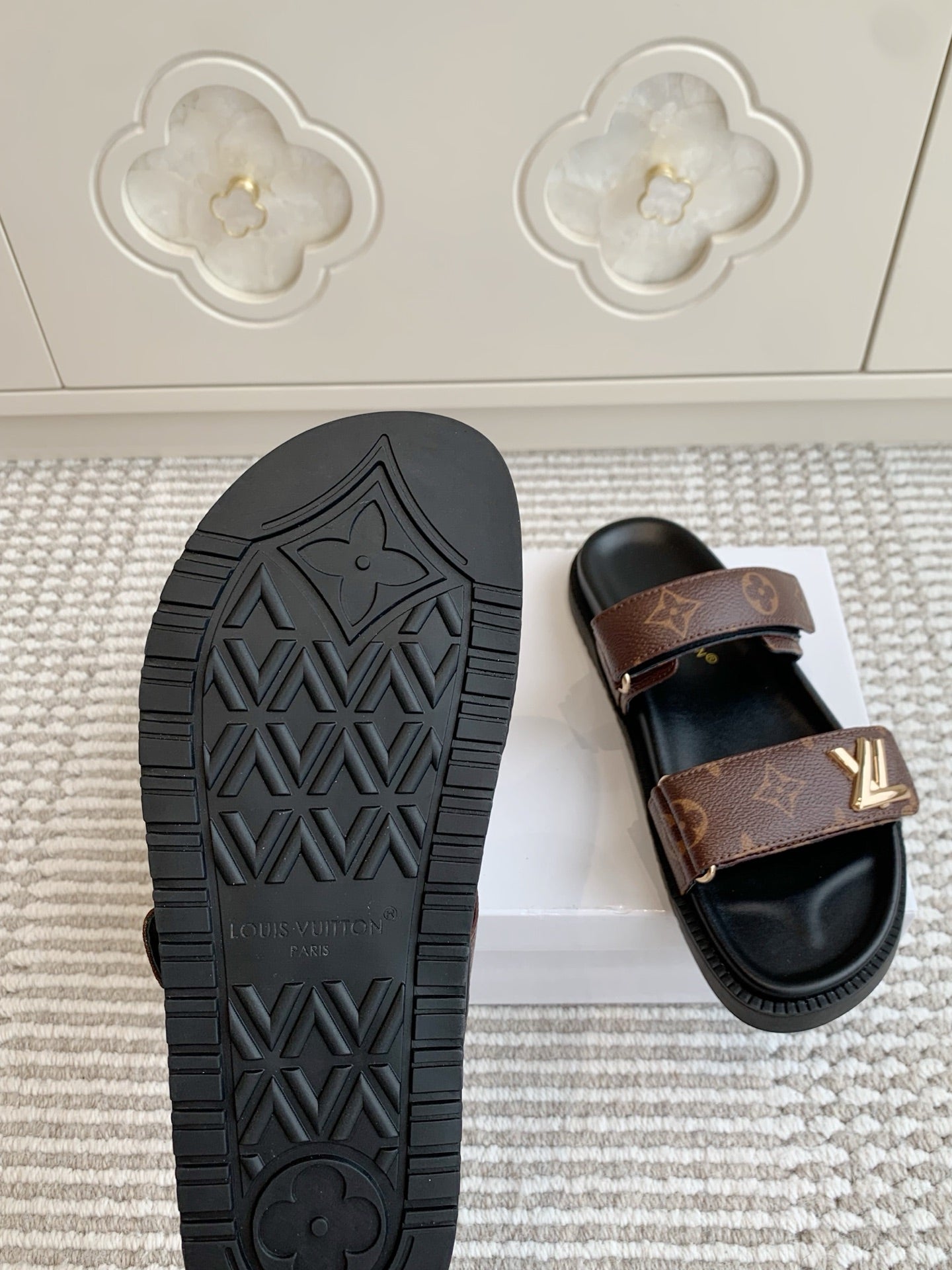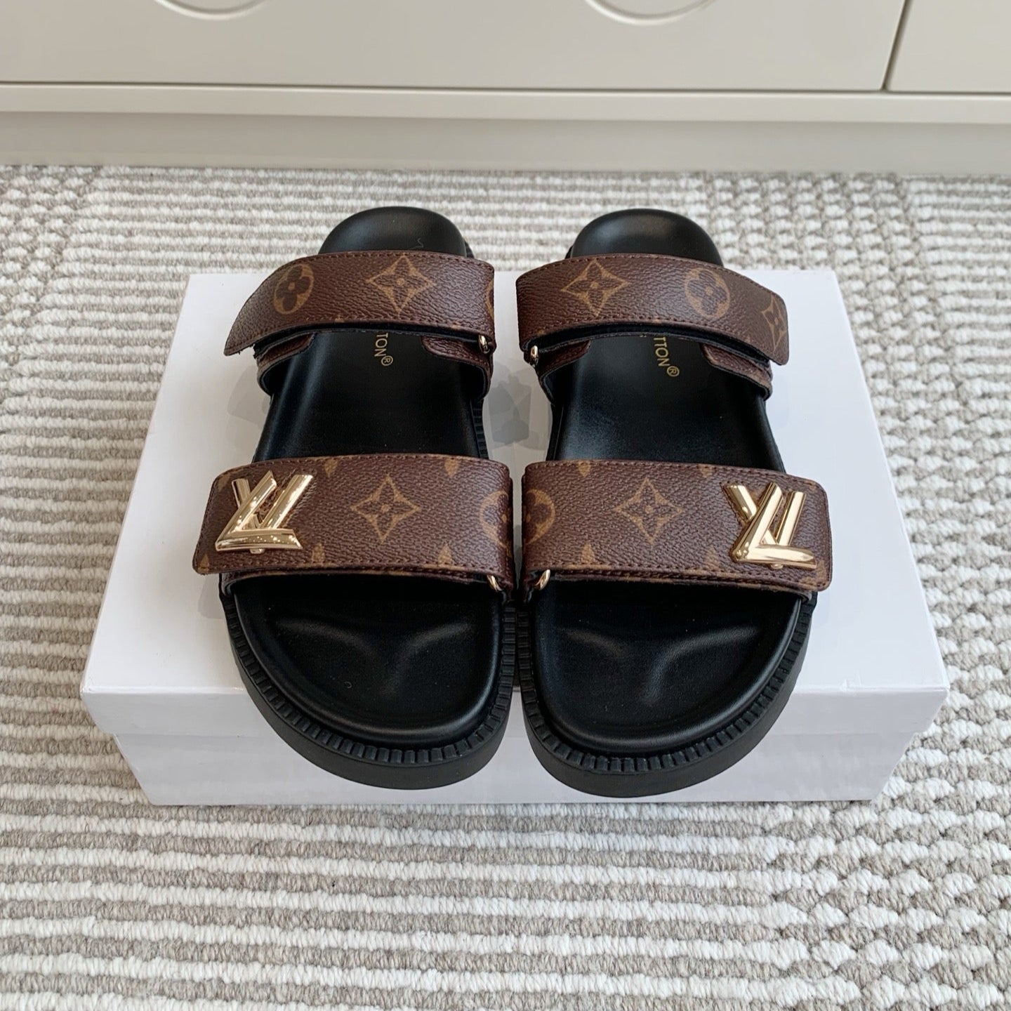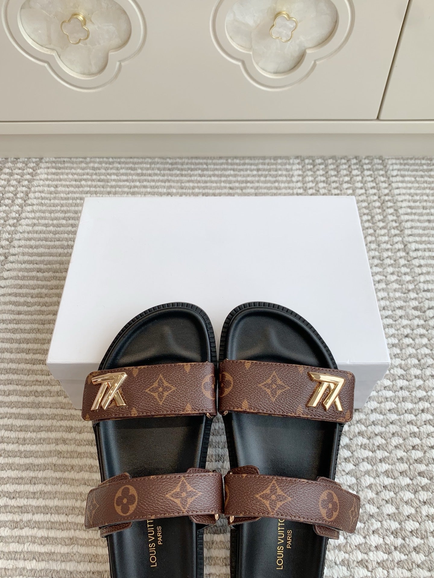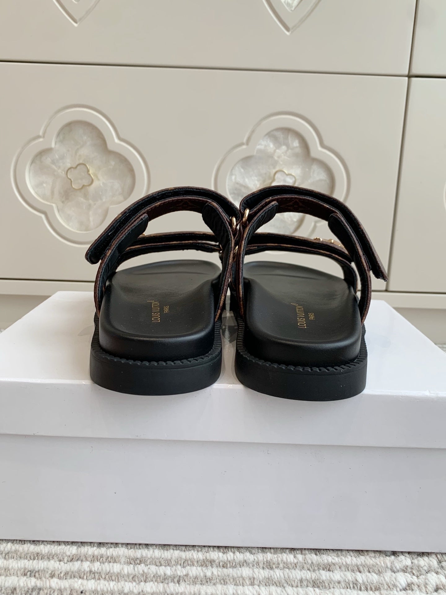 LV TWO-STRAP SANDALS 25S IN BROWN MIX BLACK CALFSKIN WITH GOLD HARDWARE