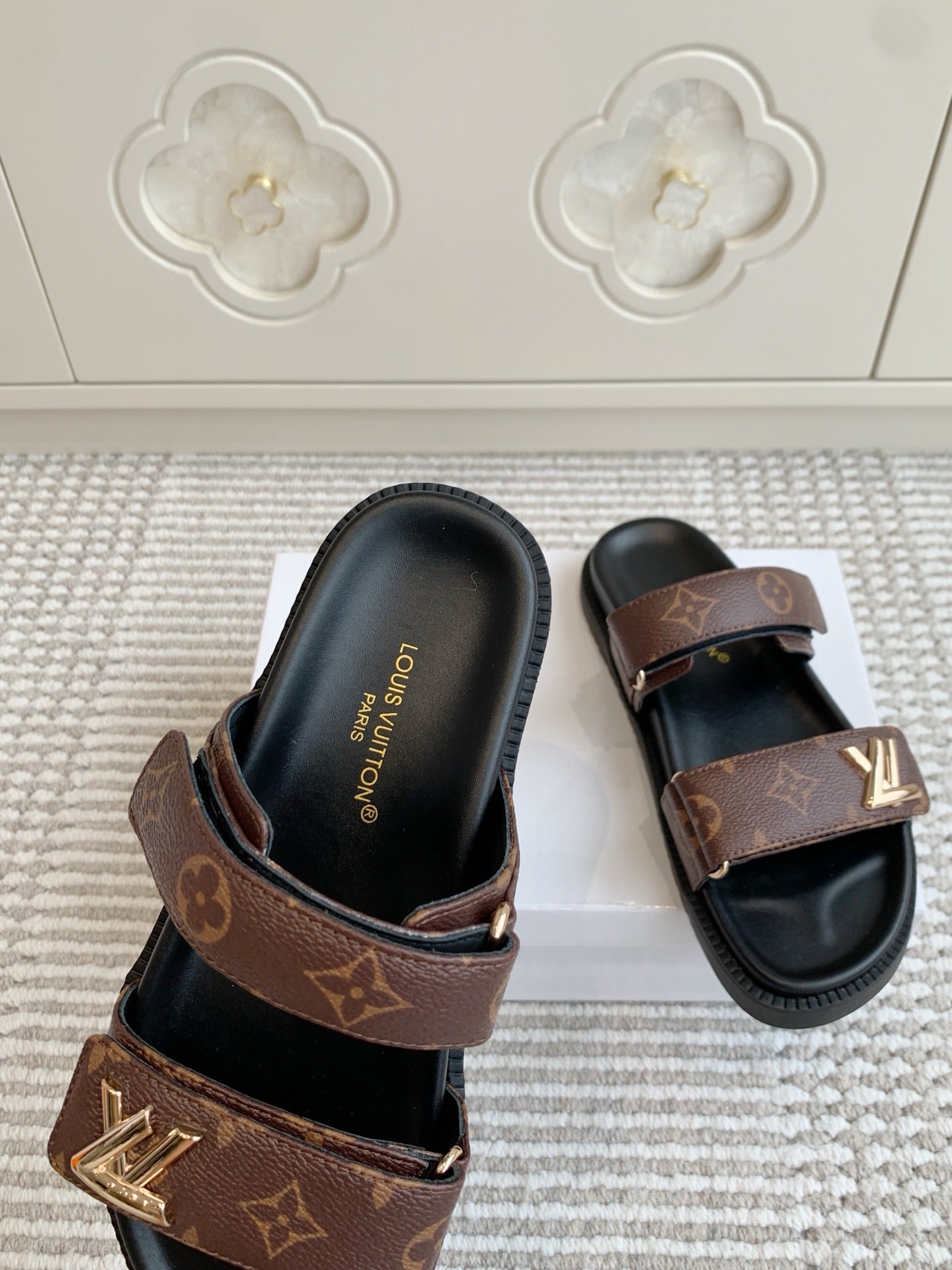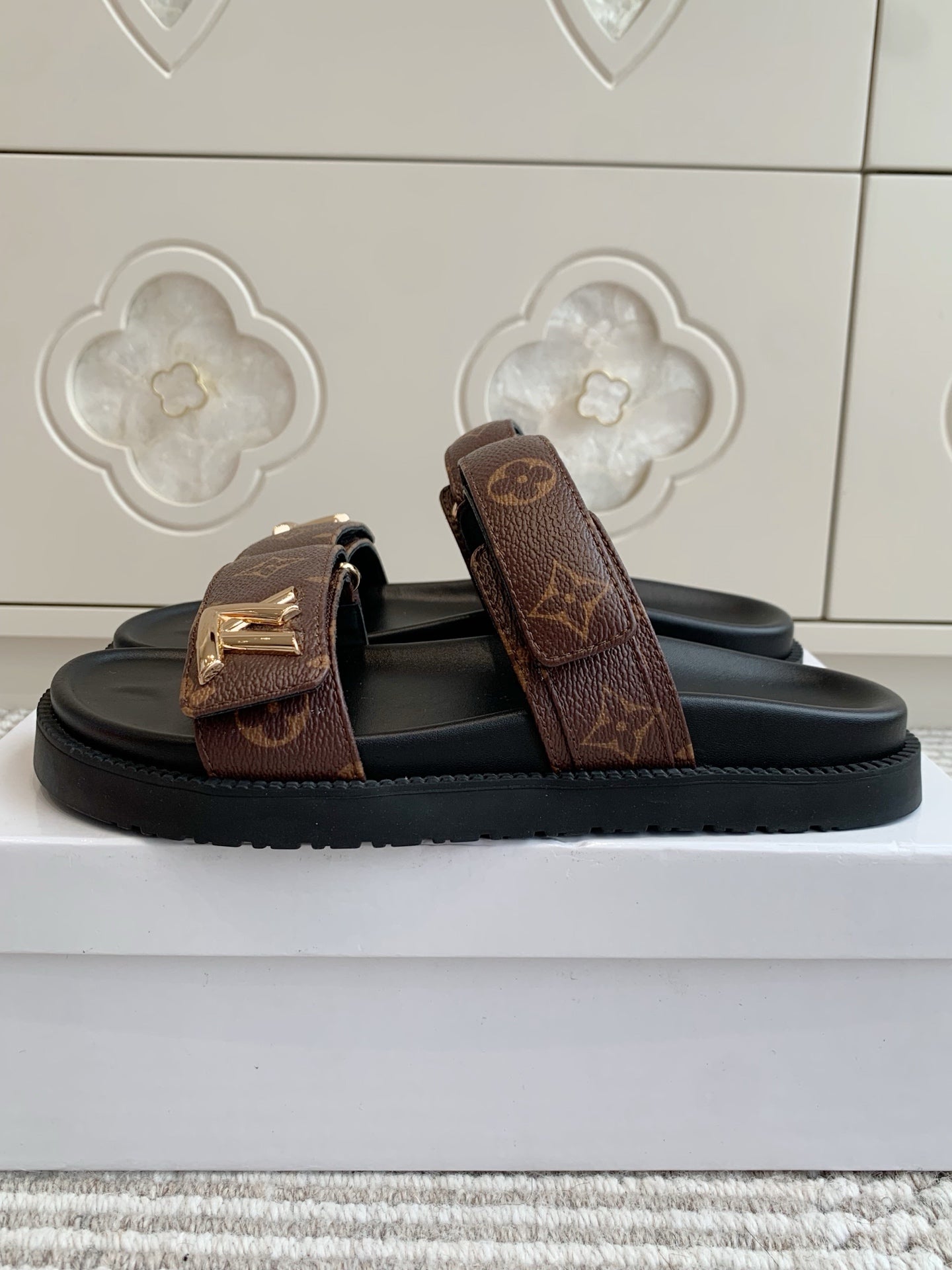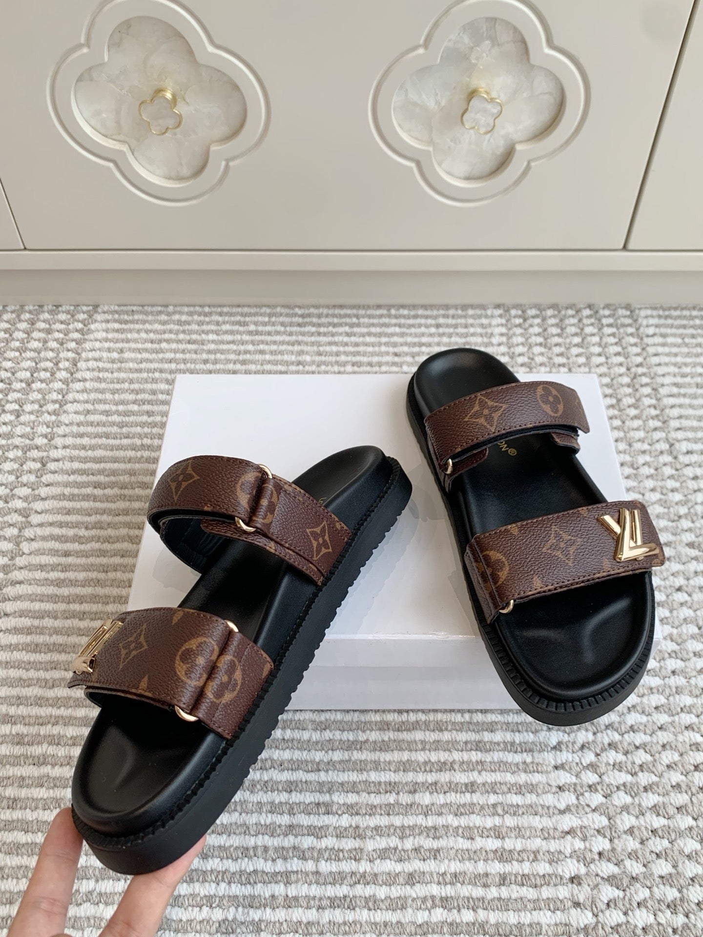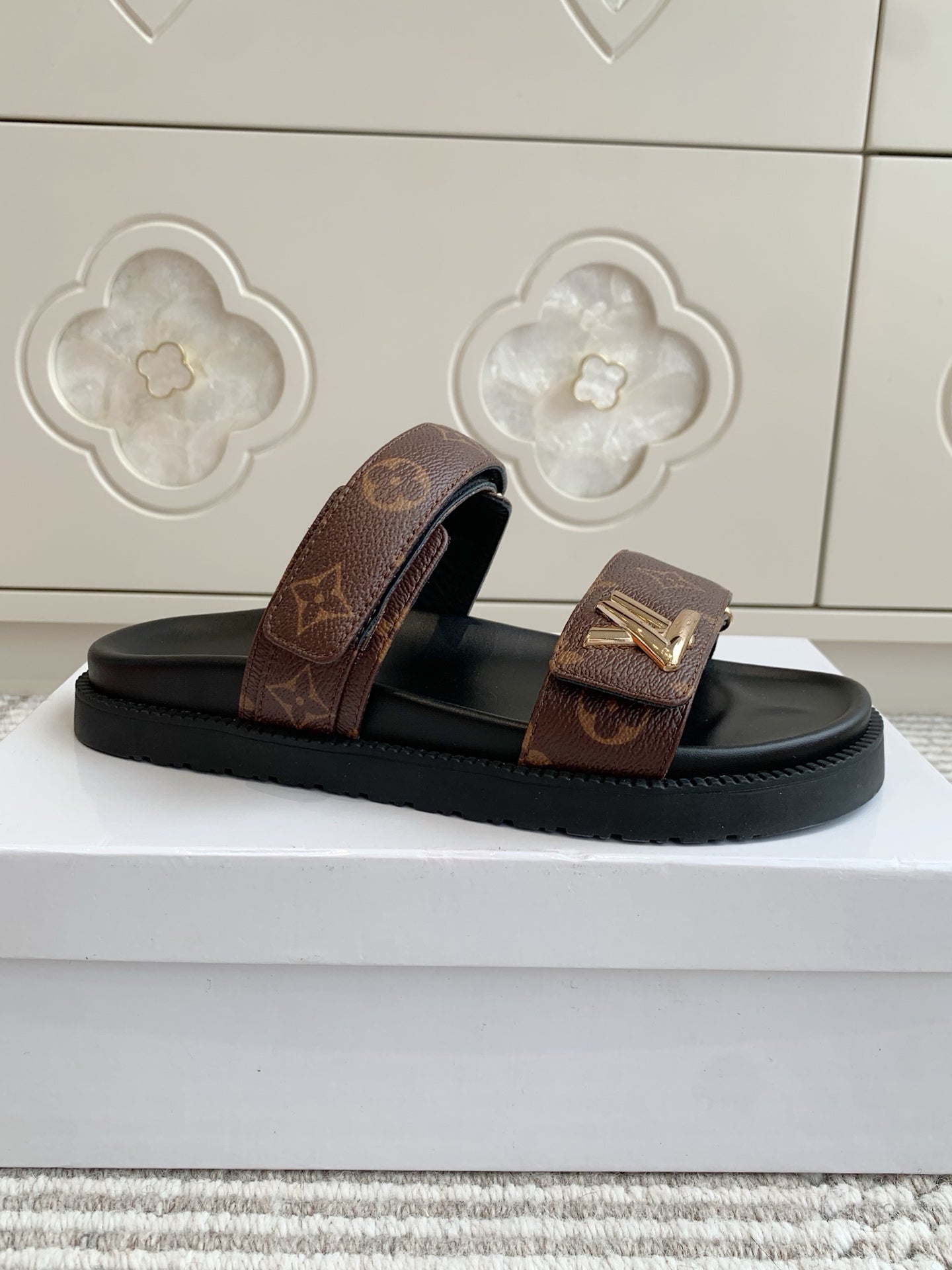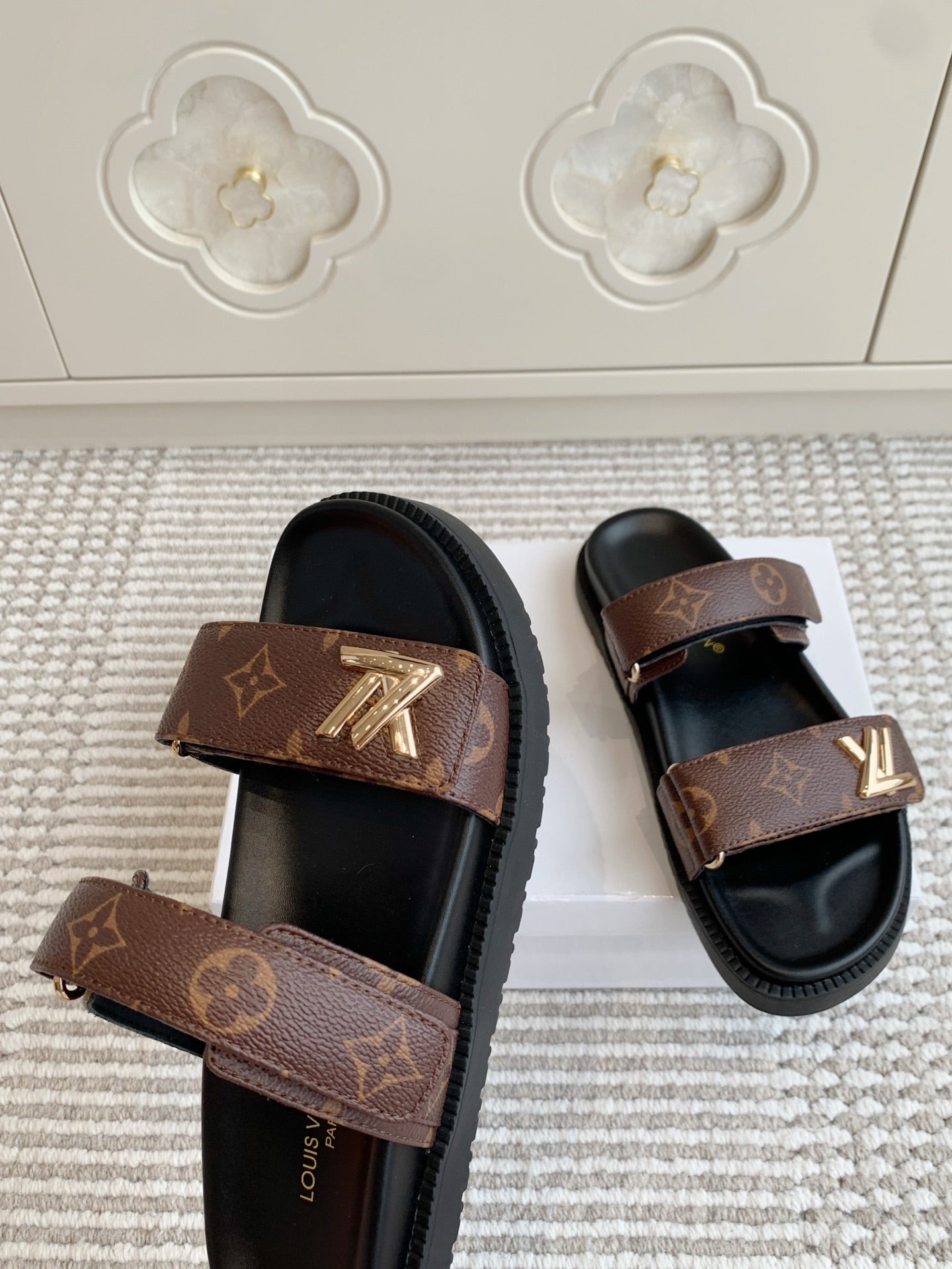 LV TWO-STRAP SANDALS 25S IN BROWN MIX BLACK CALFSKIN WITH GOLD HARDWARE