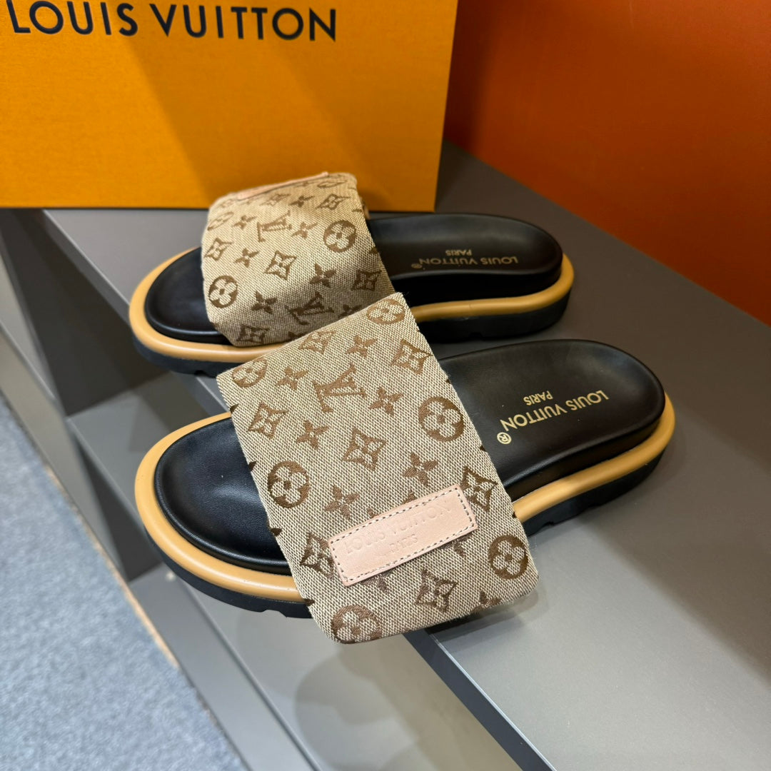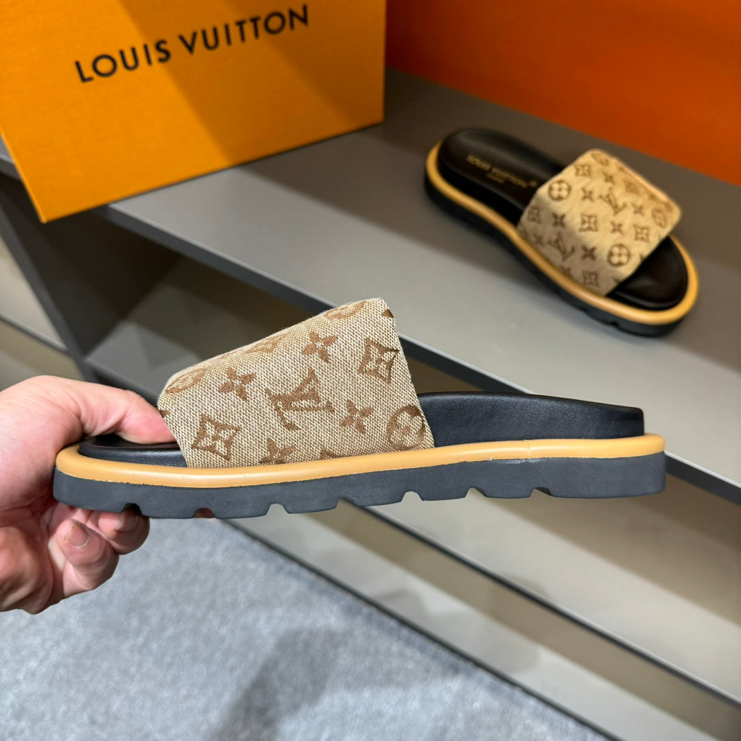 LV VELCRO SLIPPERS IN PEANUT BROWN MONOGRAM JACQUARD
