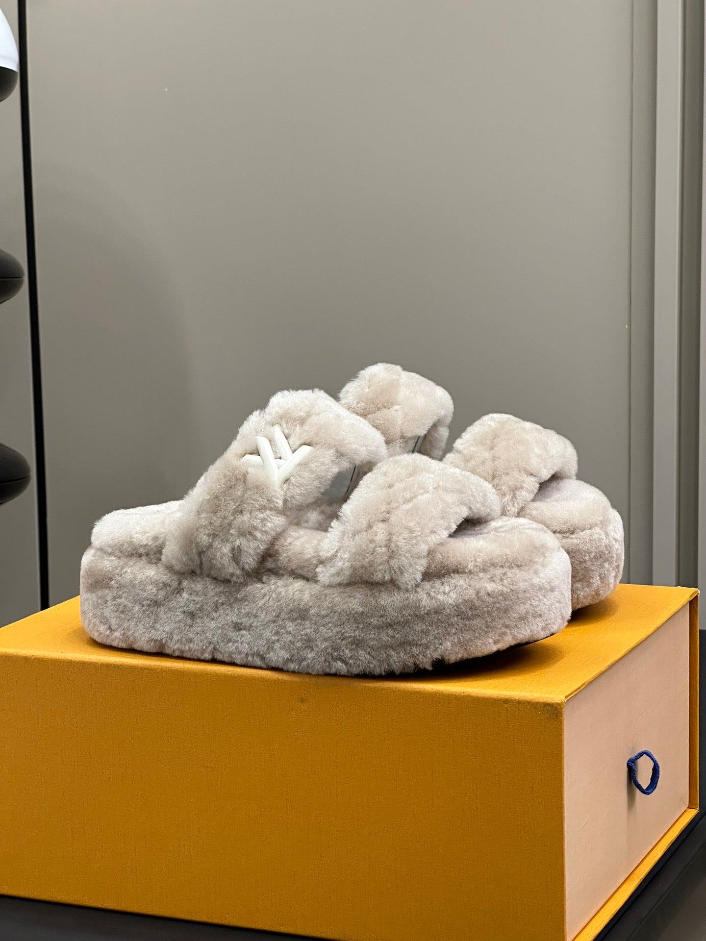 LV WOMEN SUNSET PLATFORM COMFORT MULE IN BEIGE FLEECE