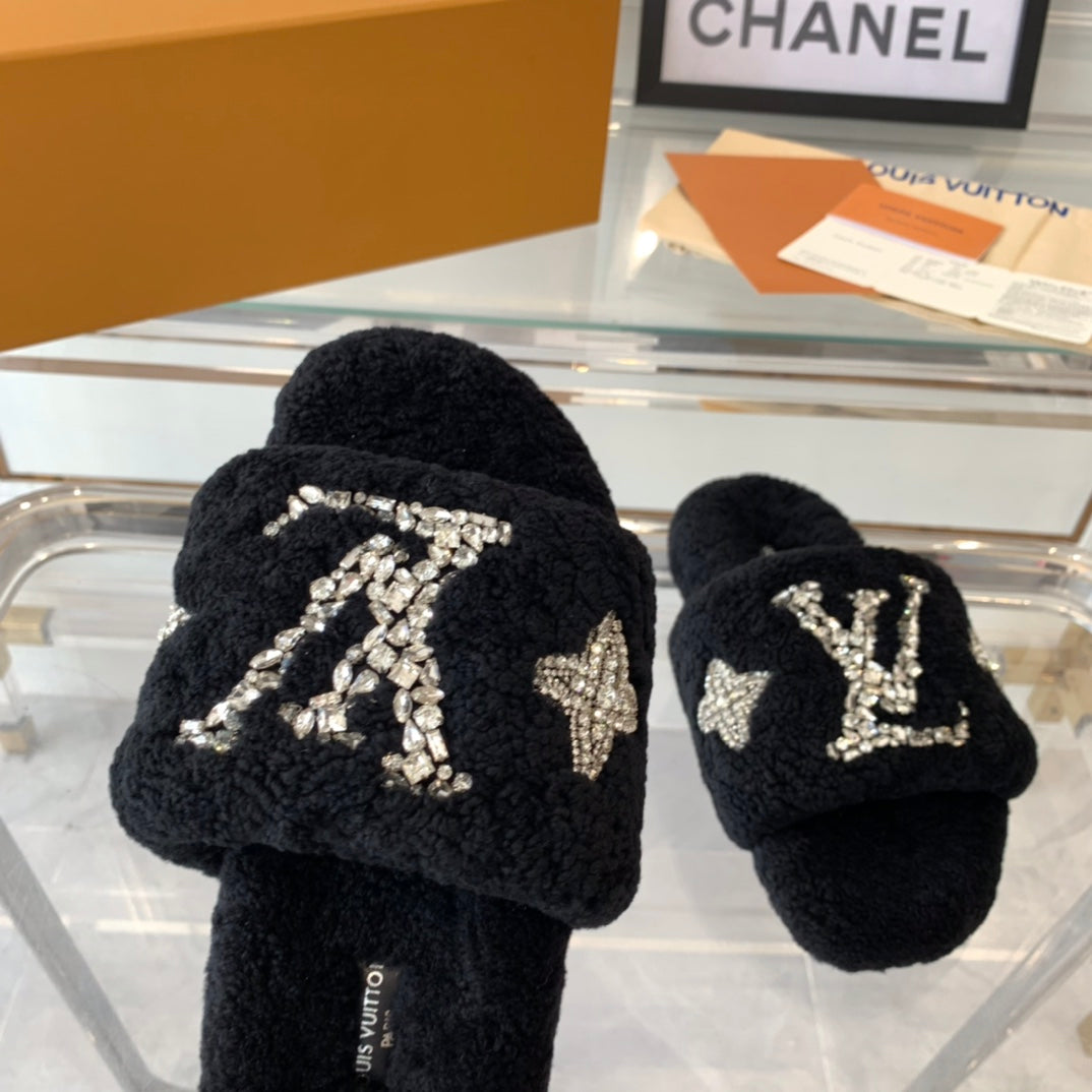 LV WOMEN'S PASEO FLAT SLIPPER IN BLACK FLEECE