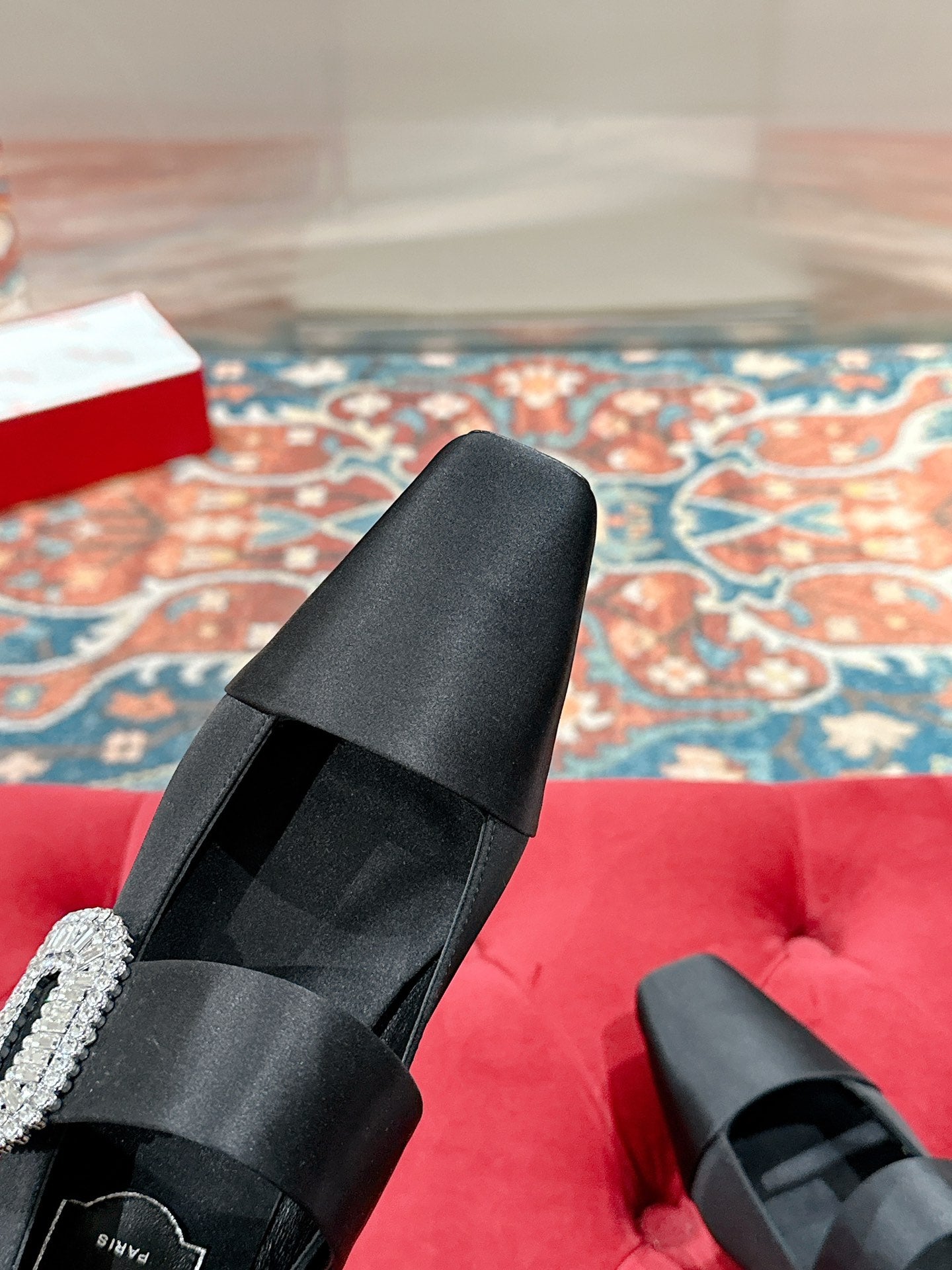 MARY JANES IN BLACK SATIN WITH CRYSTAL SQUARE BUCKLE