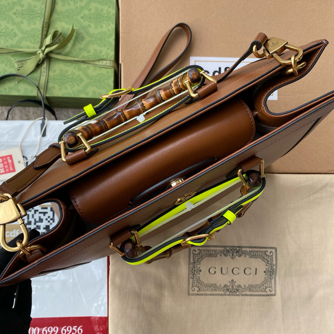 MEDIUM DIANA TOTE BAG 35 IN BROWN LACQUER CALFSKIN BAMBOO HANDLE