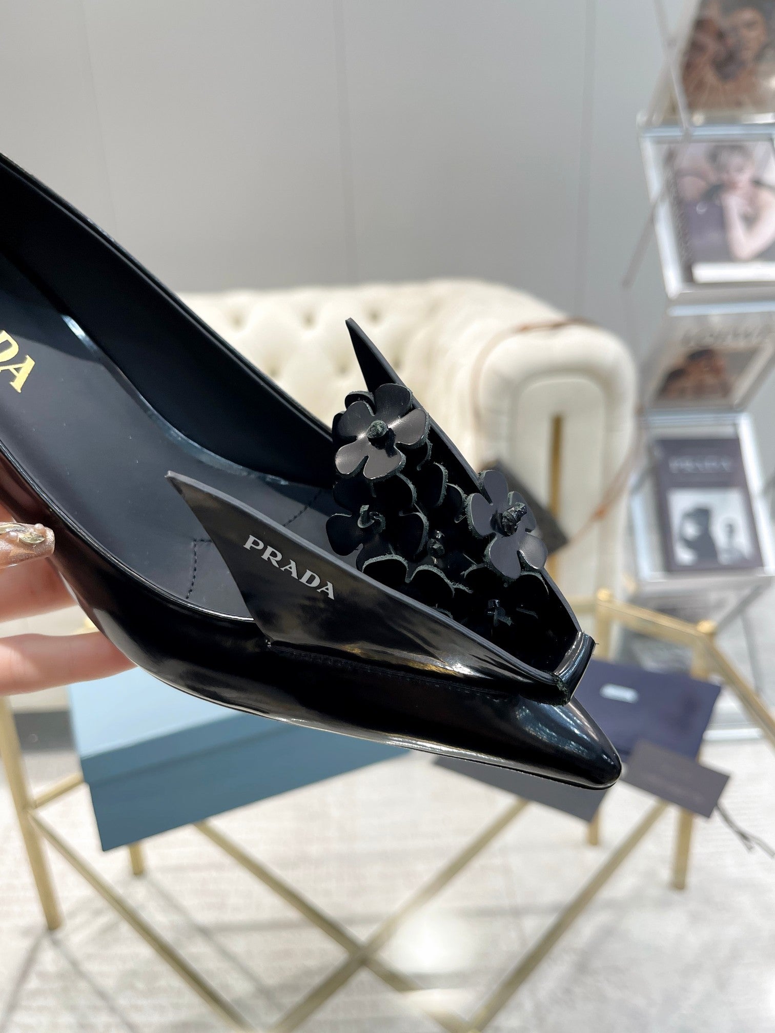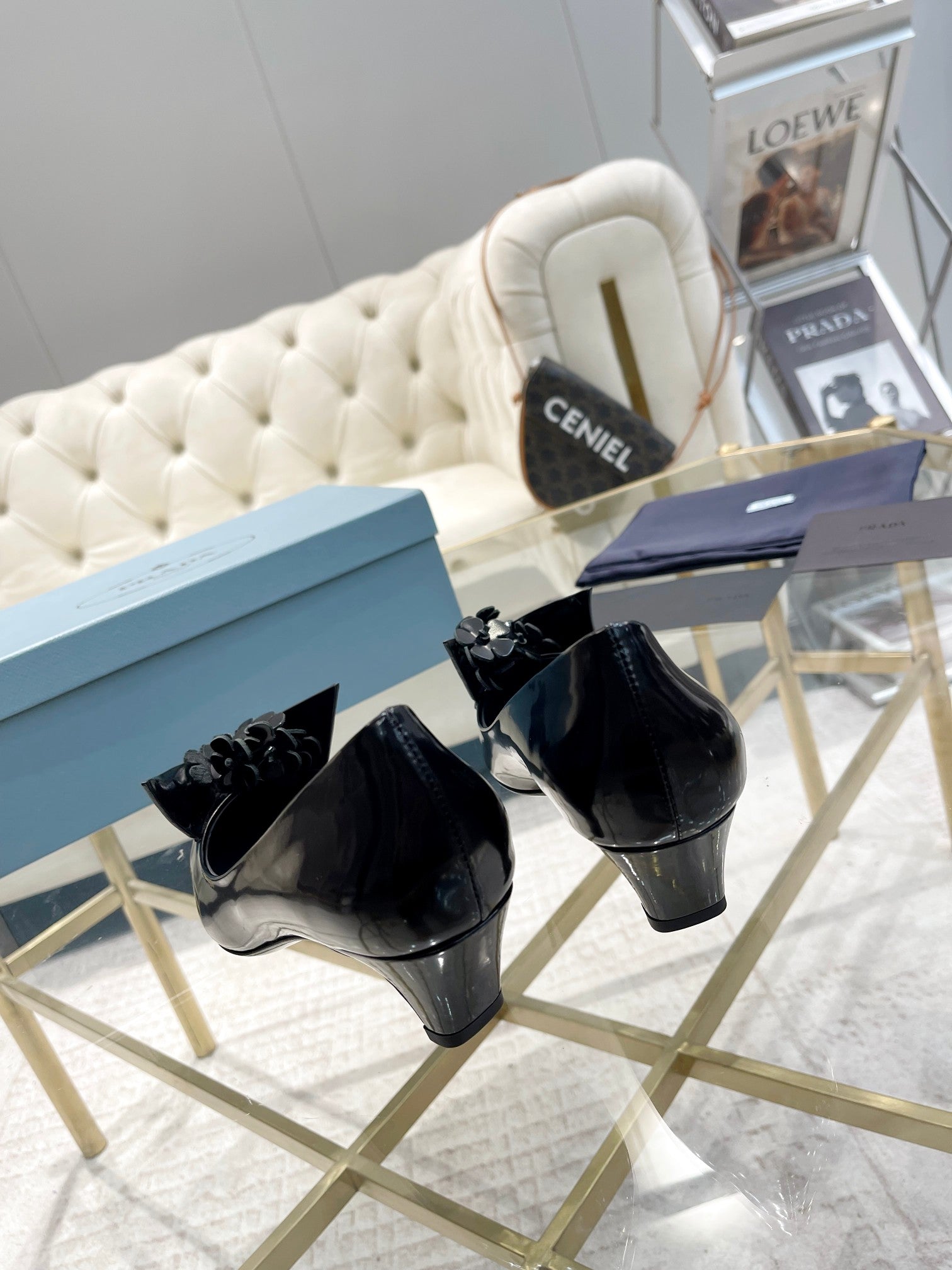 MEDIUM HEEL PUMPS ATTACHED CREATIVE FLOWERS IN BLACK PATENT CALFSKIN