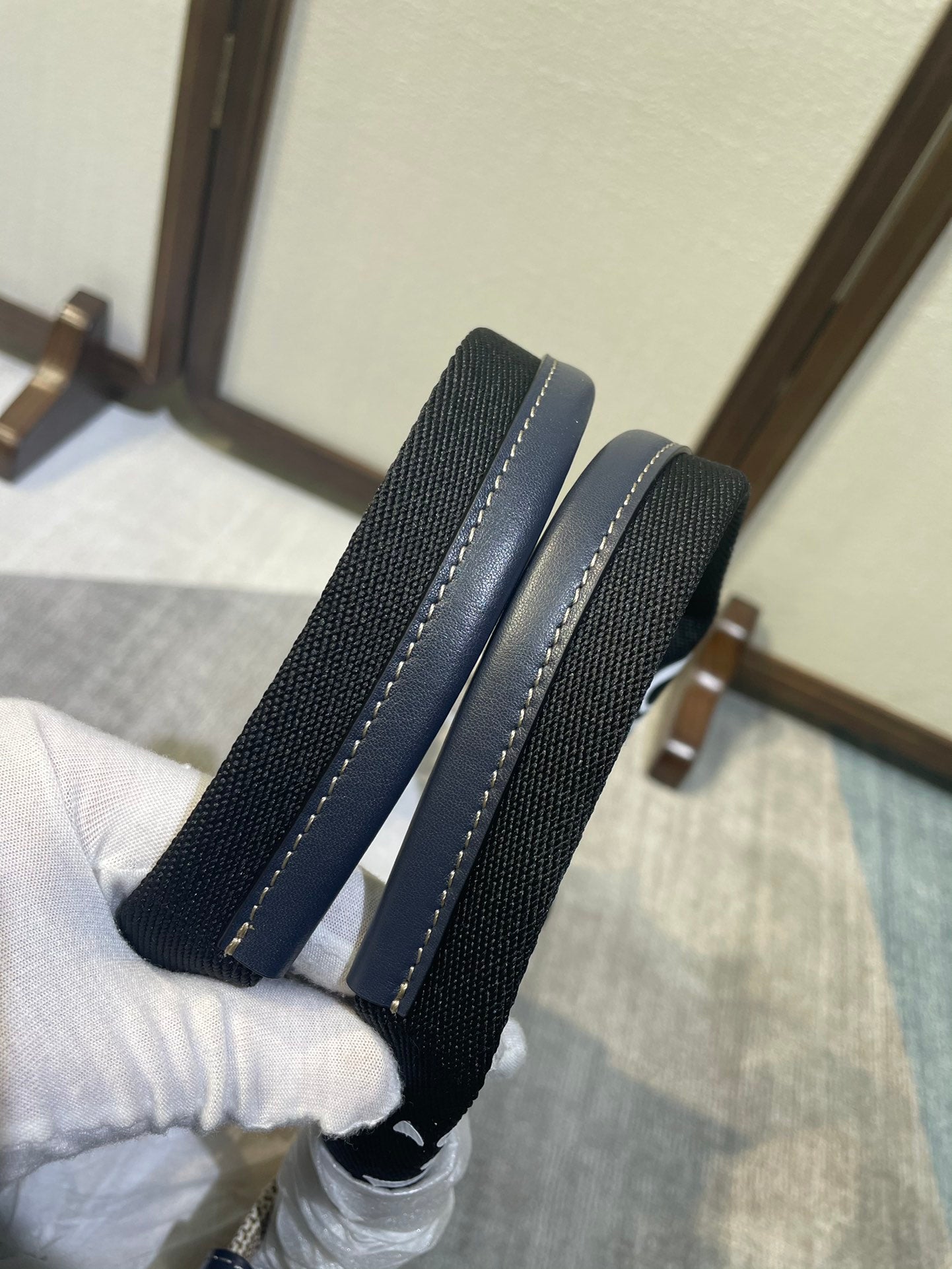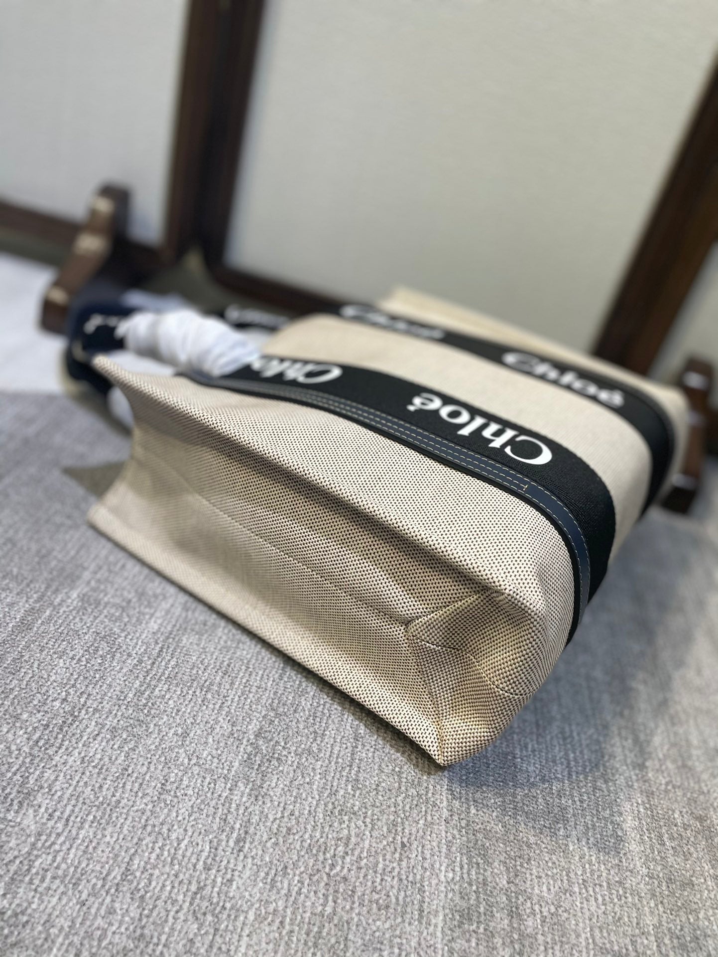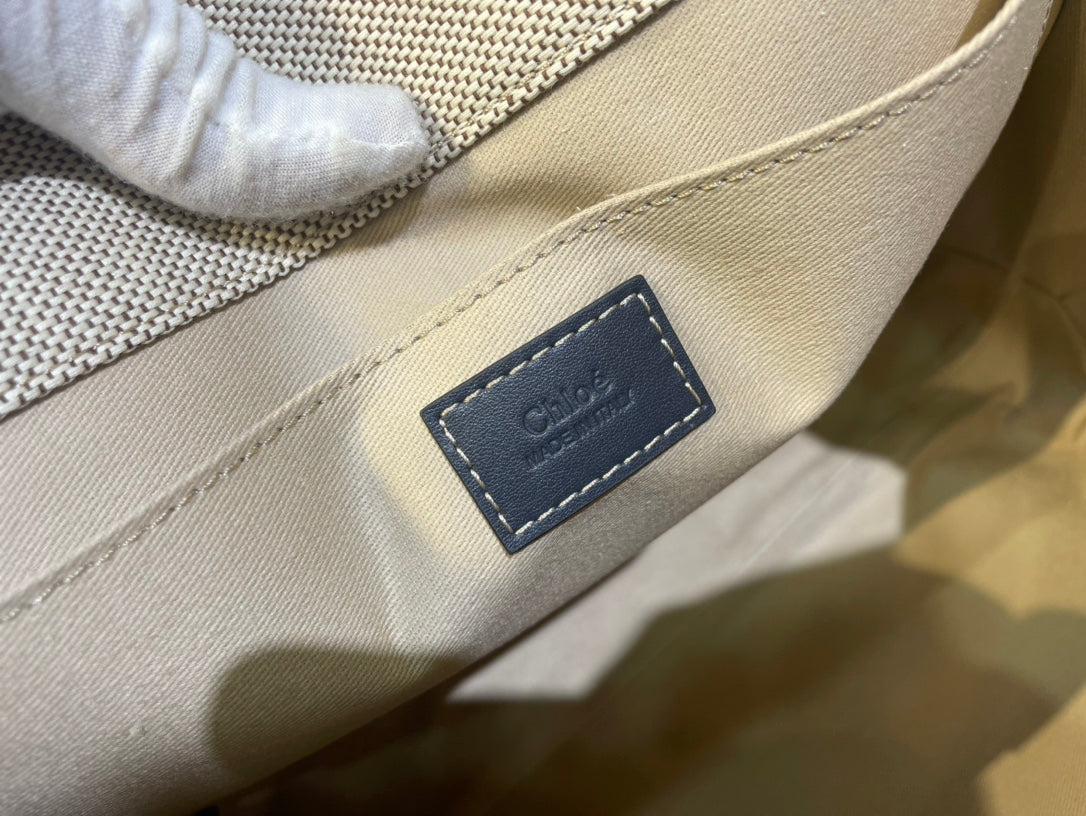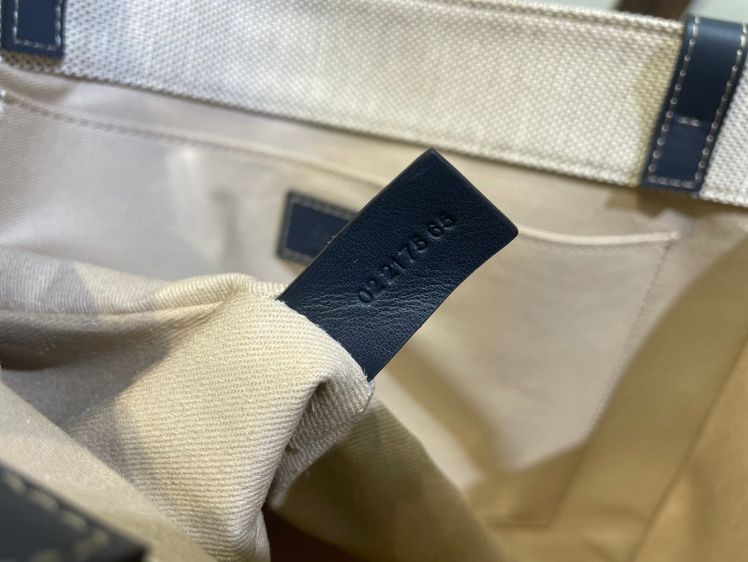 MEDIUM STRAP WOODY TOTE BAG 37 IN BEIGE LINEN CANVAS BLACK WEBBING DARK BLUE CALFSKIN