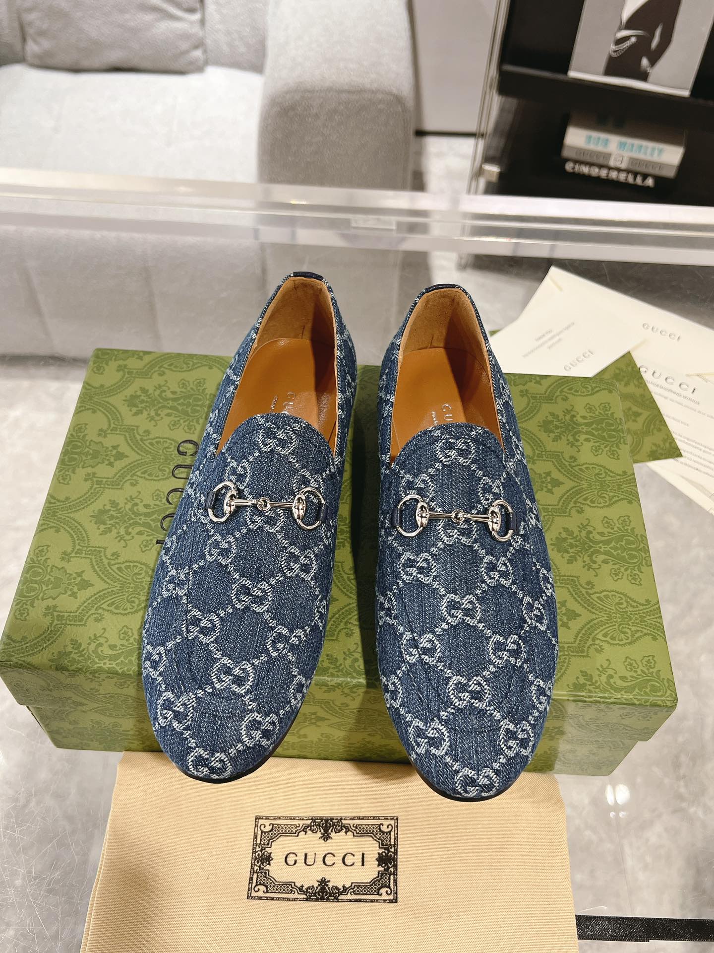 MEN'S LOAFER WITH HORSEBIT IN DENIM BLUE MONOGRAM JACQUARD FABRIC