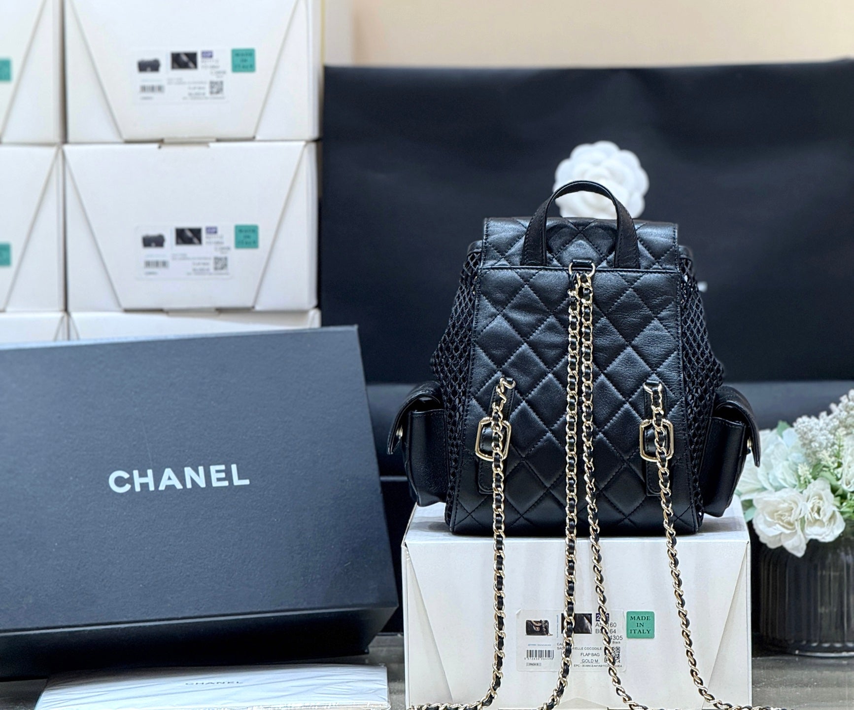 MESH DRAWSTRING BACKPACK 25 IN BLACK CALFSKIN GOLD-TONE METAL