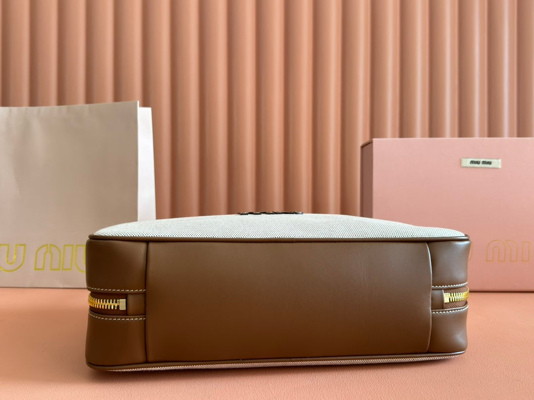 MIUMIU 25S BEAU CANVAS BAG 34 IN BEIGE CANVAS AND BROWN CALFSKIN