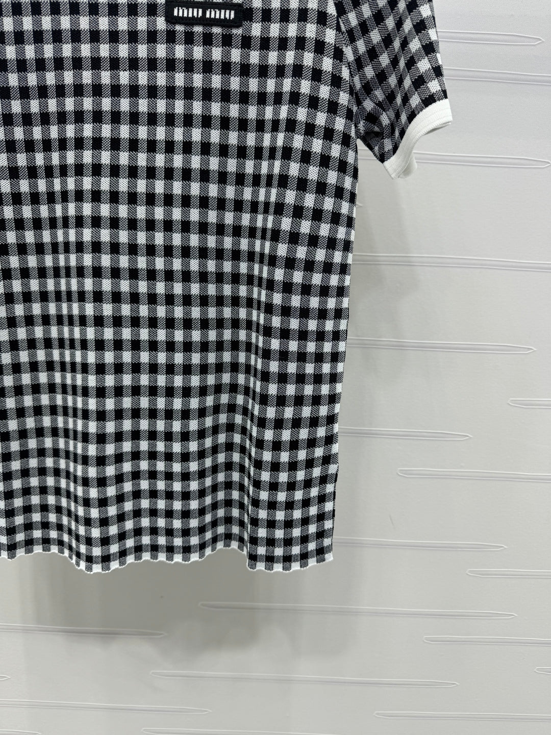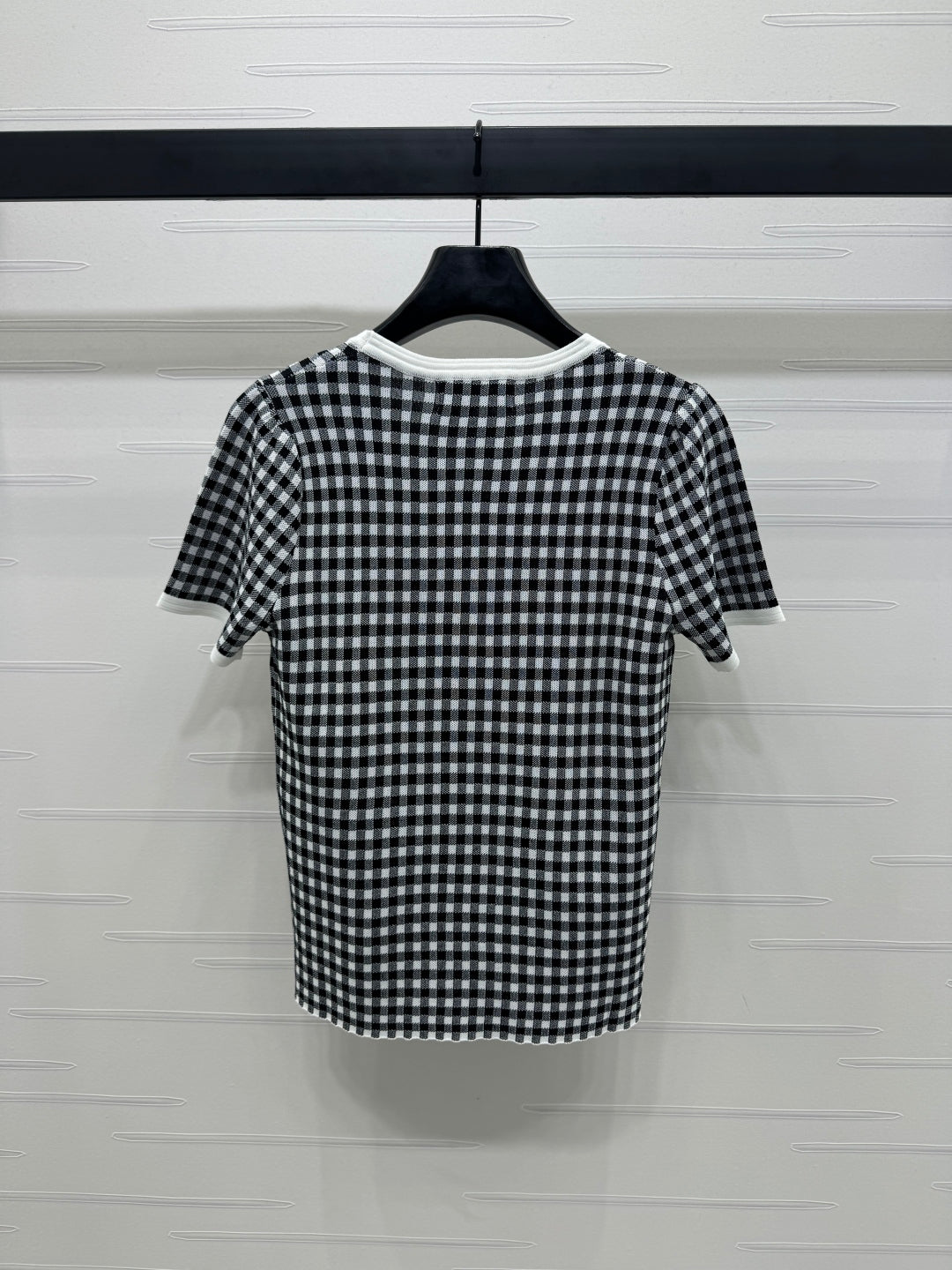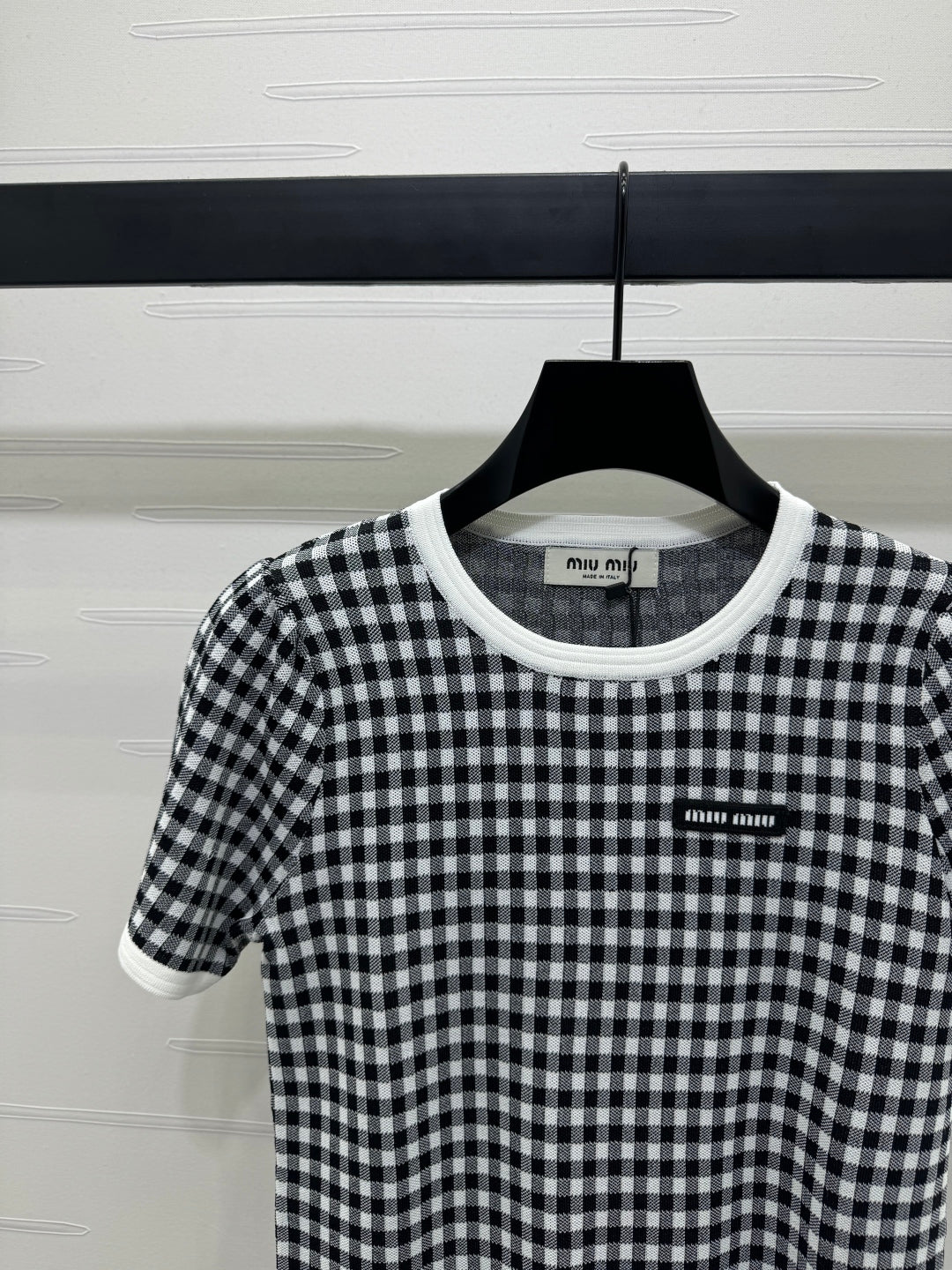 MIUMIU CREW NECK SHORT-SLEEVE PLAID KNIT TOP 274833