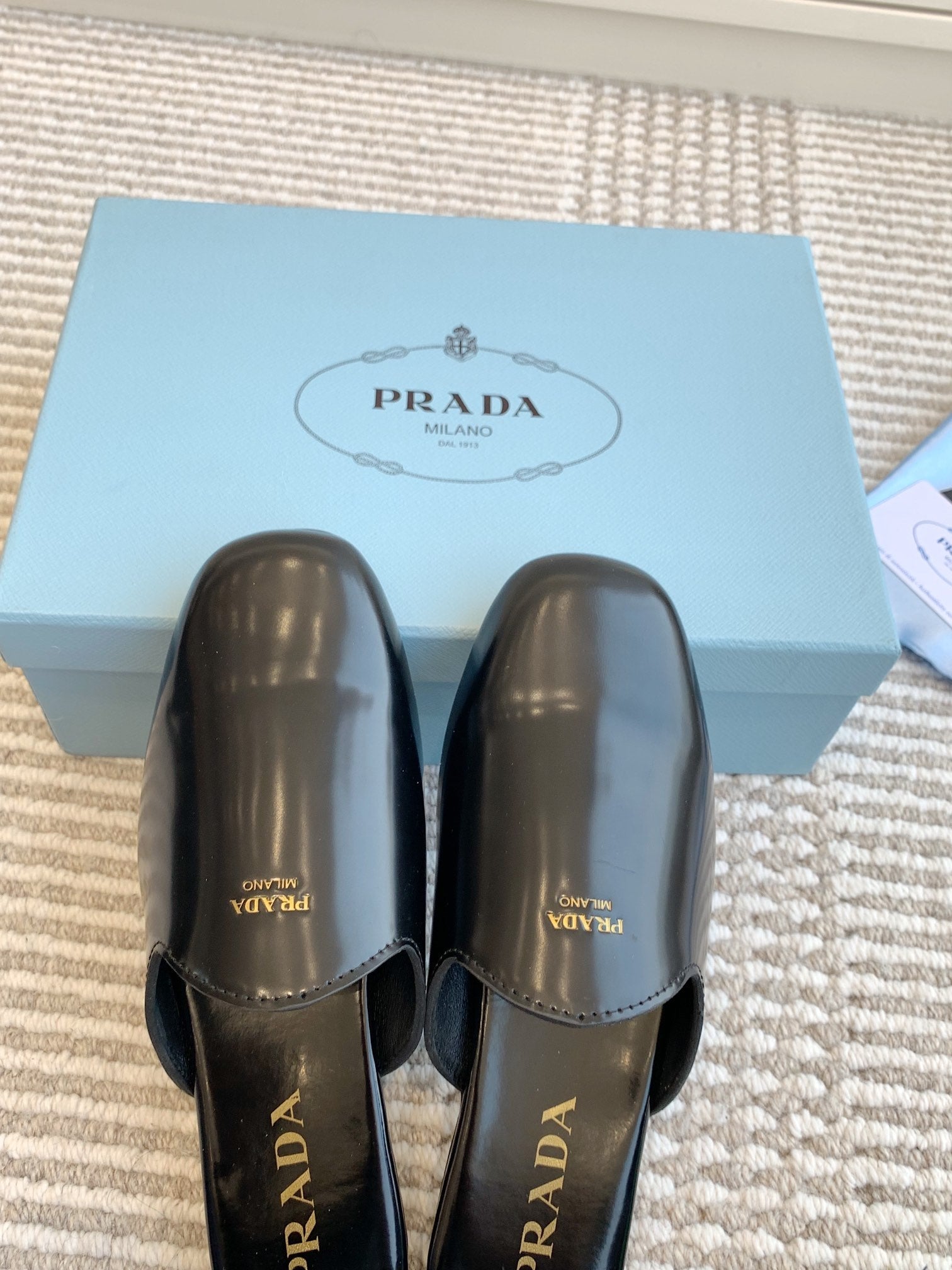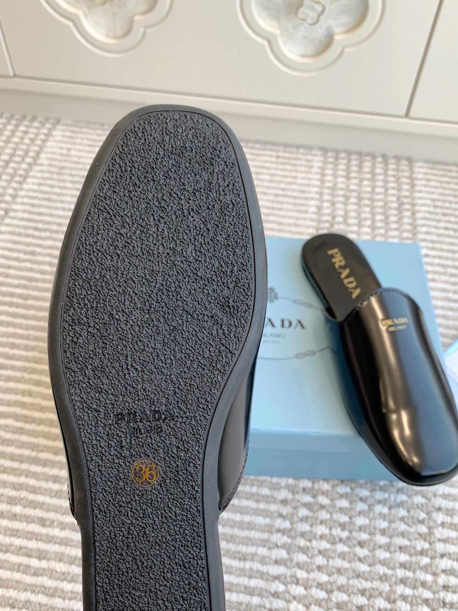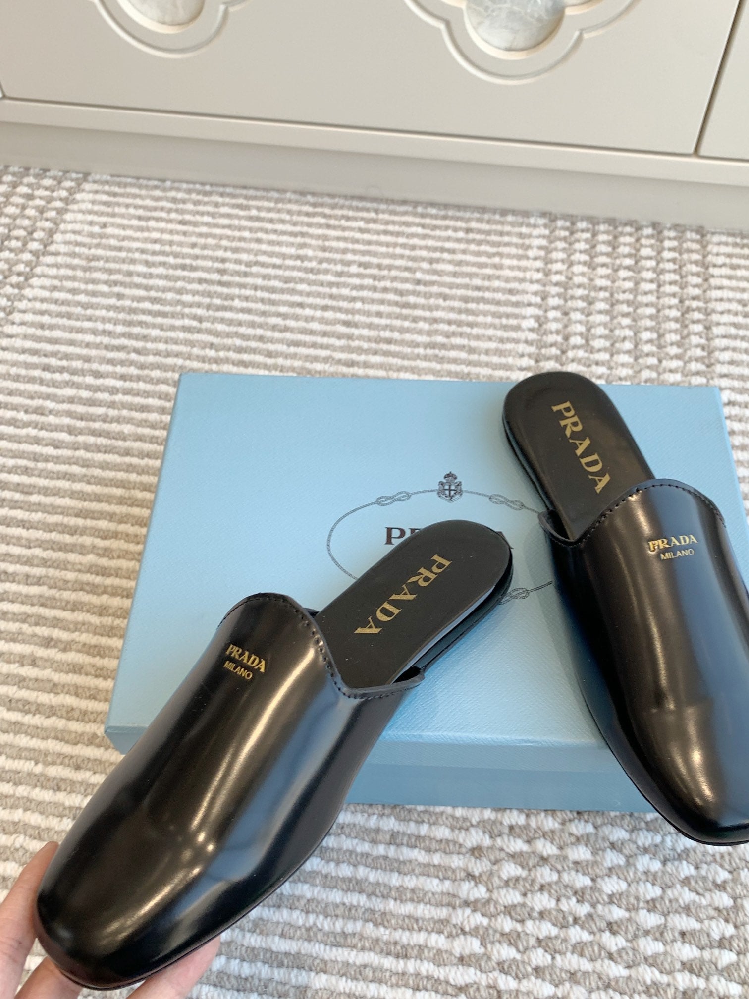 MULES IN BLACK GLOSSY SHEEPSKIN GOLD LETTERING LOGO