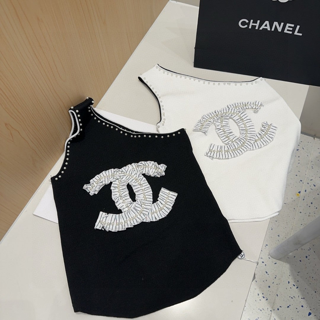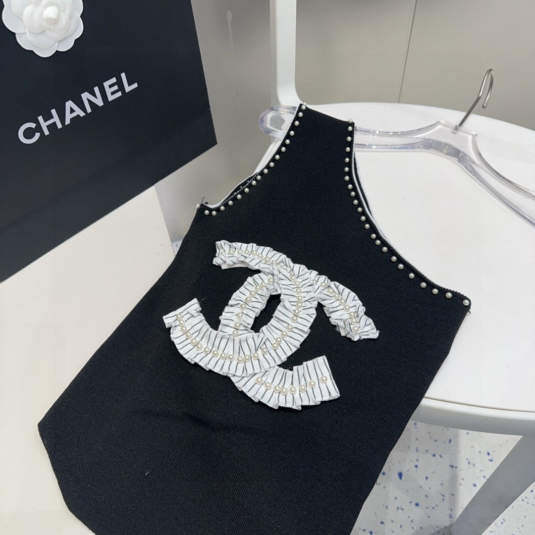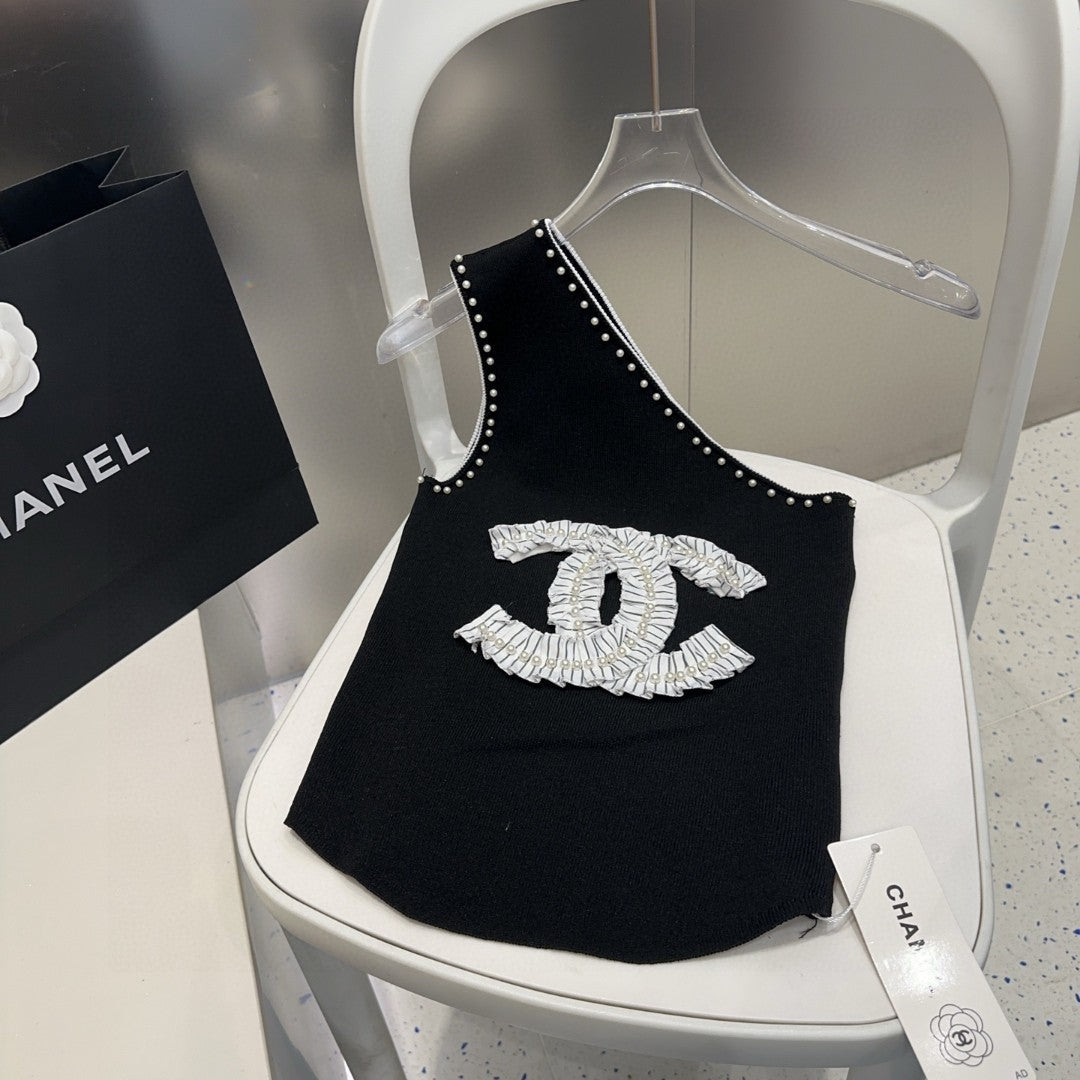 ONE SHOULDER TOP 622139 IN BLACK COTTON EMBOSSED PEARL TRIM