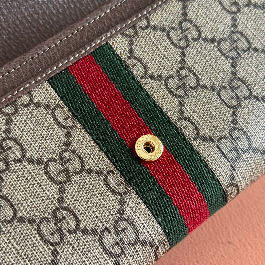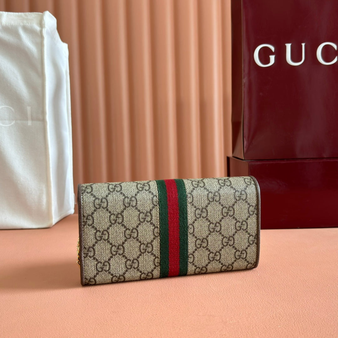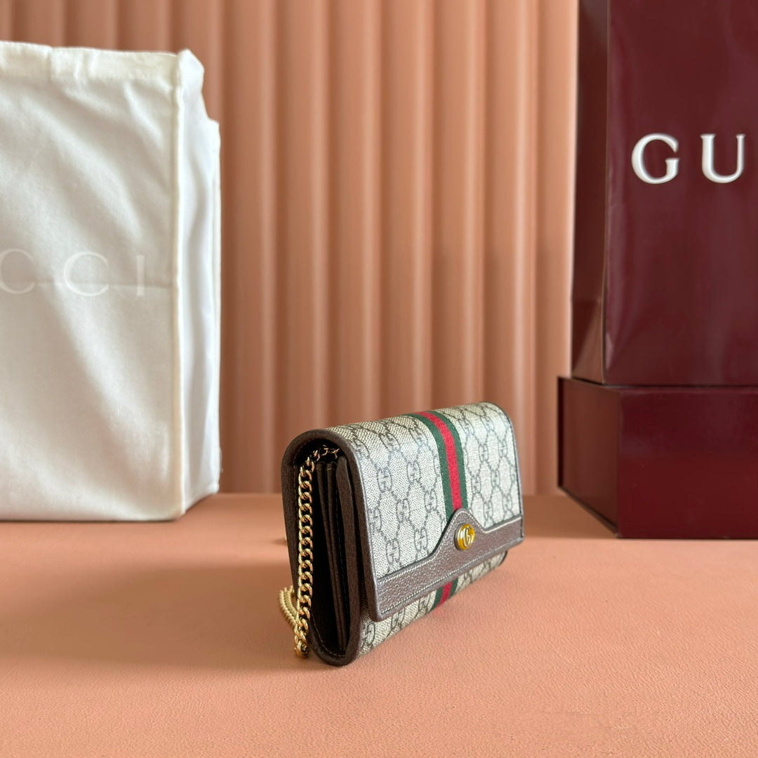 OPHIDIA WALLET ON CHAIN 19 IN BEIGE AND DARK BROWN COATED FABRIC AND BROWN CALFSKIN TRIM