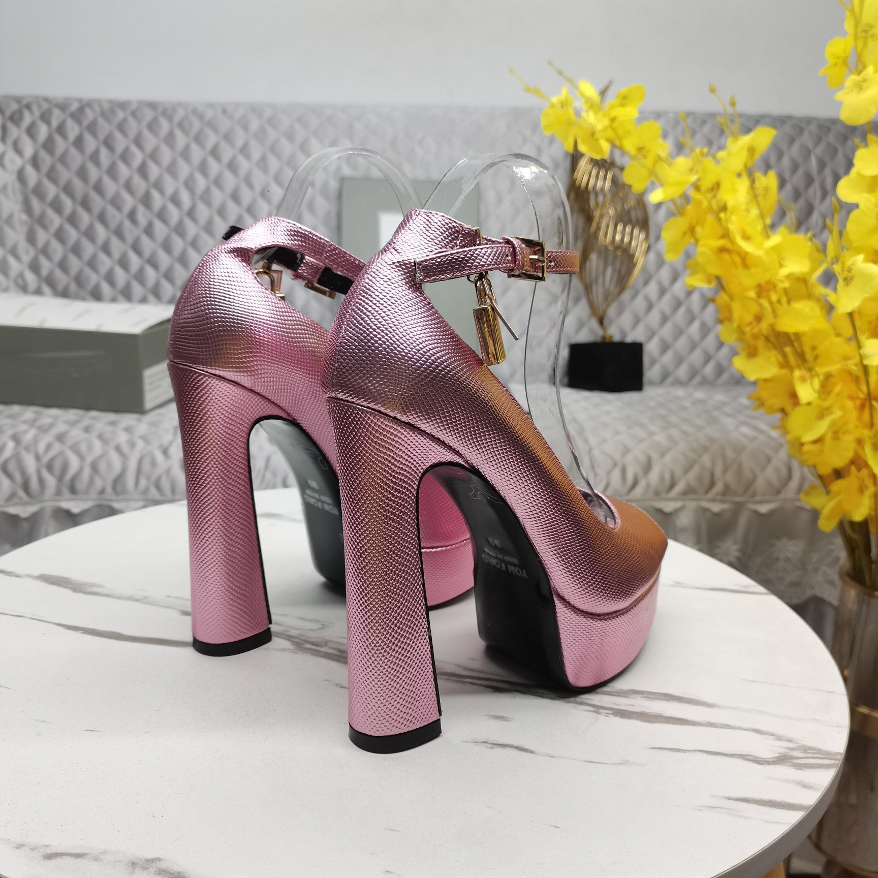 PADLOCK PLATFORM PEEP TOE PUMP 14 CM IN WATERMELON PINK GRAINED CALFSKIN