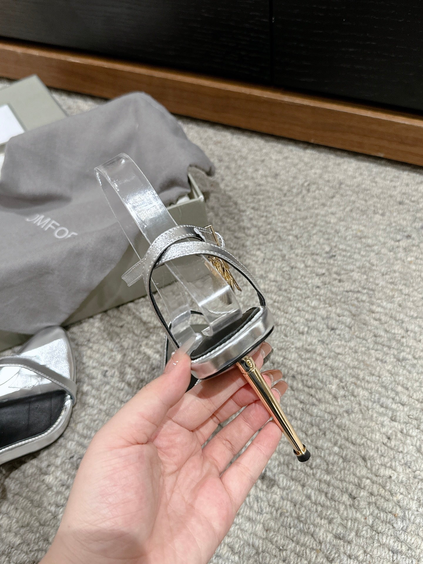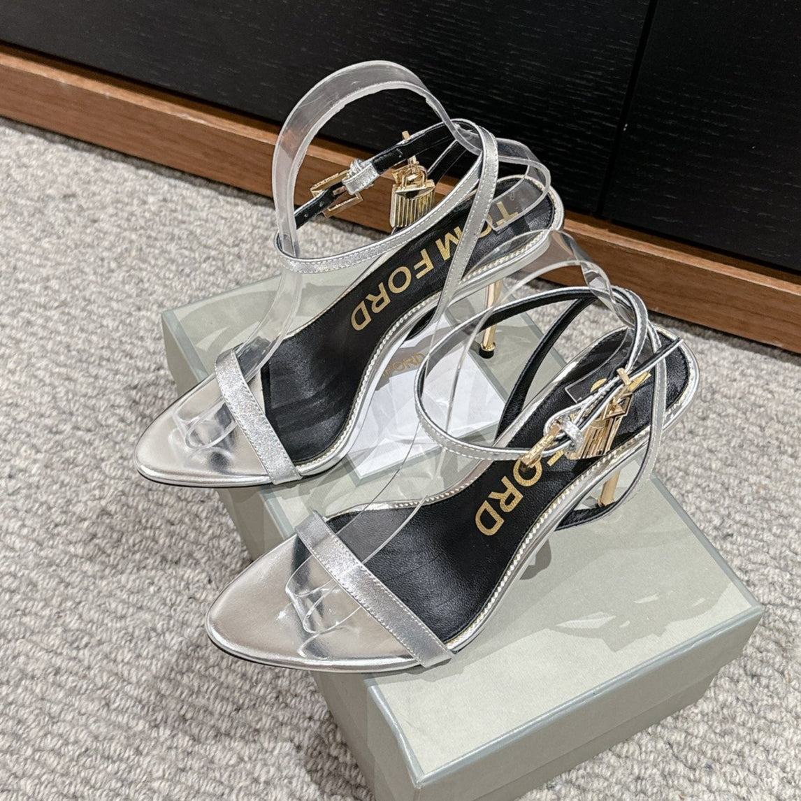 PADLOCK POINTY NAKED SANDAL 85 MM IN SILVER CALFSKIN