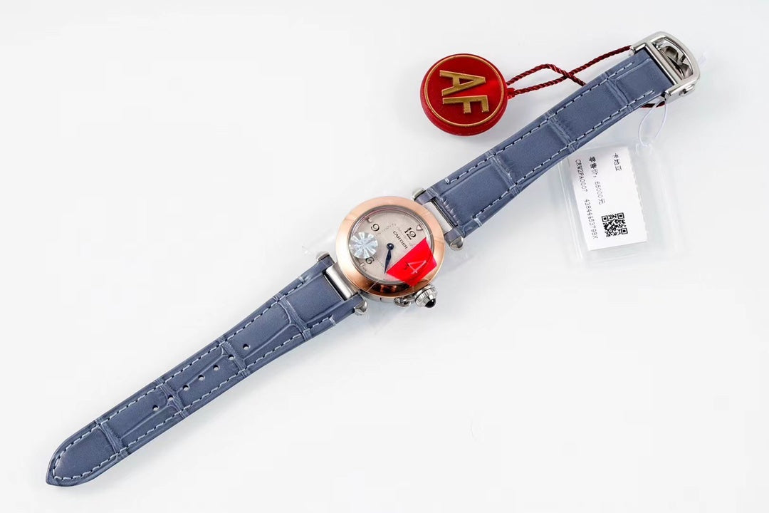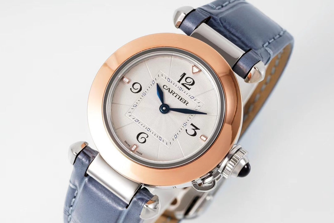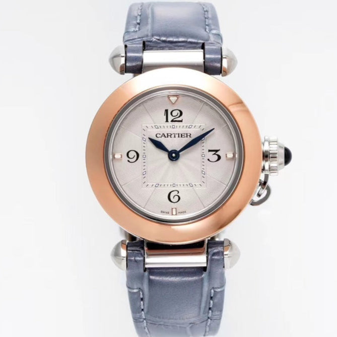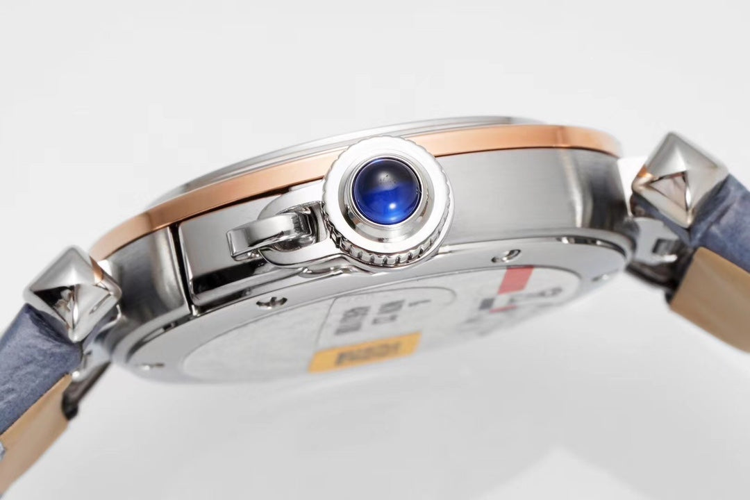 PASHA DE CARTIER WATCH ROSE GOLD AND SILVER CASE AND STONE BLUE LEATHER STRAP