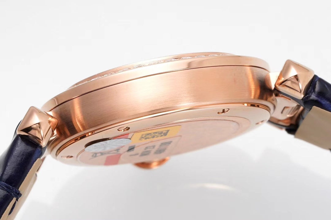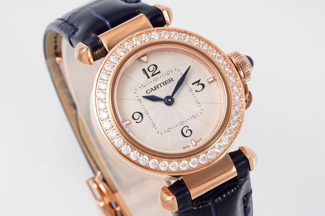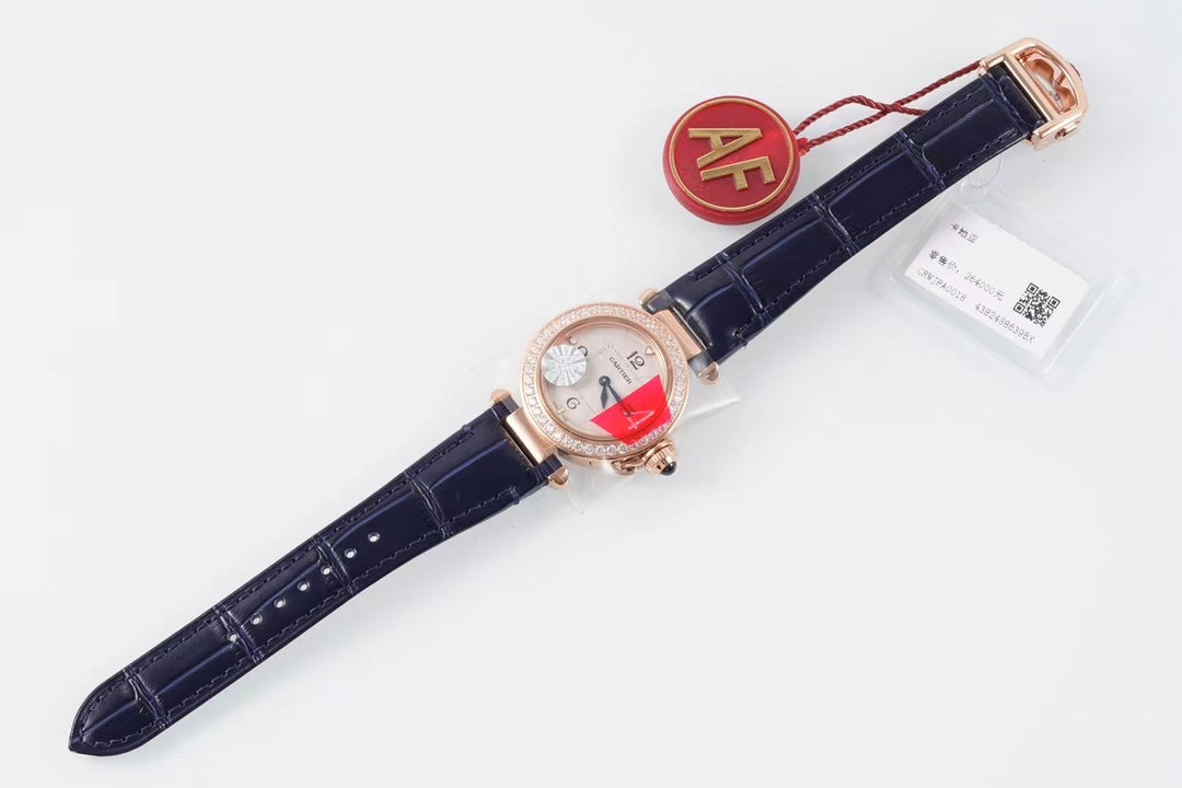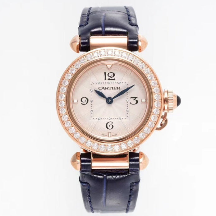 PASHA DE CARTIER WATCH ROSE GOLD CASE WITH CRYSTALS AND BLACK LEATHER STRAP