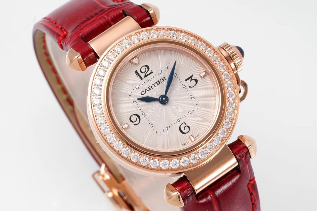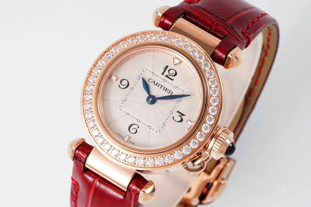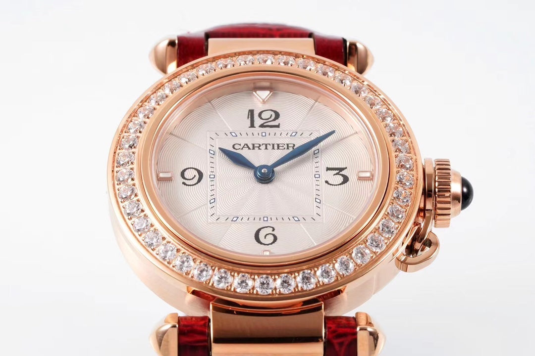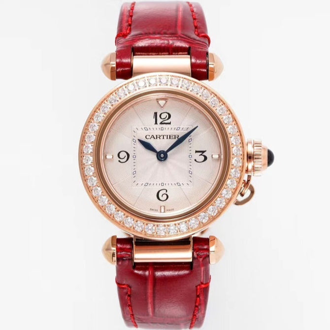 PASHA DE CARTIER WATCH ROSE GOLD CASE WITH CRYSTALS AND CRIMSON RED LEATHER STRAP