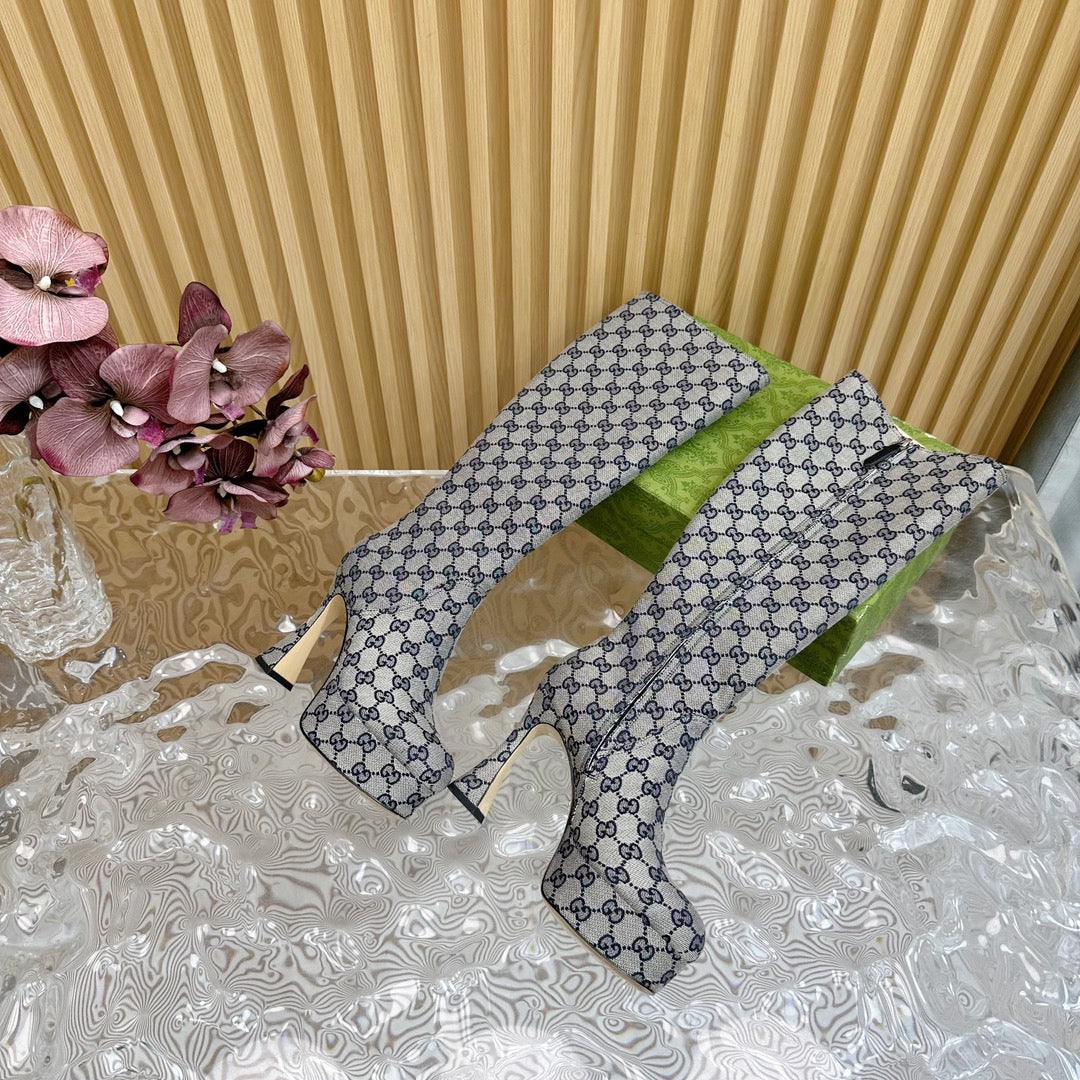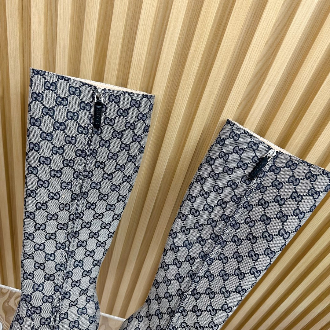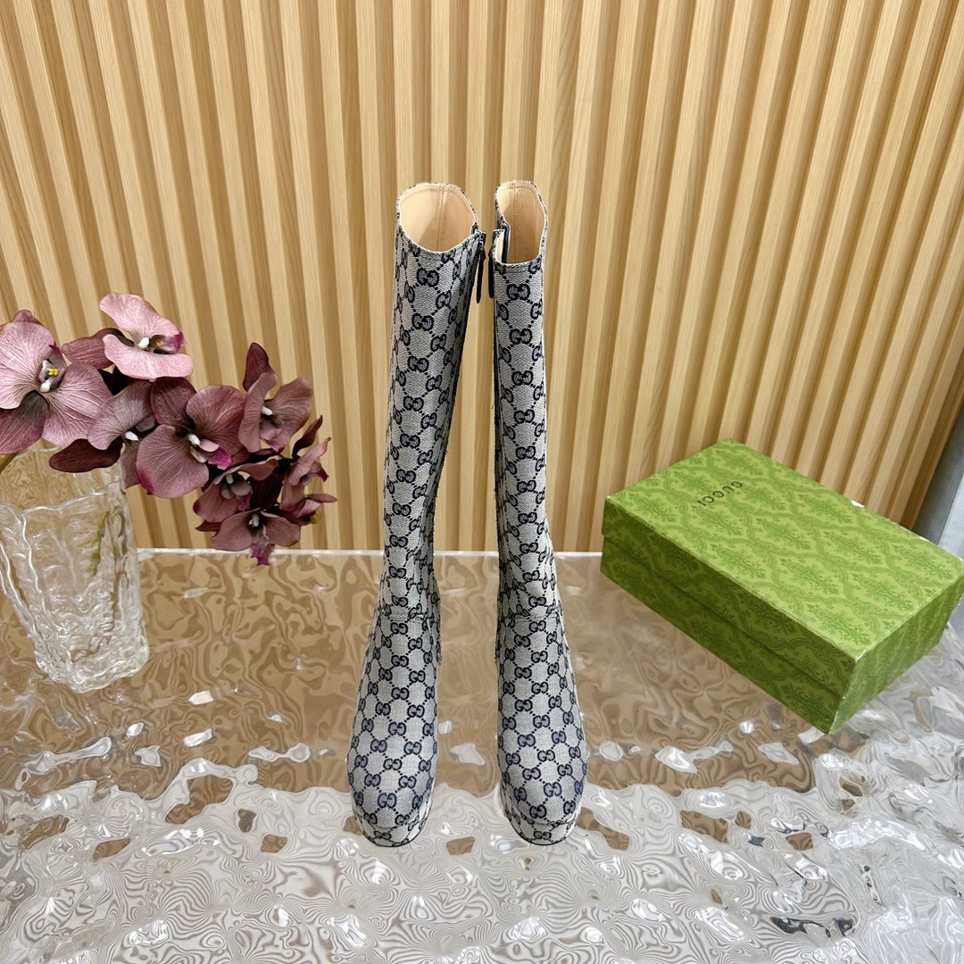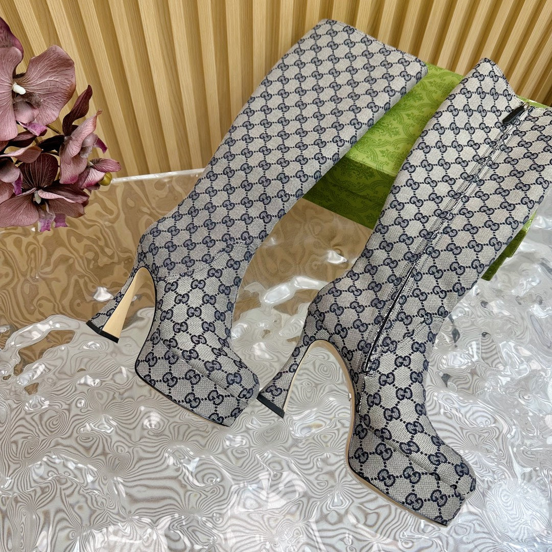 PLATFORM KNEE BOOTS IN LIGHT GRAY MONOGRAM CANVAS AND SHEEPSKIN LINING
