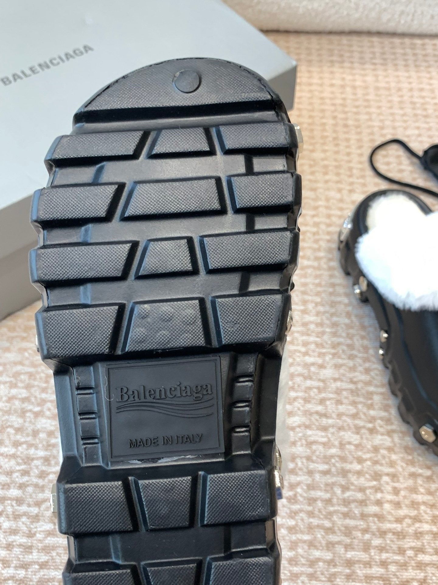 PLATFORM MULES IN BLACK RUBBER MIX RABBIT FUR SILVER HARDWARE