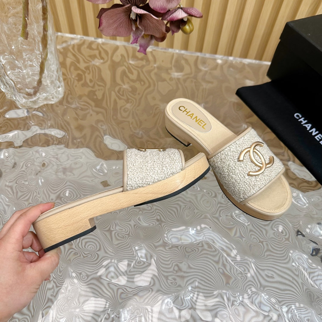 PLATFORM SLIPPERS IN LIGHT GREY TWEED AND LAMBSKIN