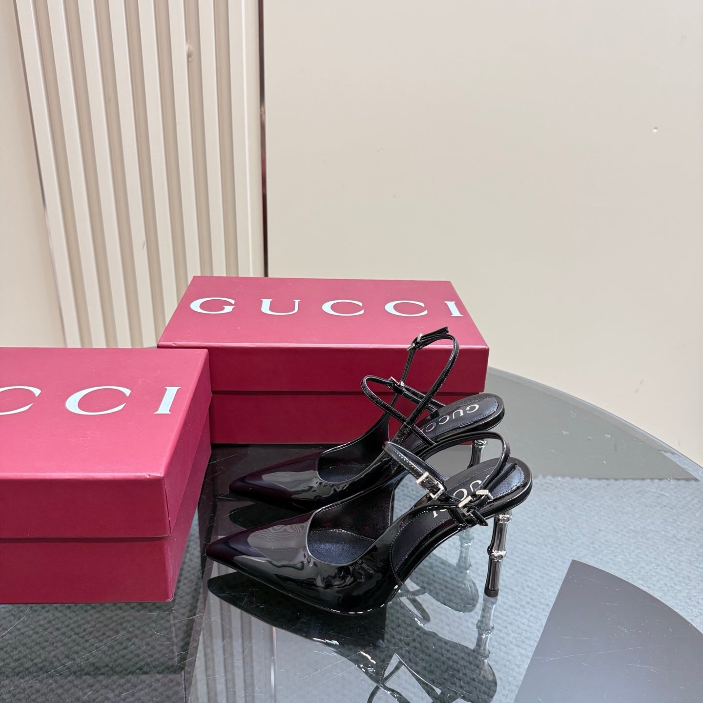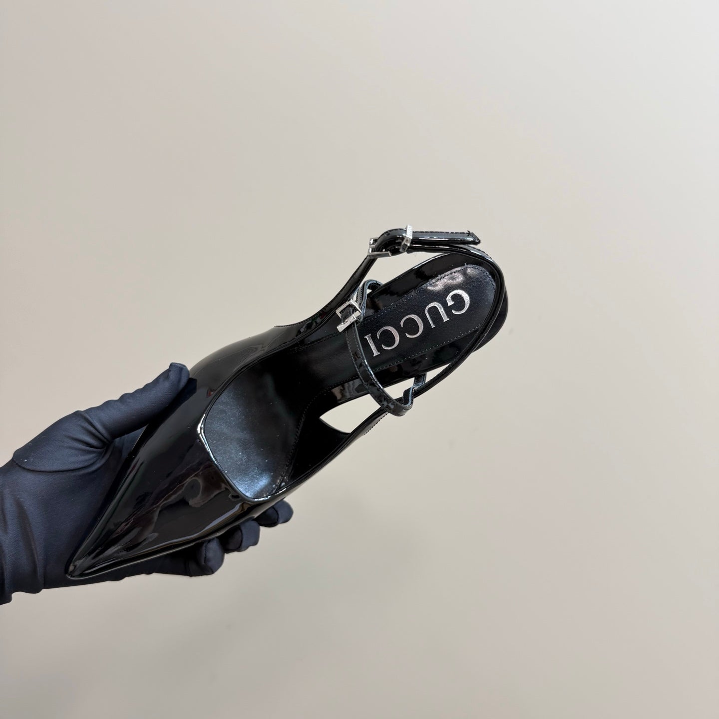 POINTED-TOE HIGH BAMBOO-EFFECT HEEL SLINGBACK IN BLACK PATENT CALFSKIN