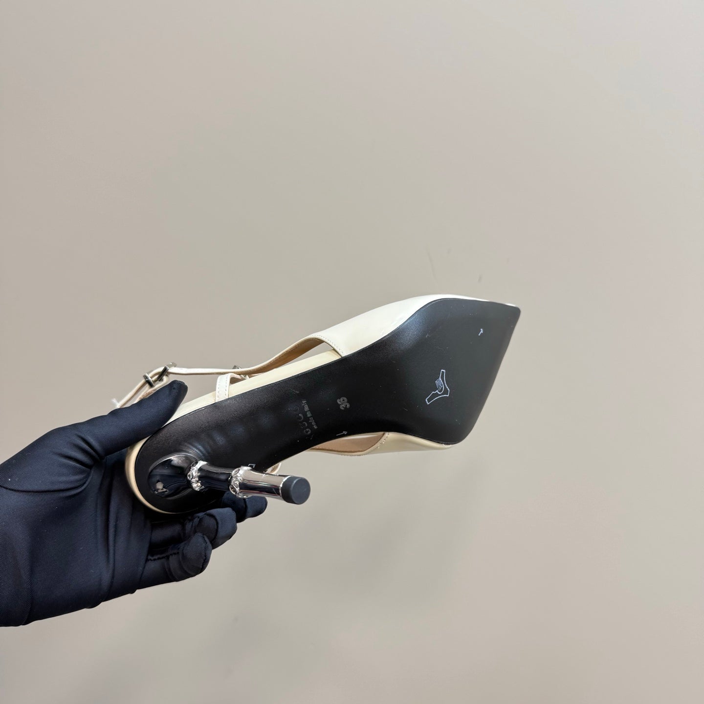 POINTED-TOE HIGH BAMBOO-EFFECT HEEL SLINGBACK IN CREAM PATENT CALFSKIN