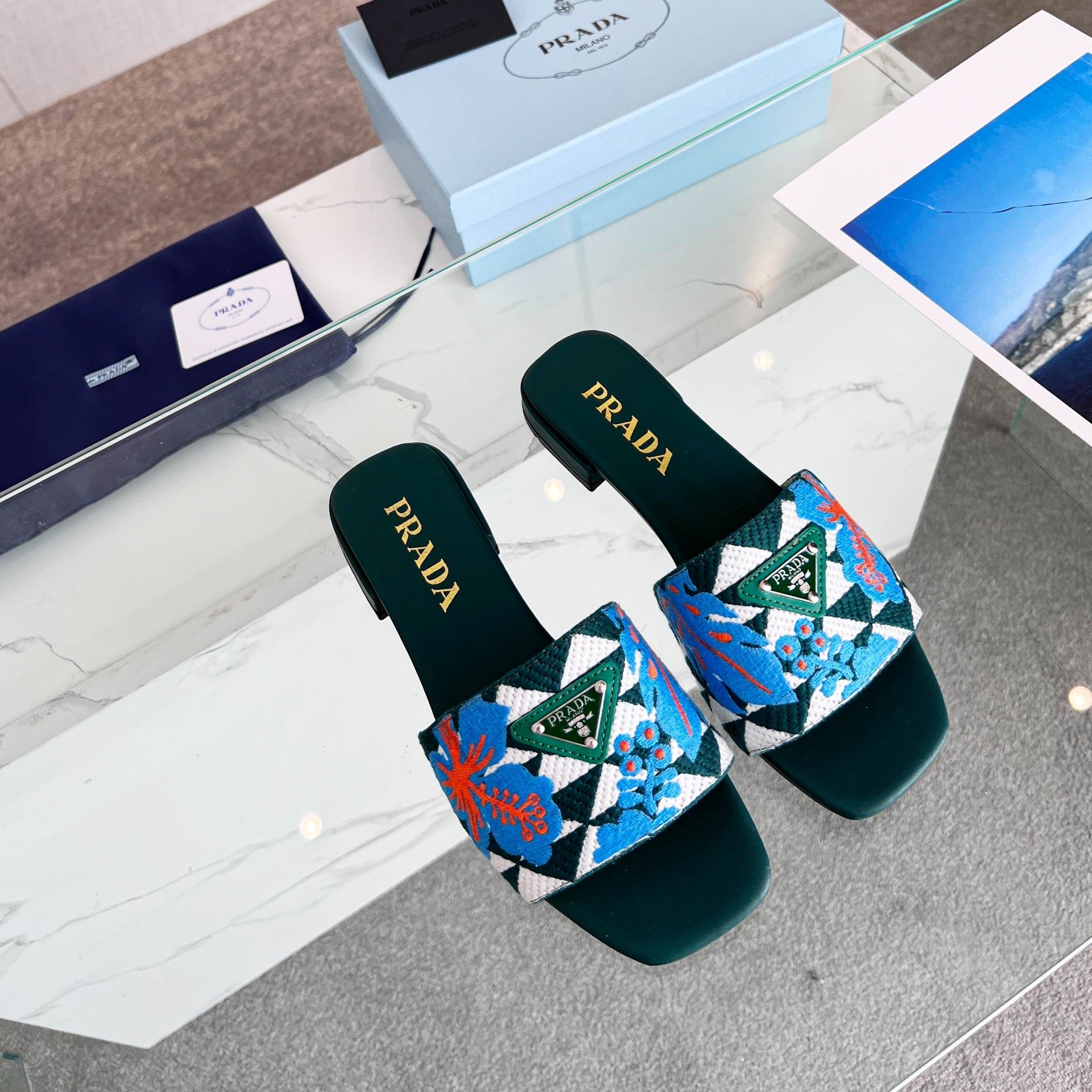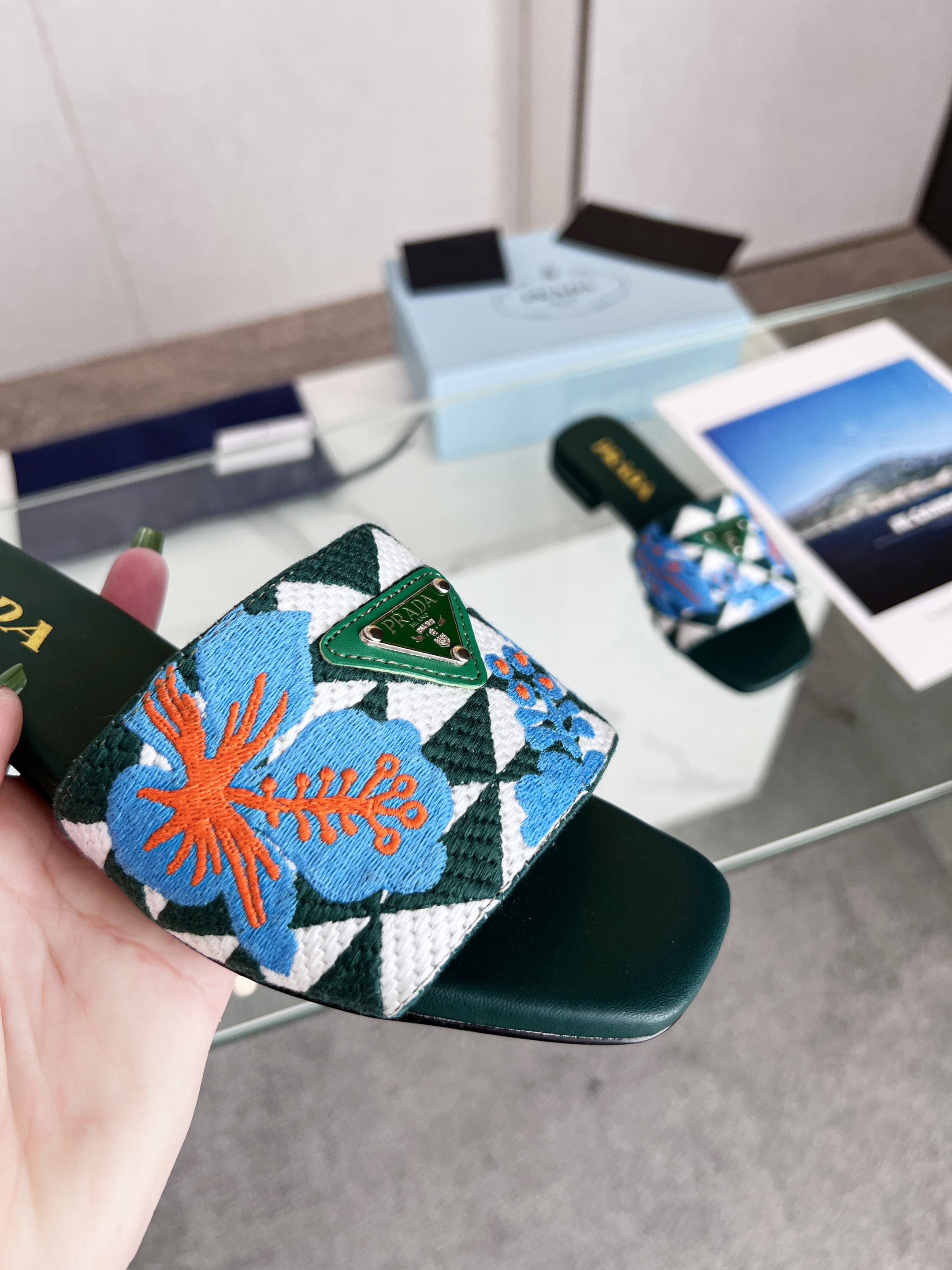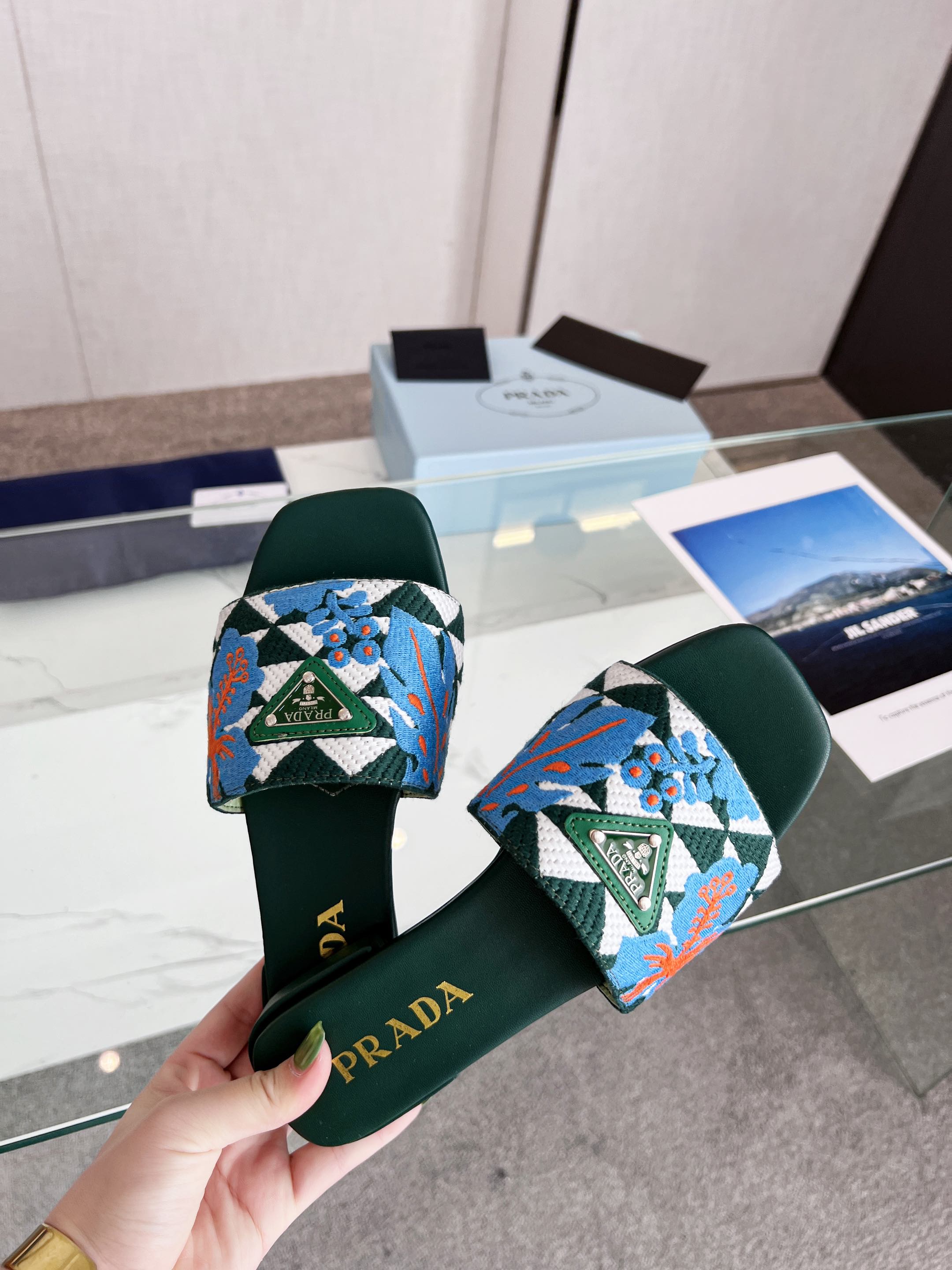PRA EMBROIDERED SLIDES FLAT CASTLETON GREEN FABRIC