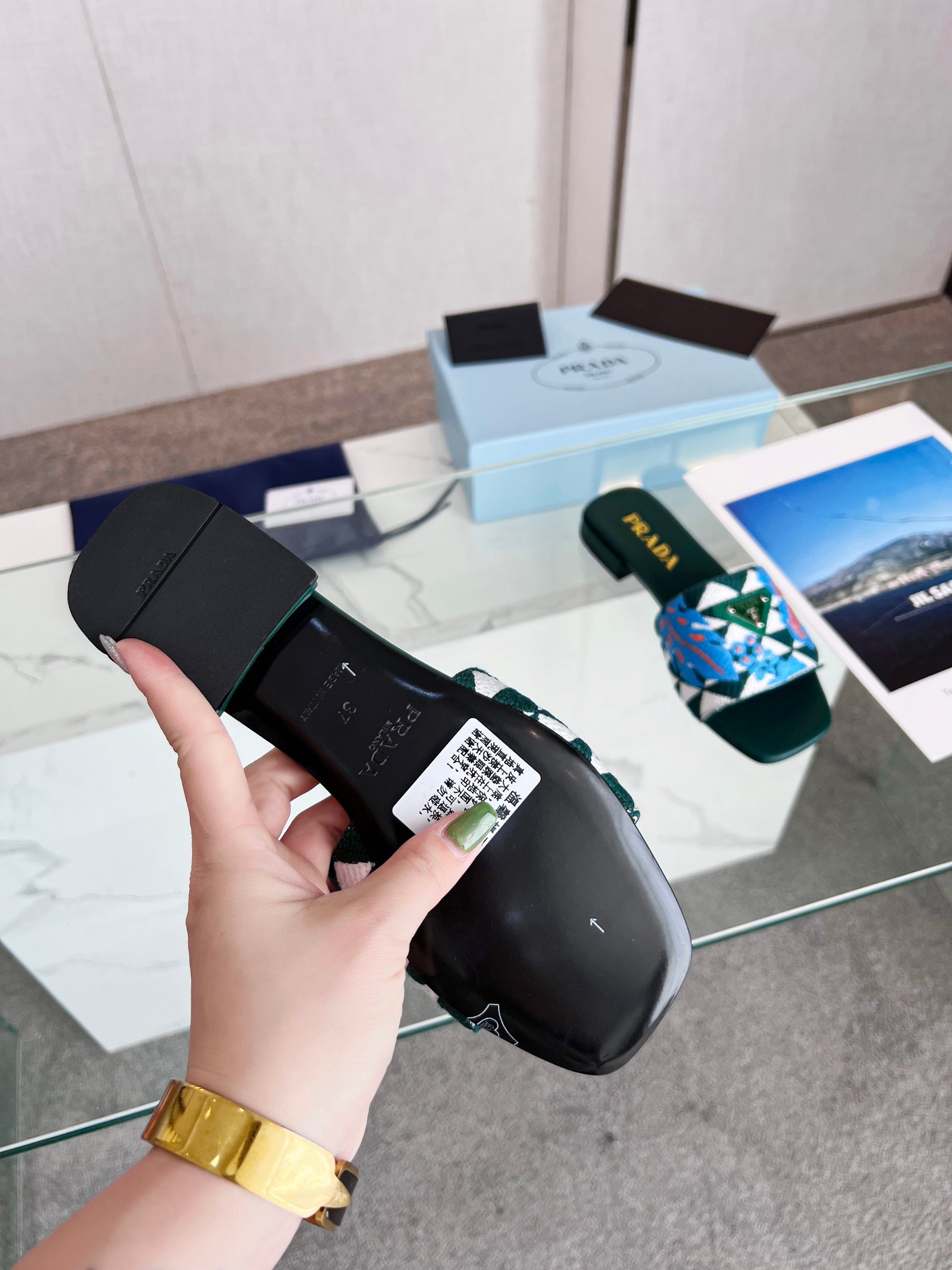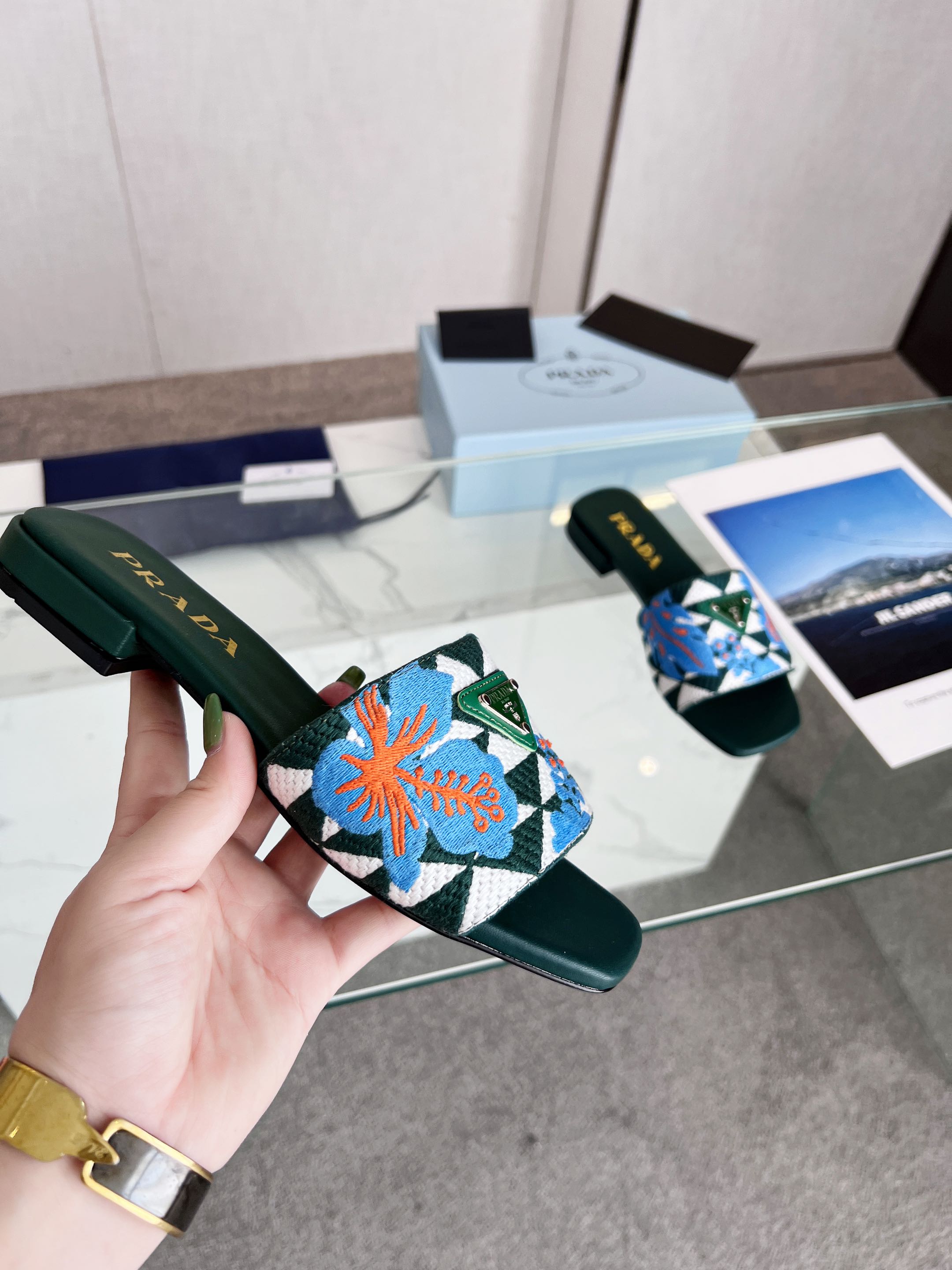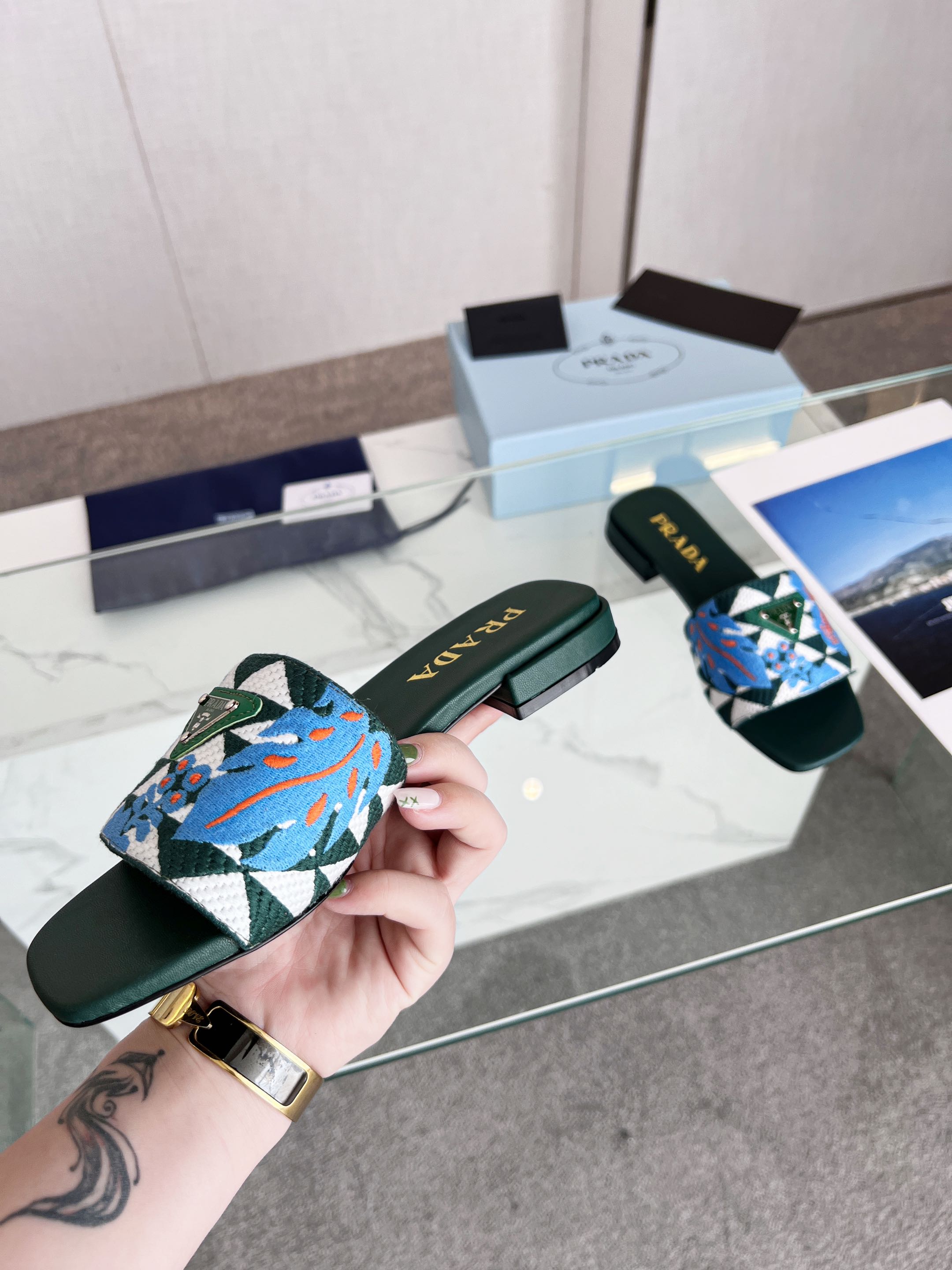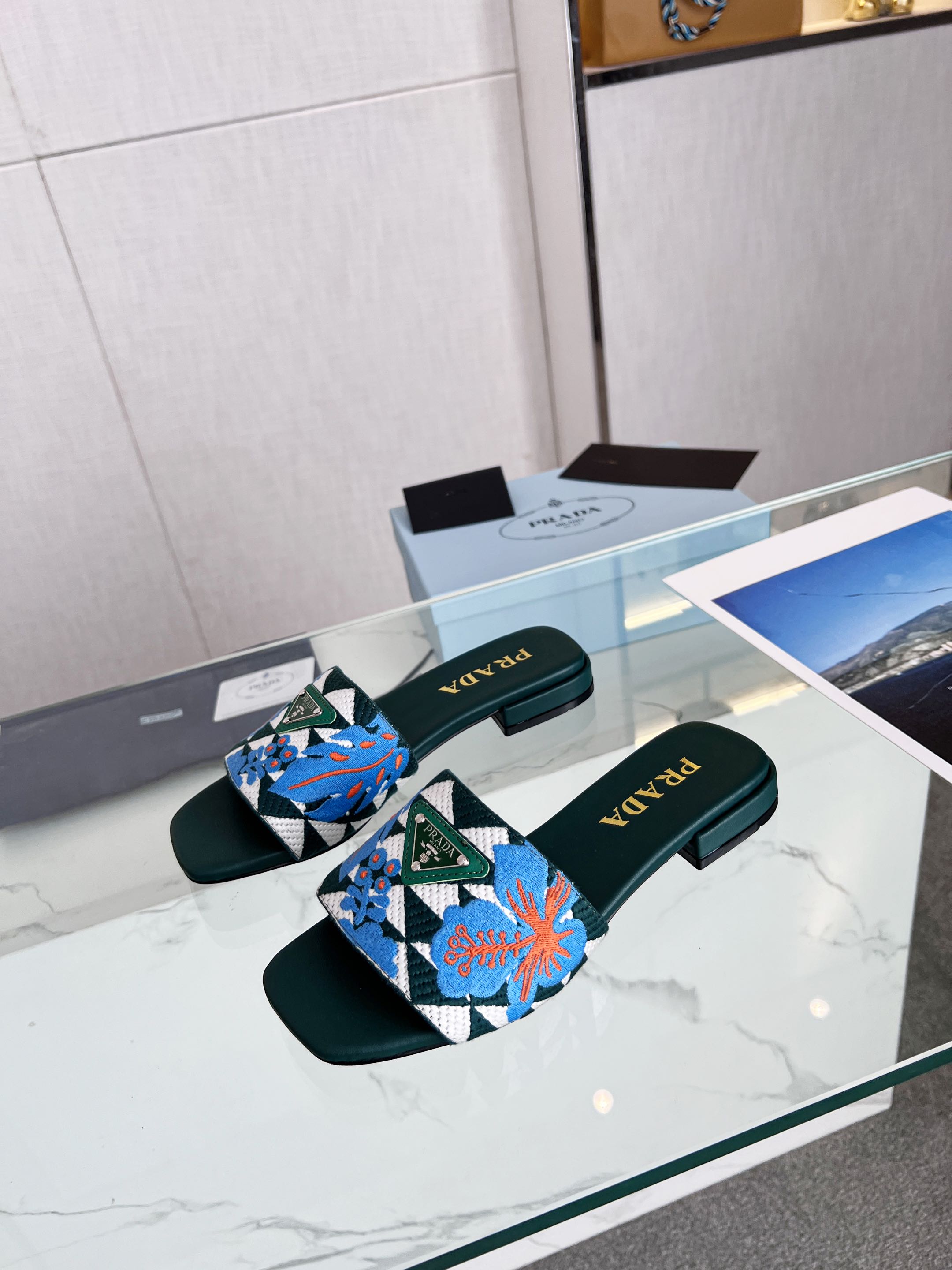 PRA EMBROIDERED SLIDES FLAT CASTLETON GREEN FABRIC