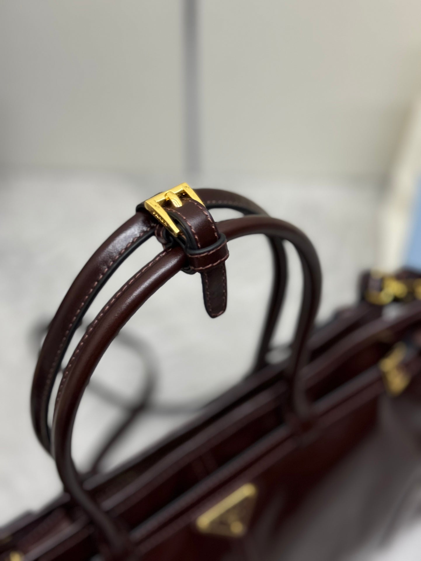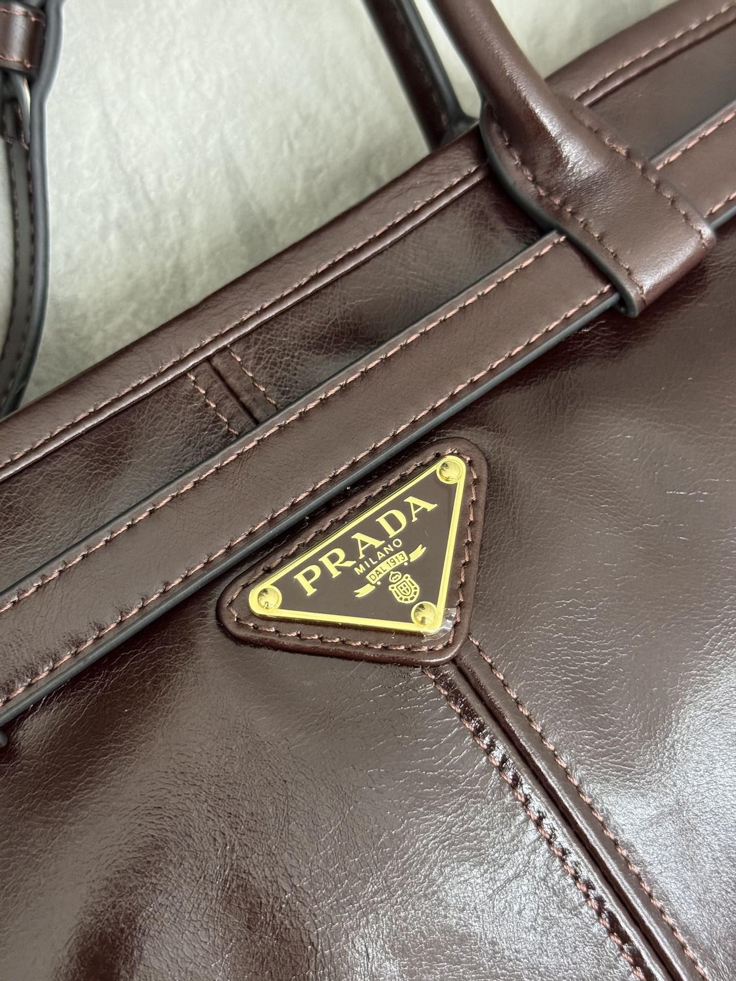 PRADA 25S BONNIE LARGE HANDBAG 38 IN DARK BROWN GLOSSY CALFSKIN GOLD HARDWRE