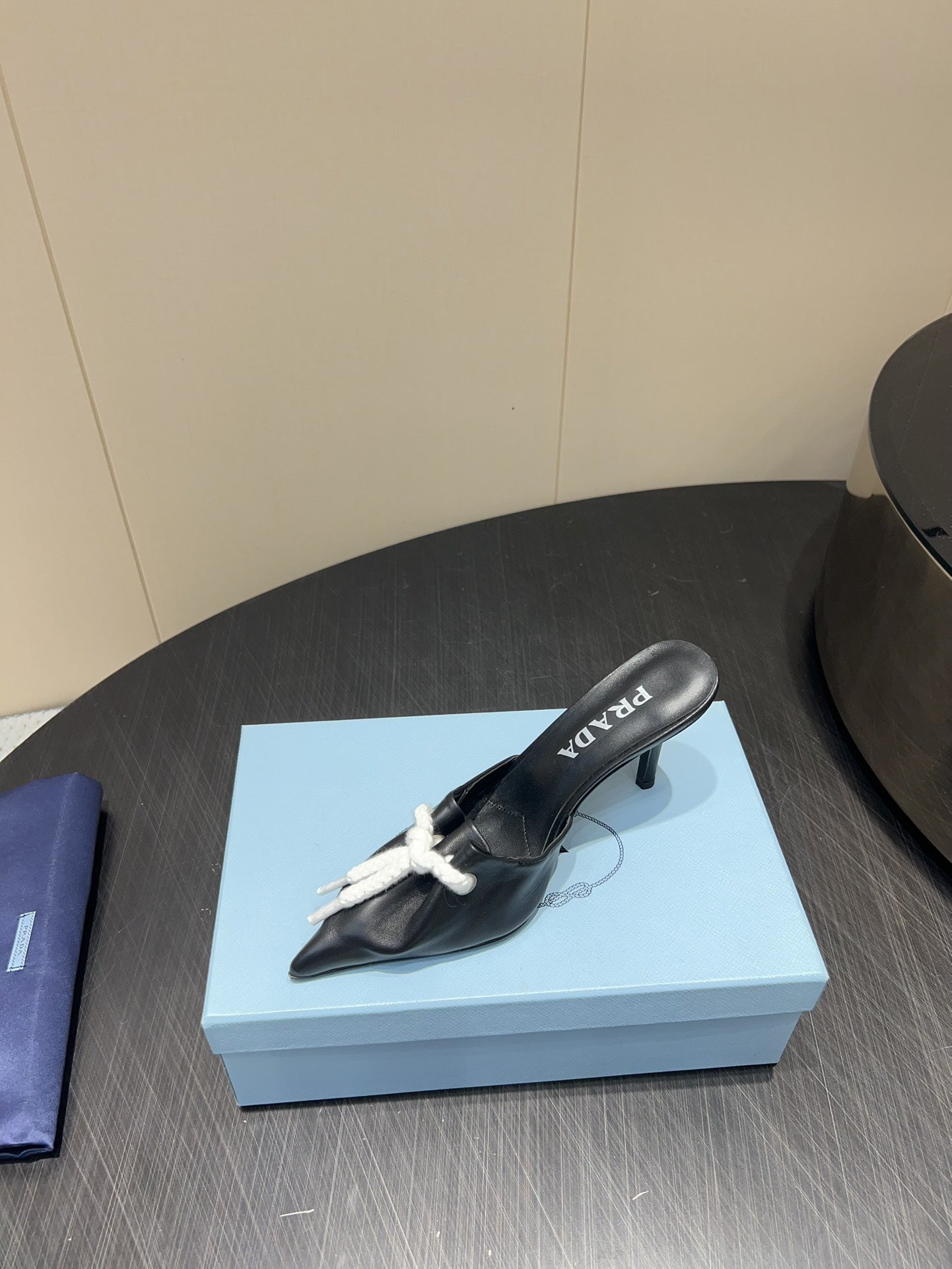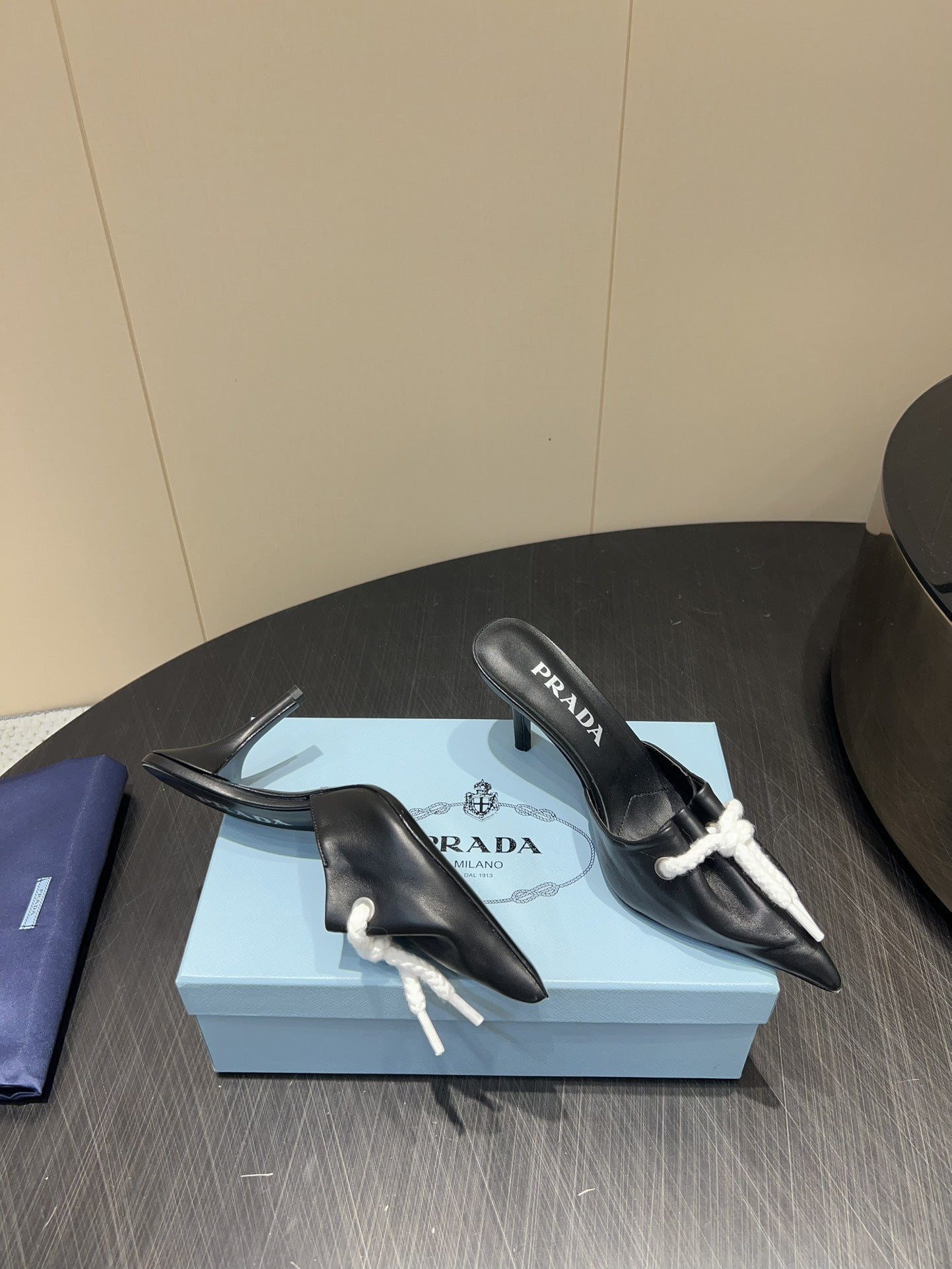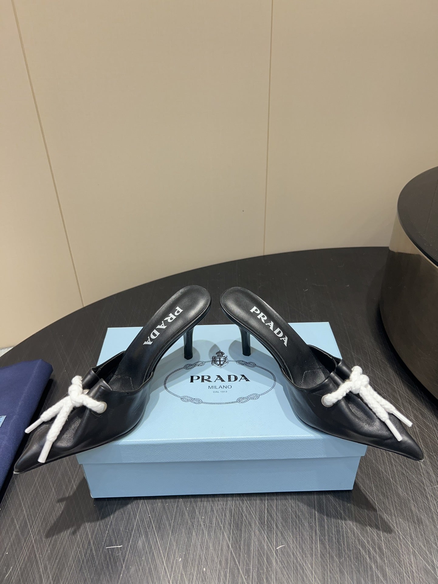 PRADA 25S BRAIDED DETAIL MULES 85MM IN BLACK CALFSKIN