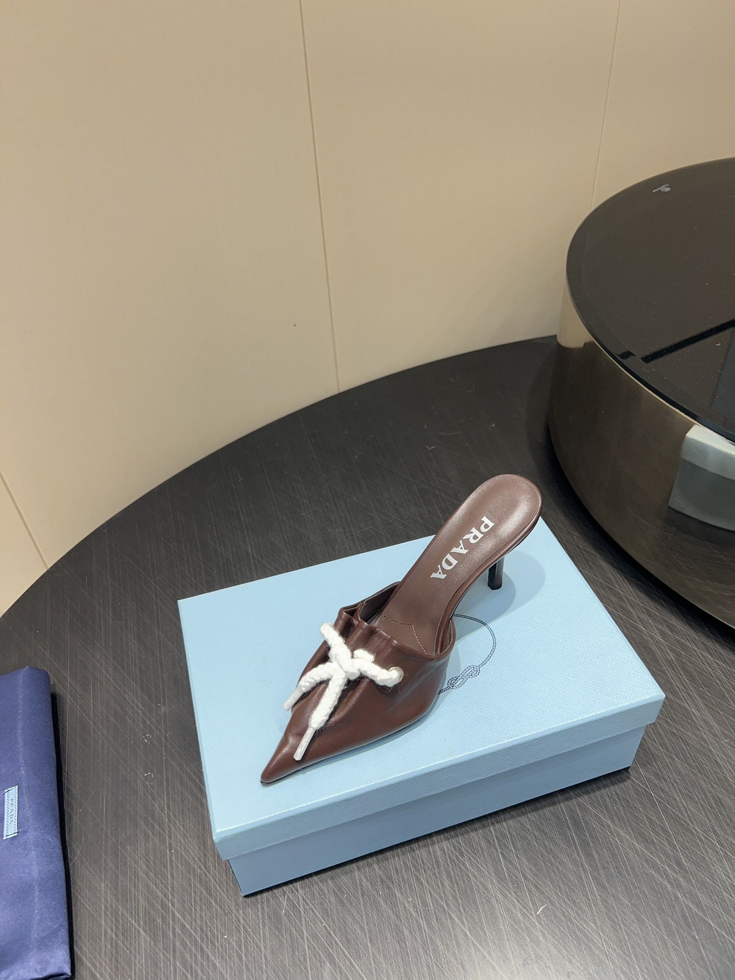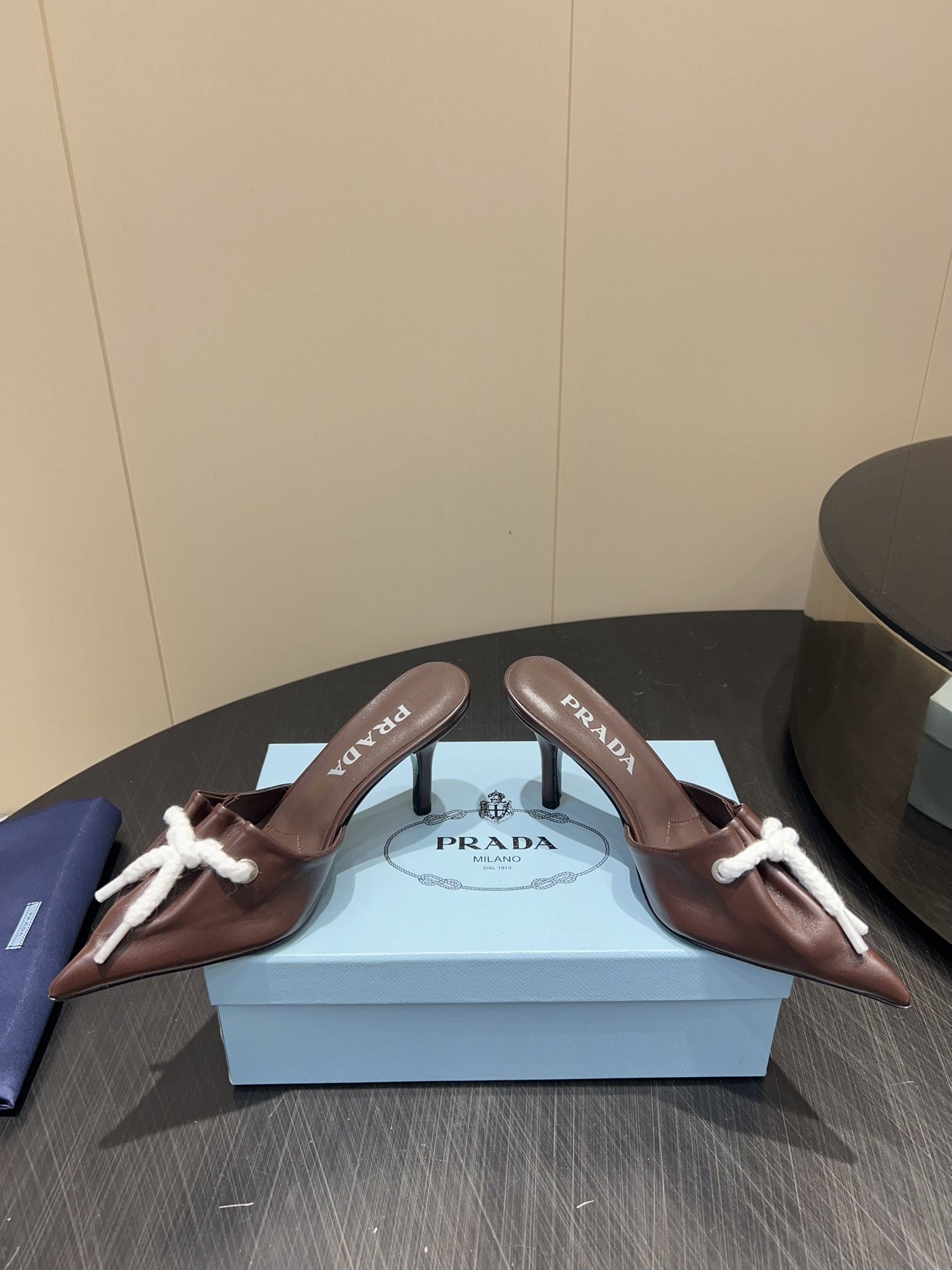 PRADA 25S BRAIDED DETAIL MULES 85MM IN DARK BROWN CALFSKIN