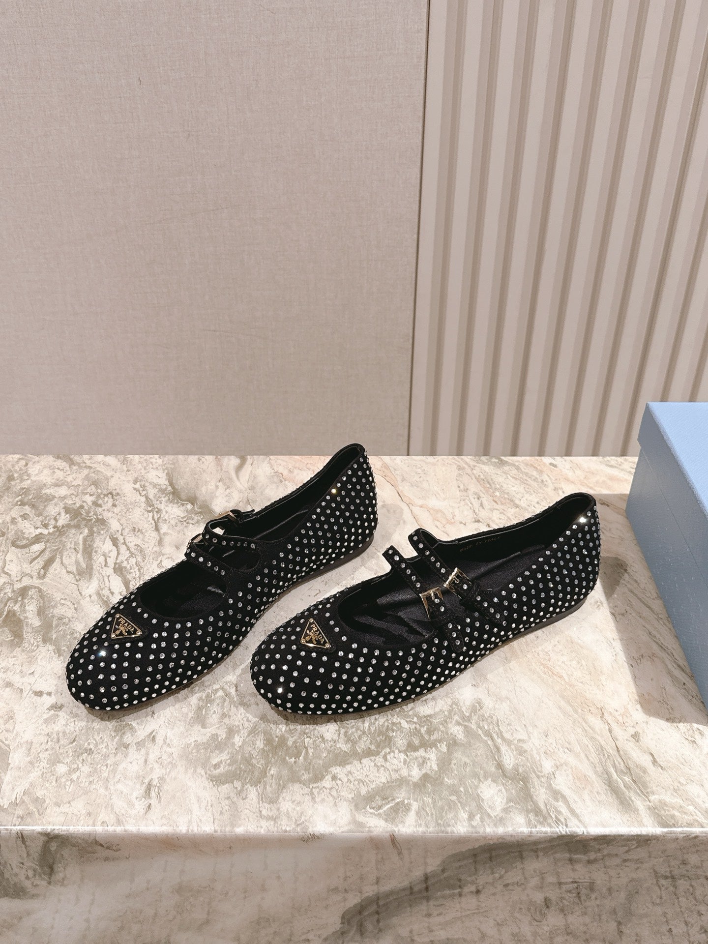 PRADA 25S CRYSTAL EMBELLISHED BALLERINA IN BLACK SUEDE