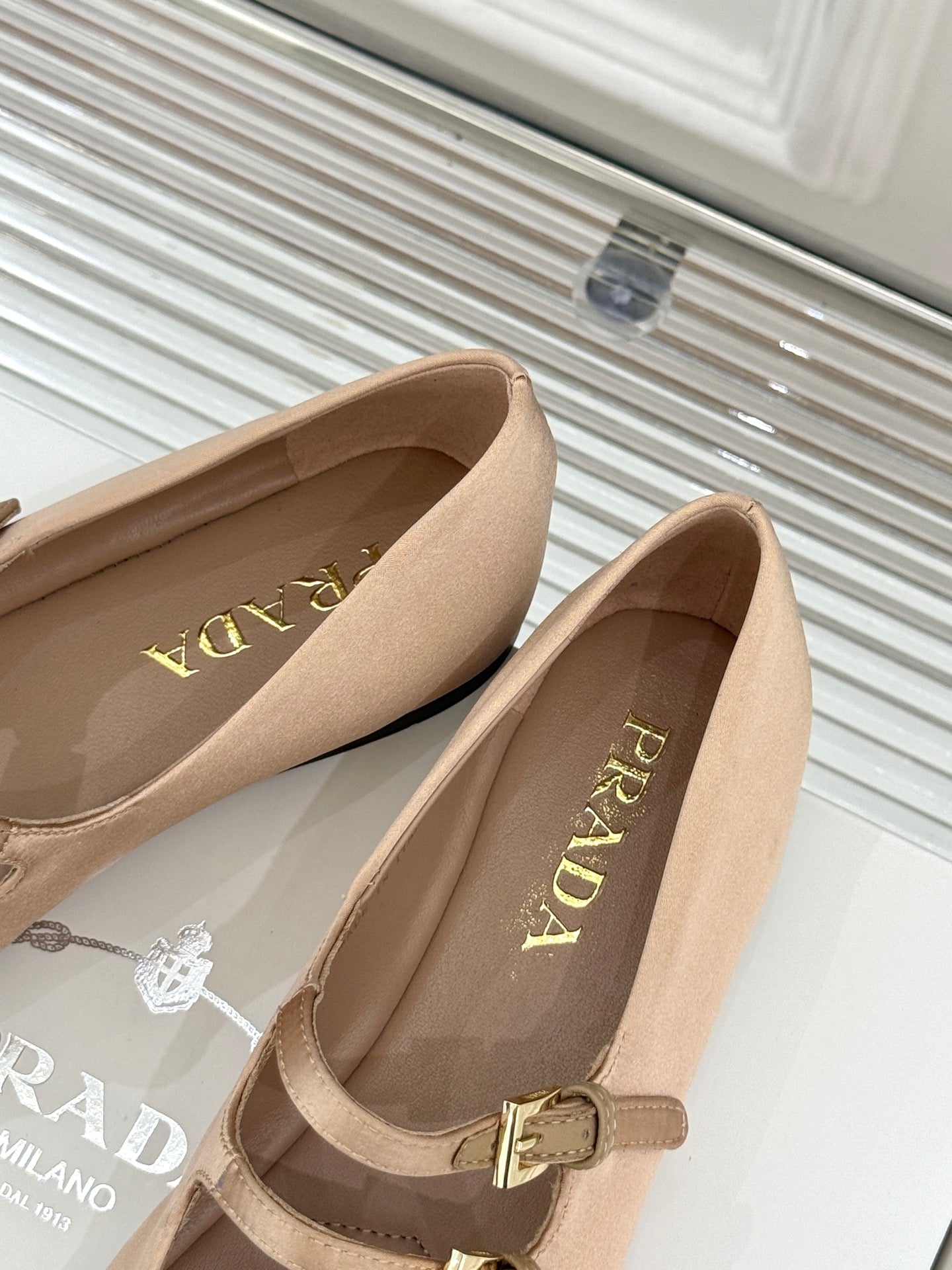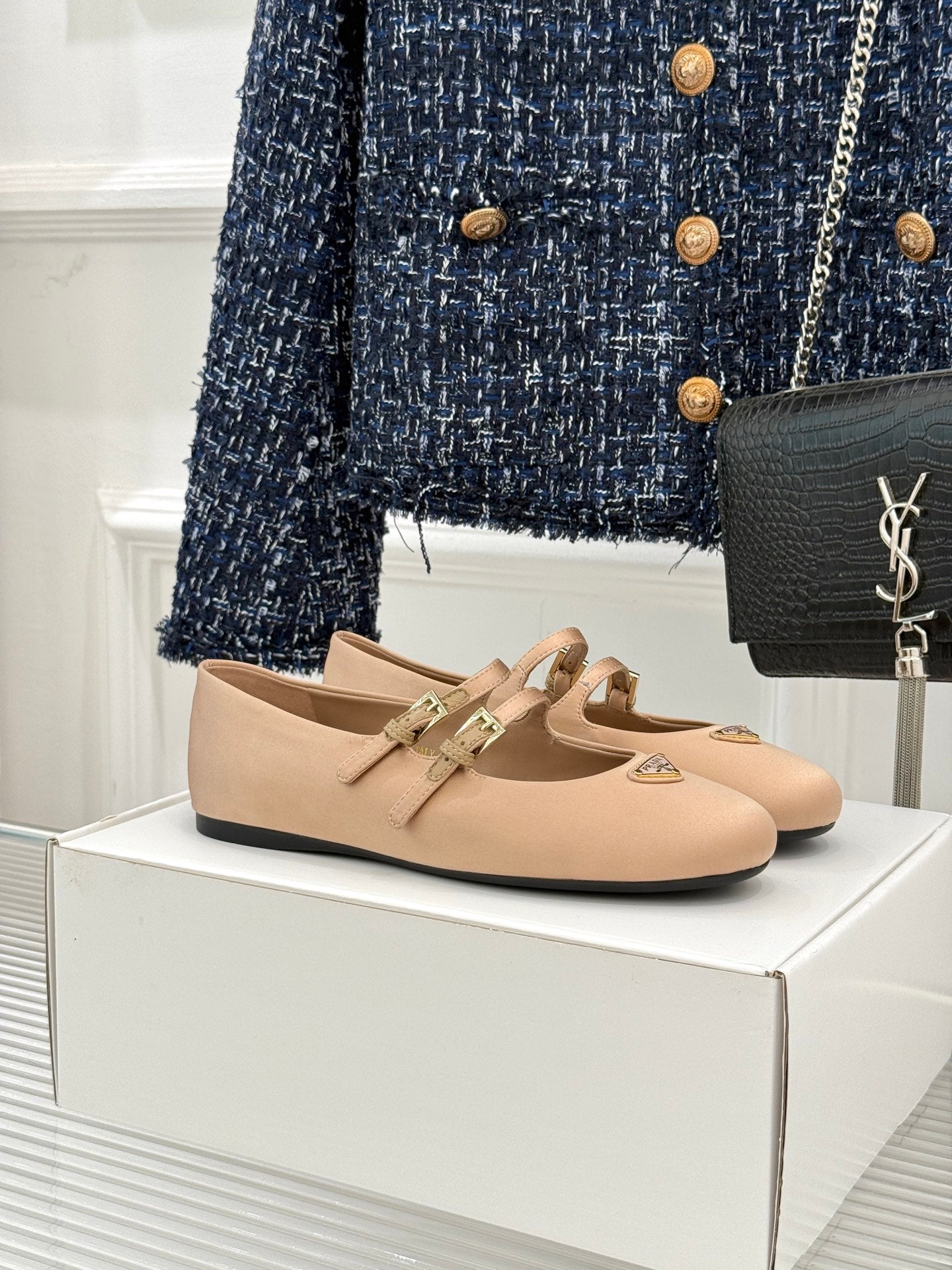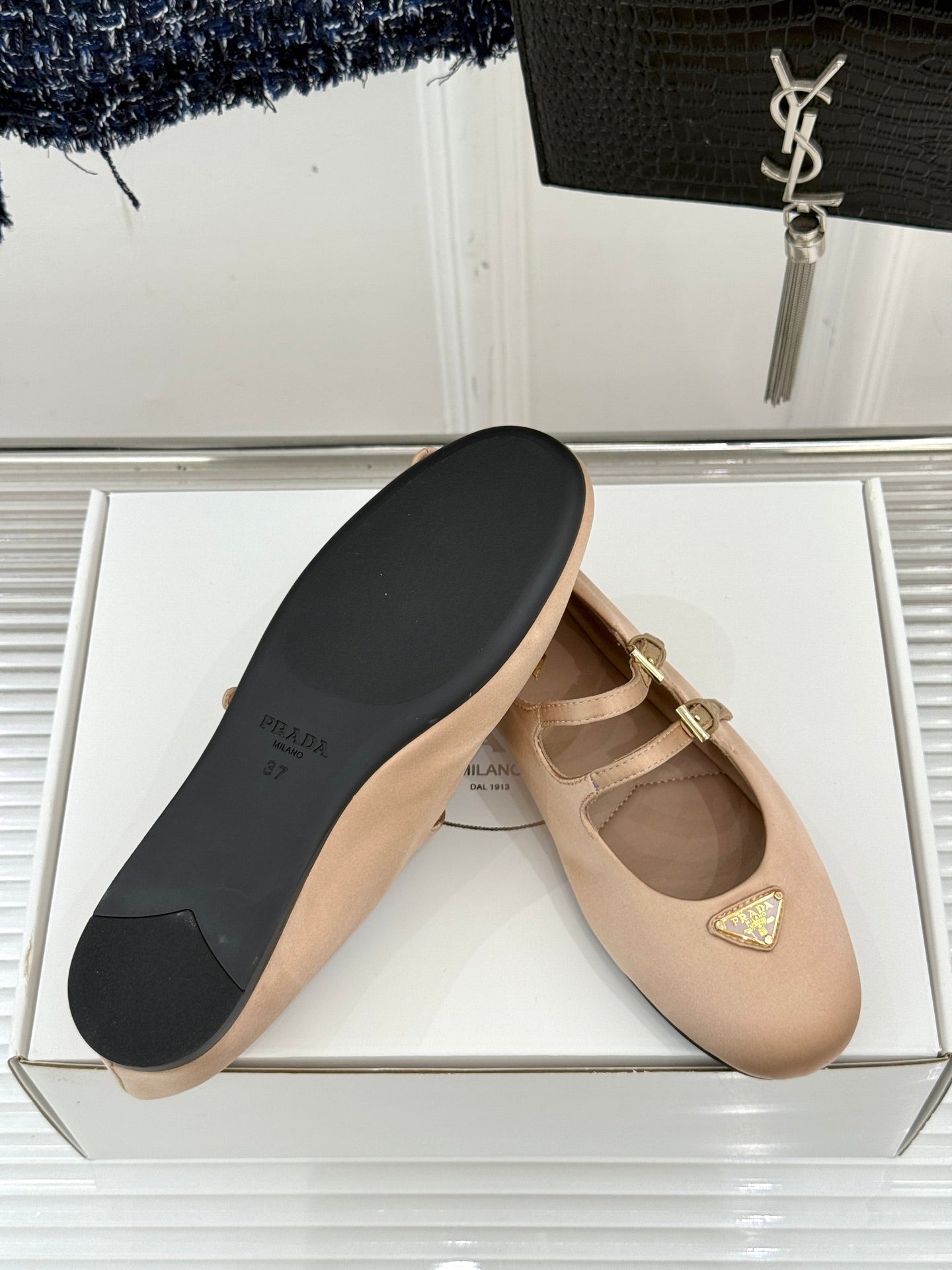 PRADA 25S DOUBLE STRAP BALLERINAS IN NUDE SATIN