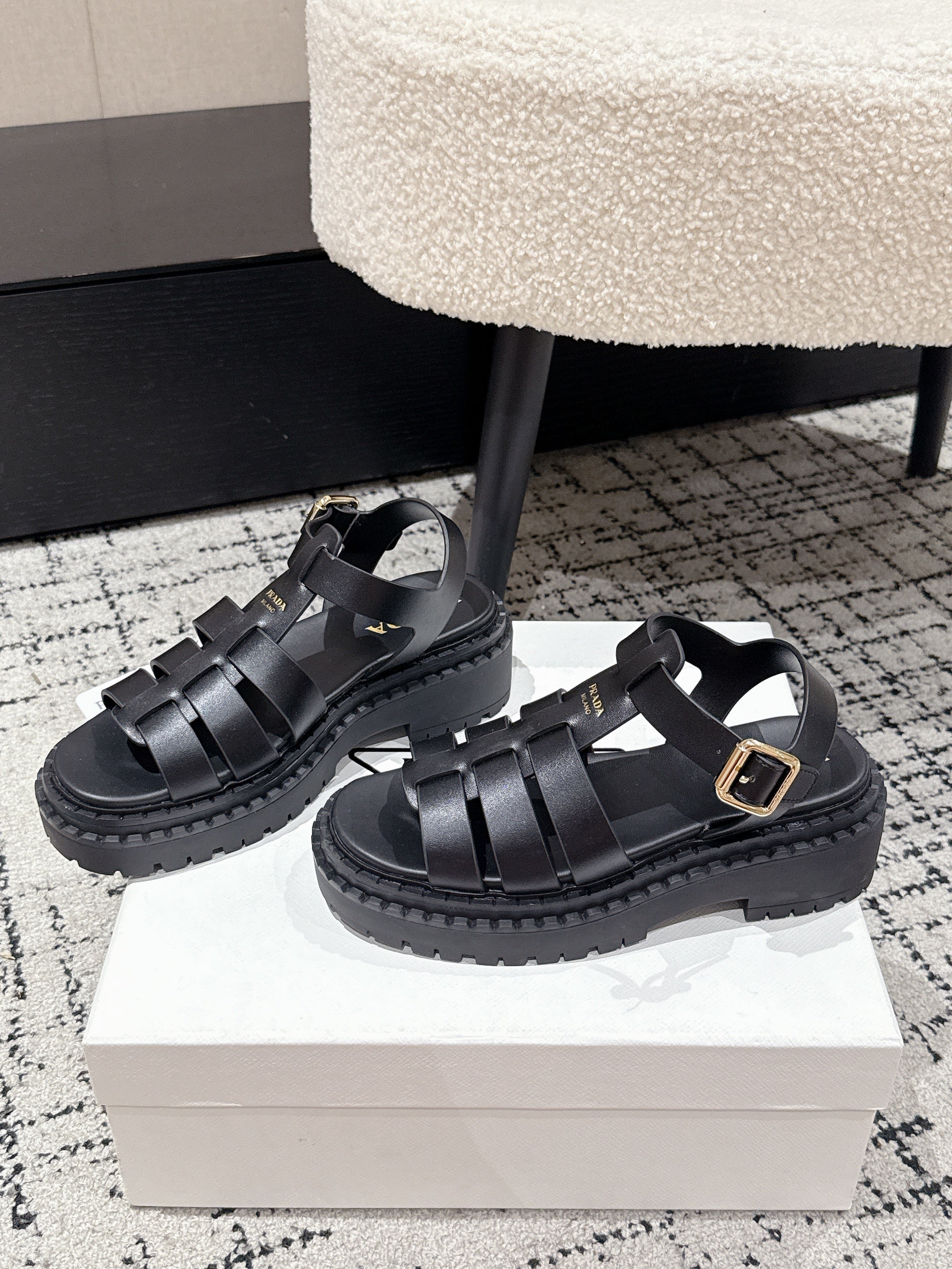 PRADA 25S FISHERMAN OPEN TOE SANDALS IN BLACK CALFSKIN