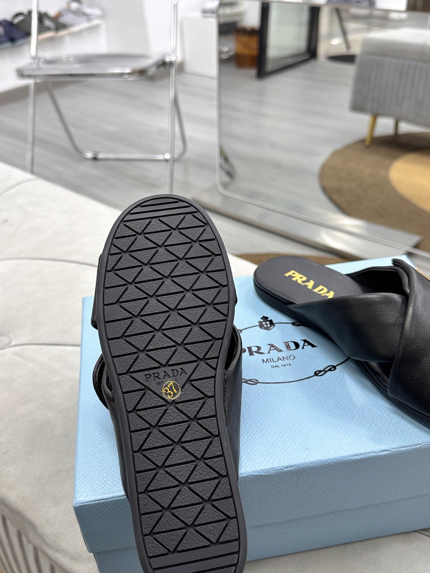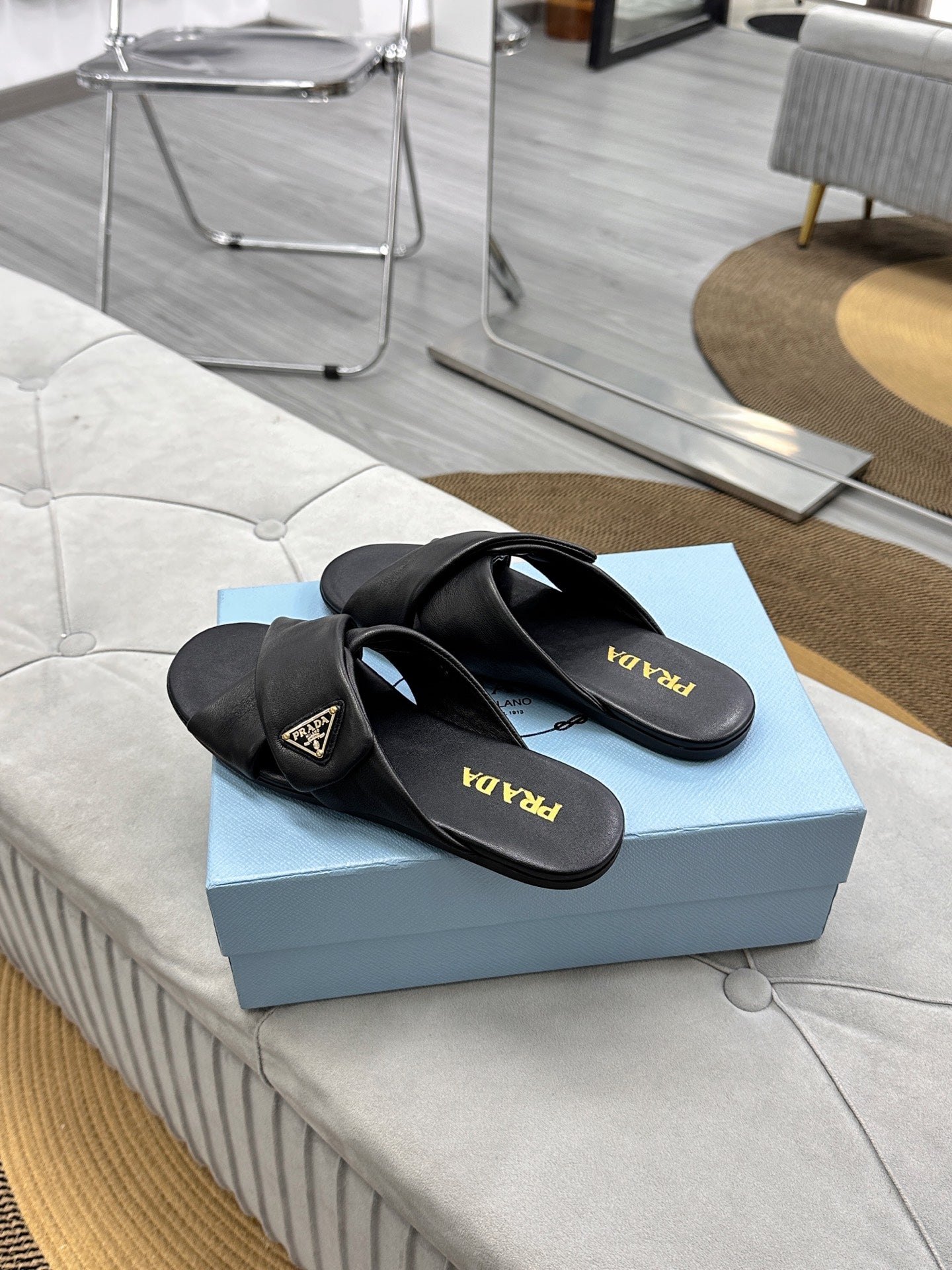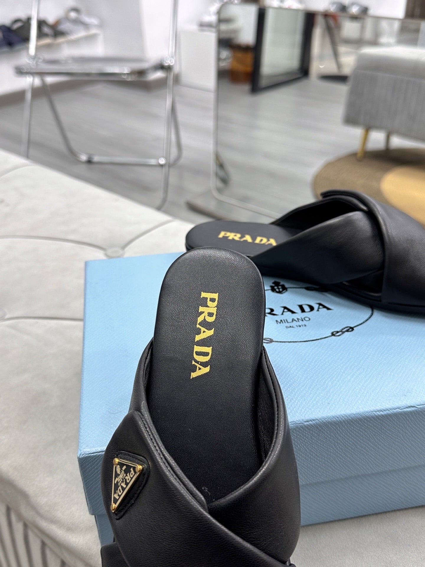 PRADA 25S SLIDE SANDALS IN BLACK CALFSKIN LOGO