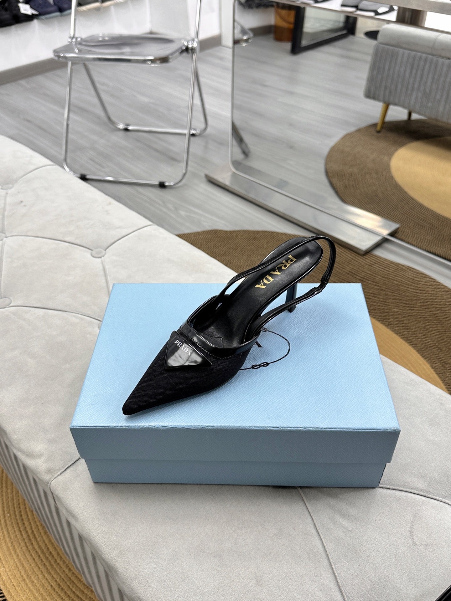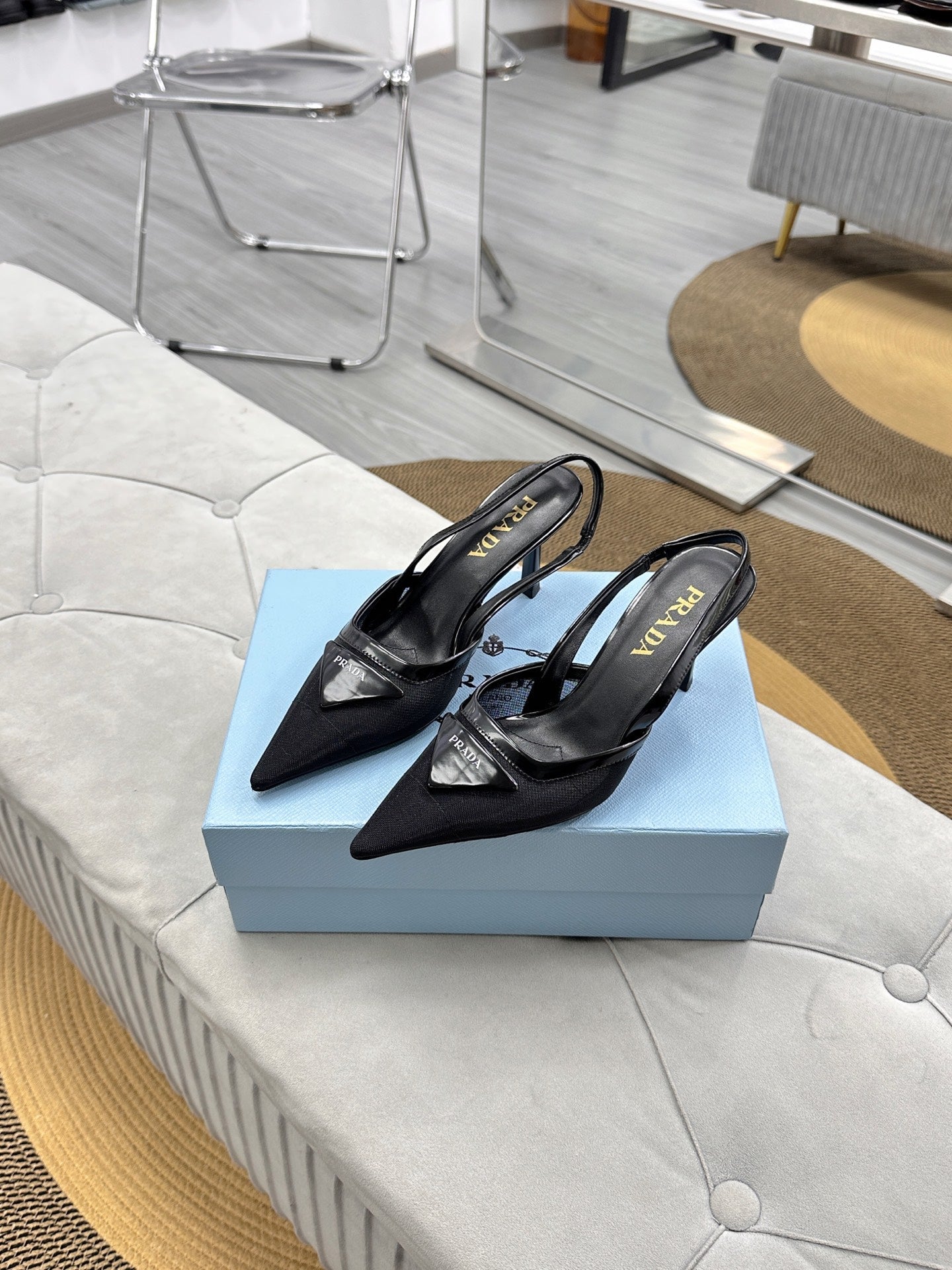 PRADA 25S TRIANGLE LOGO SLINGBACK PUMPS IN BLACK MESH FABRIC