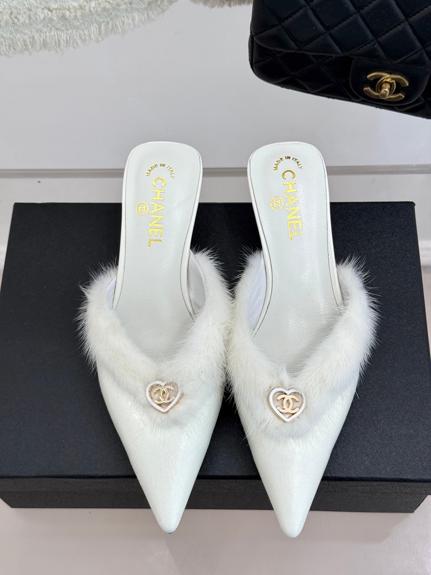 RABBIT FUR POINTED-TOE MULE IN WHITE LAMBSKIN