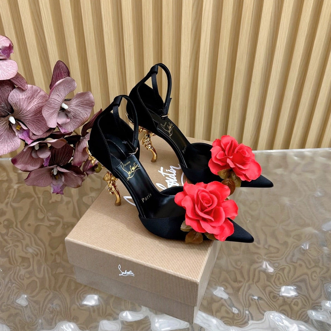 RED BELLAROSE STRAP PUMPS 110MM IN BLACK CREPE SATIN