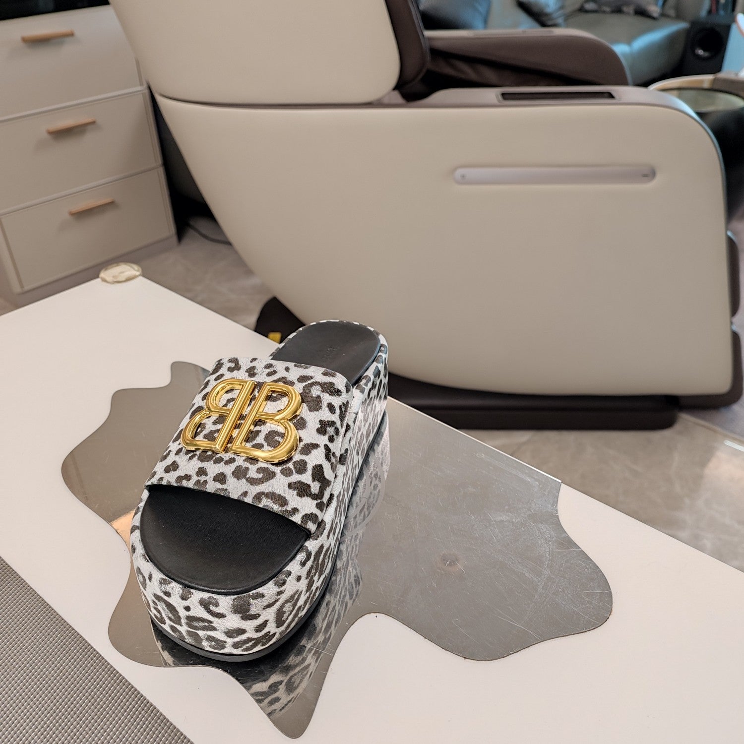 RISE SANDAL THICK-SOLED IN WHITE LEOPARD PRINT CALFSKIN