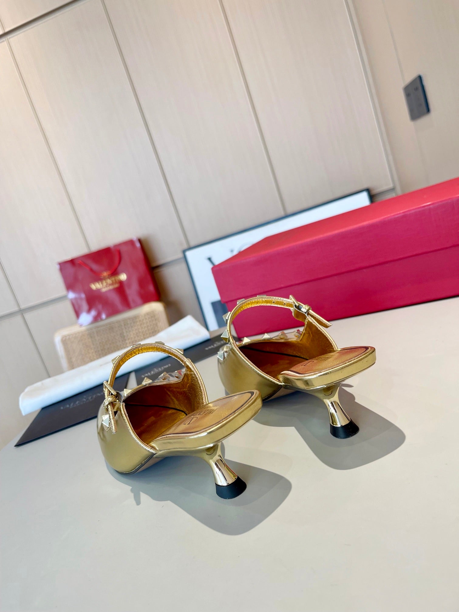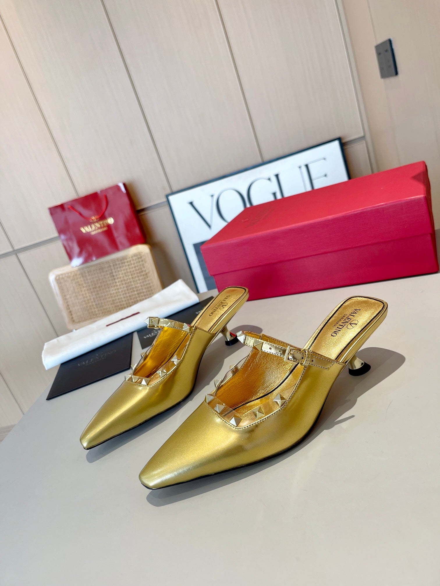 ROCKSTUD CAGED MULES 5 CM IN GOLD CALFSKIN