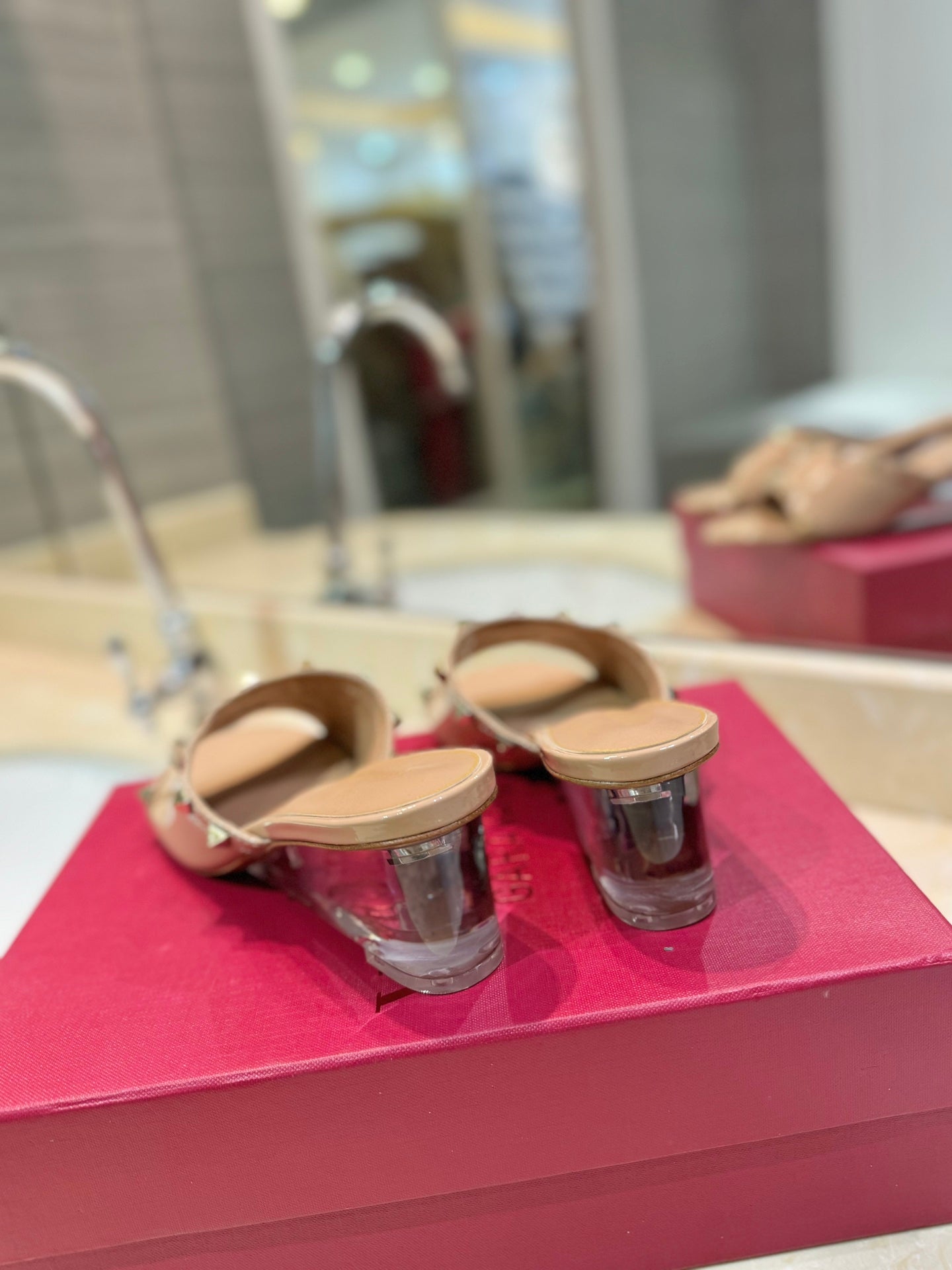 ROCKSTUD MULE SANDALS WITH TRANSPARENT HEEL IN SAND BROWN CALFSKIN