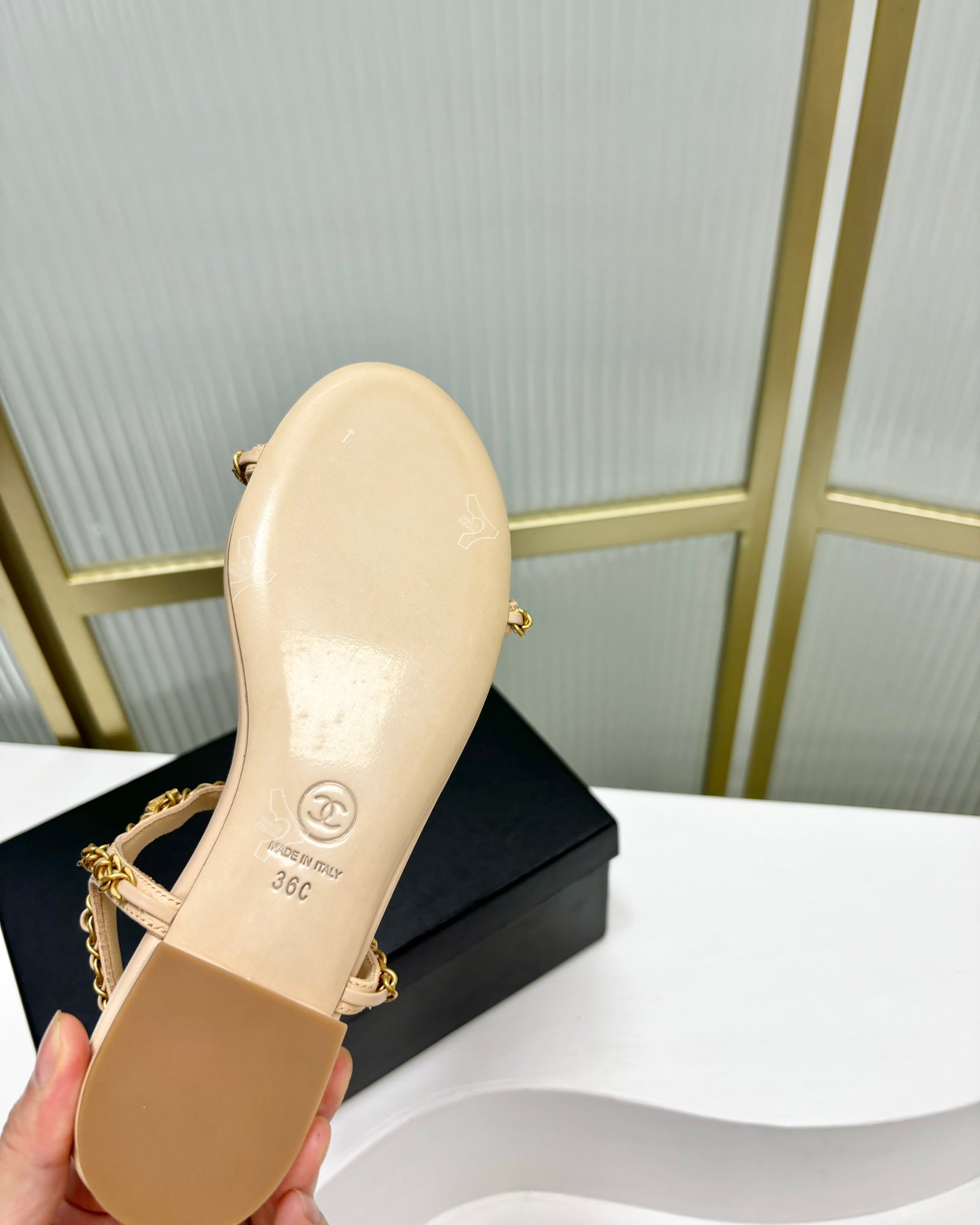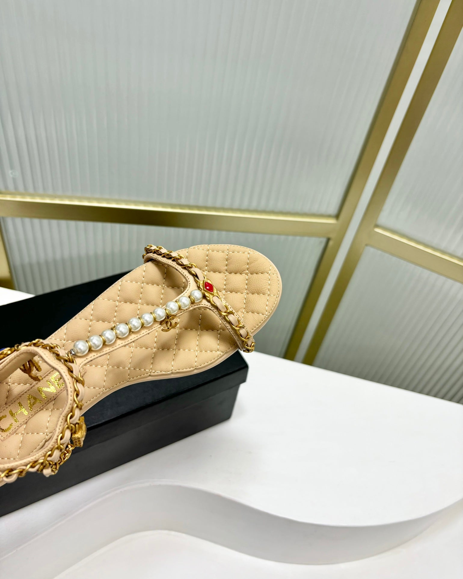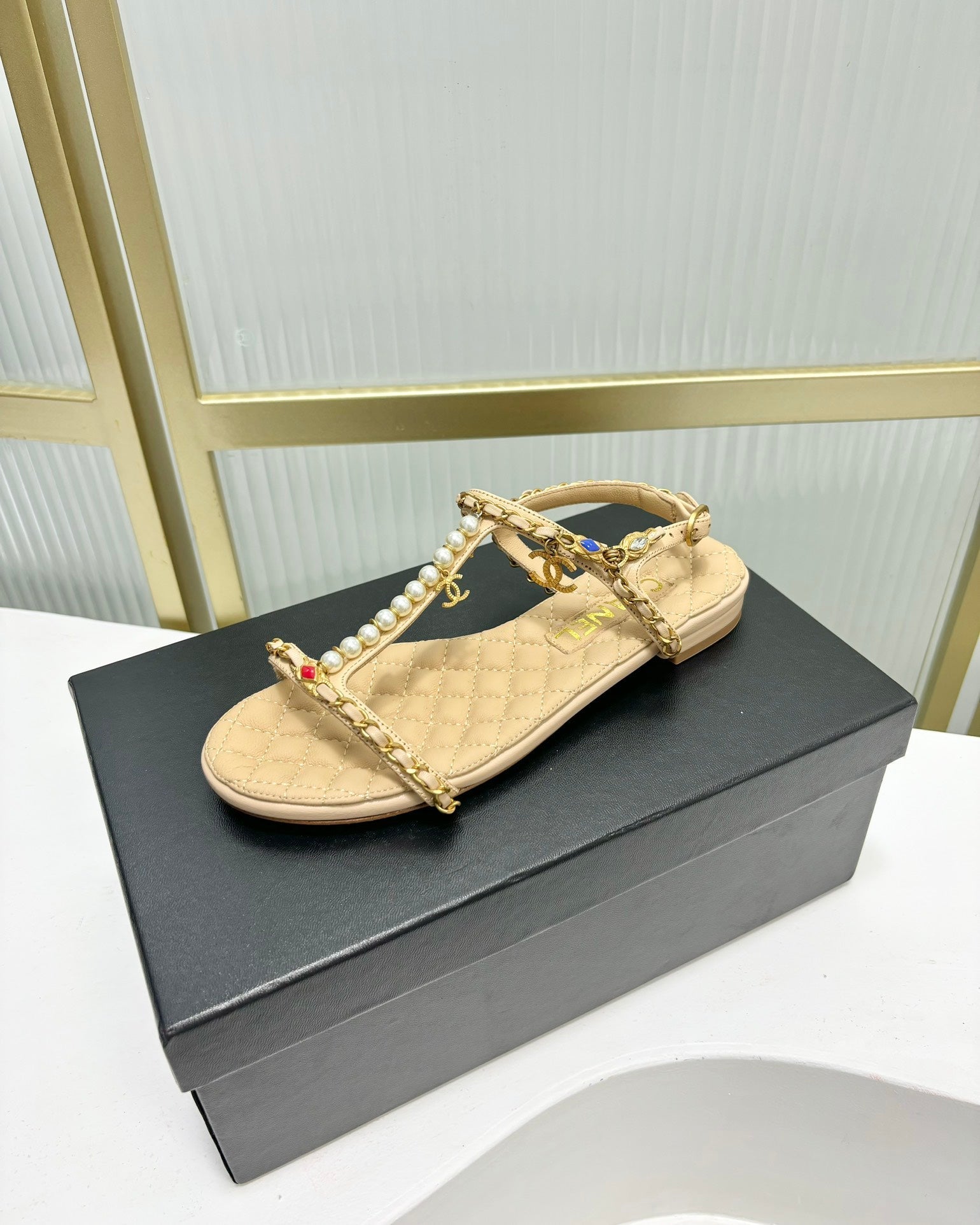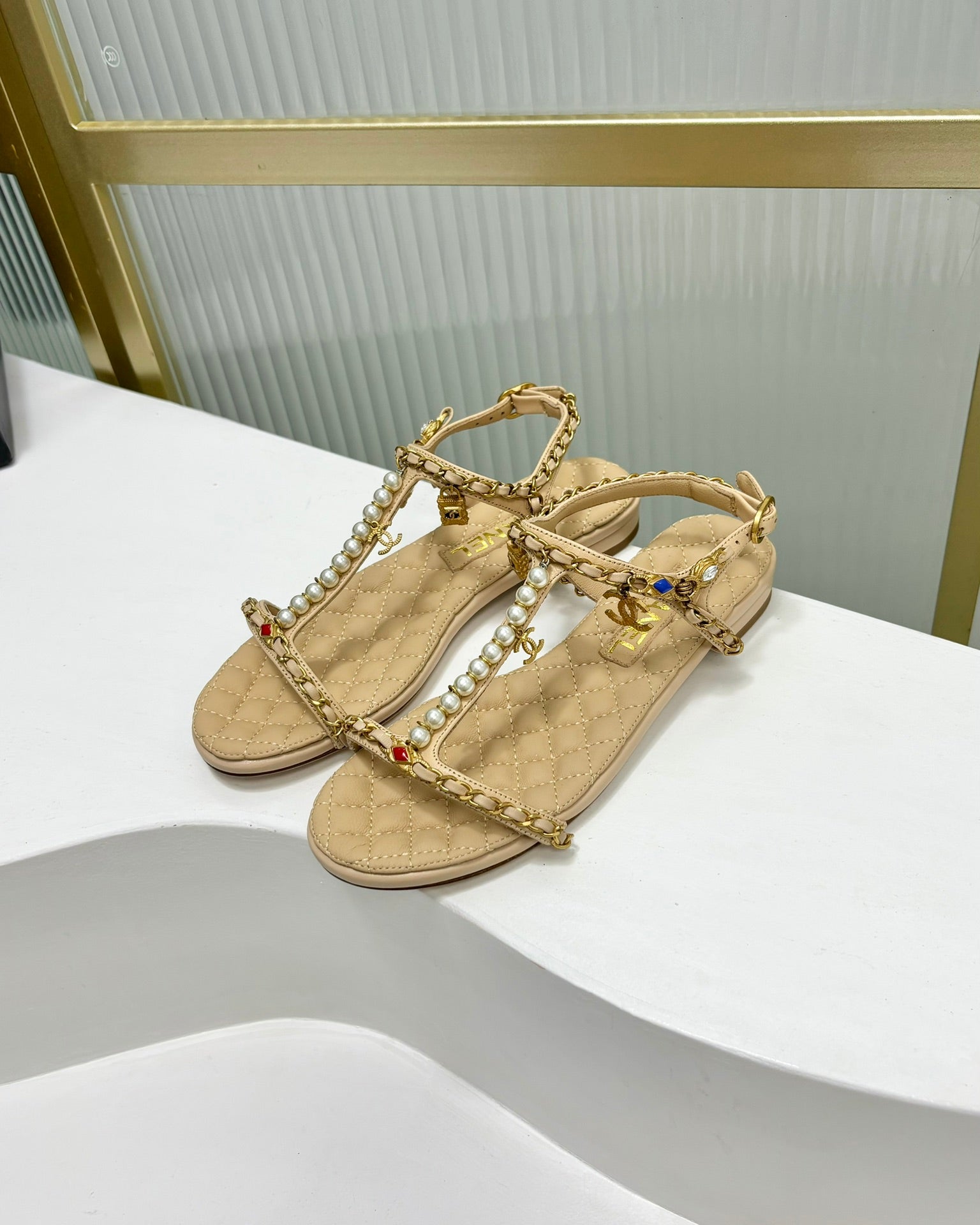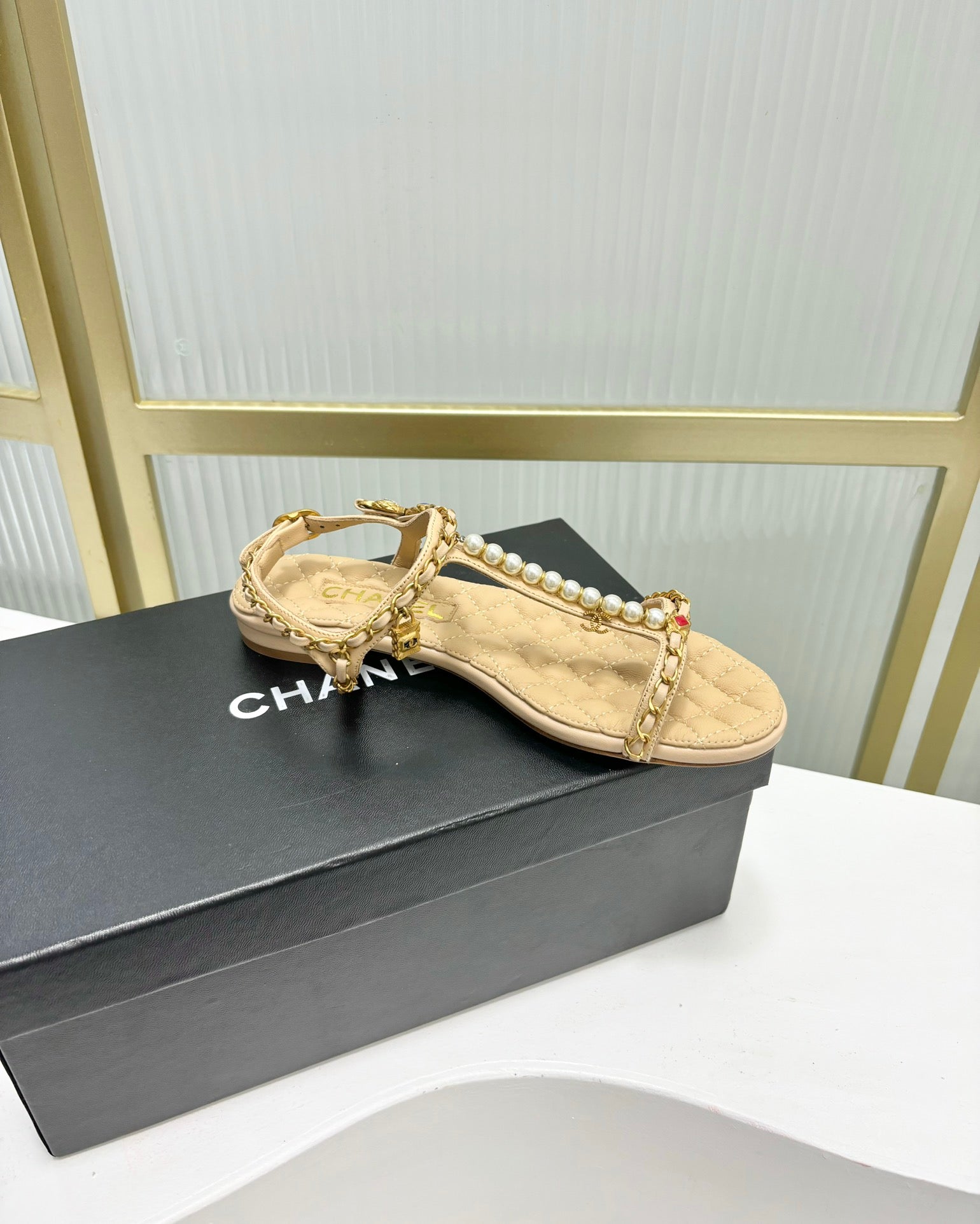 SANDALS PEARL CHAIN IN BEIGE CREAM COWHIDE