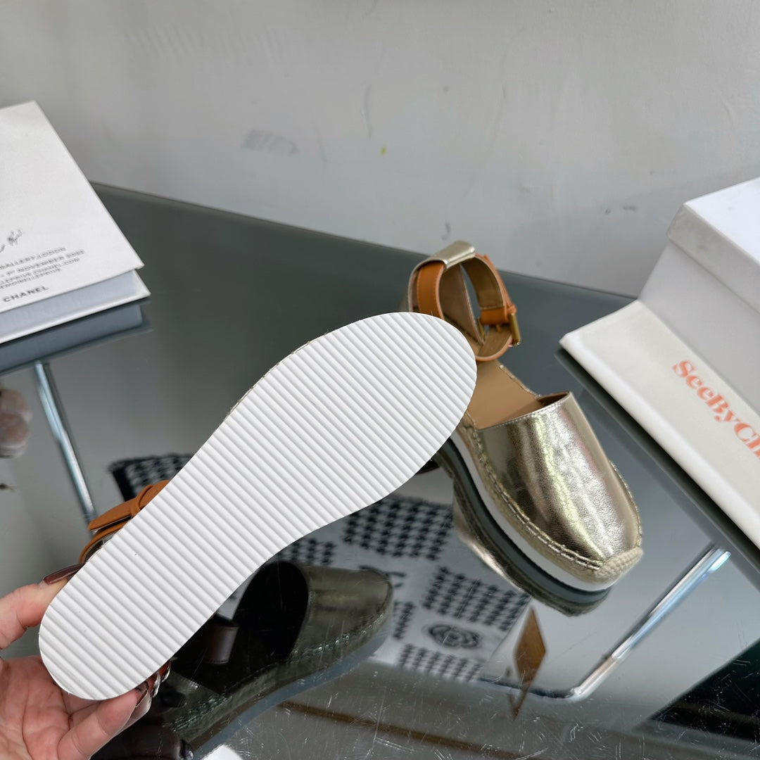 SEE BY ESPADRILLES SANDAL IN LIGHT GOLD CALFSKIN AND WOVEN RAFFIA
